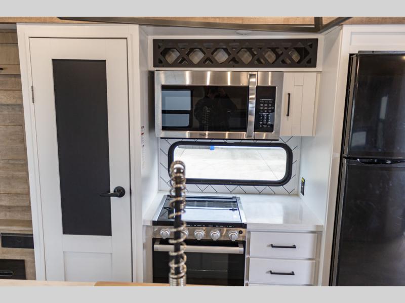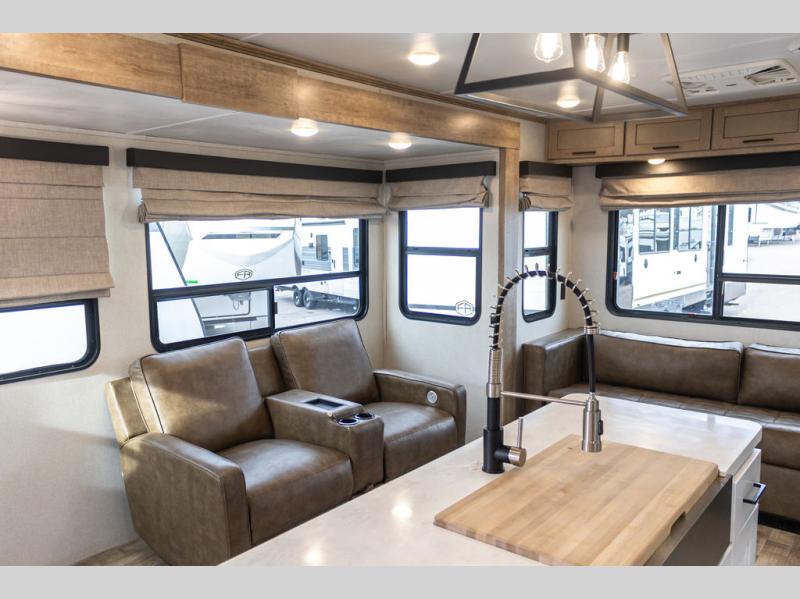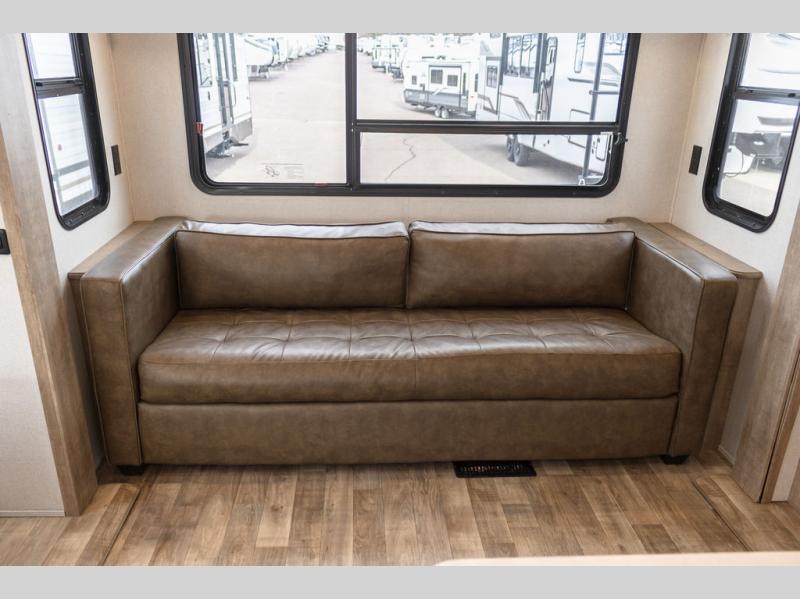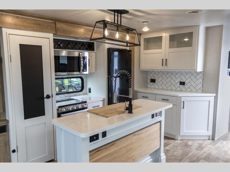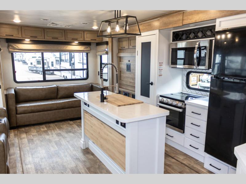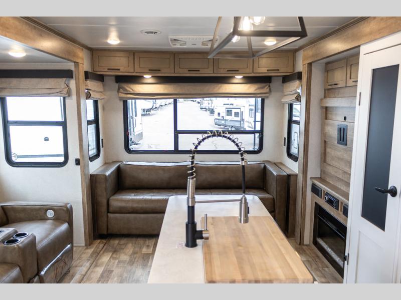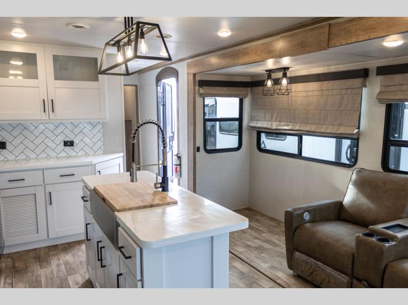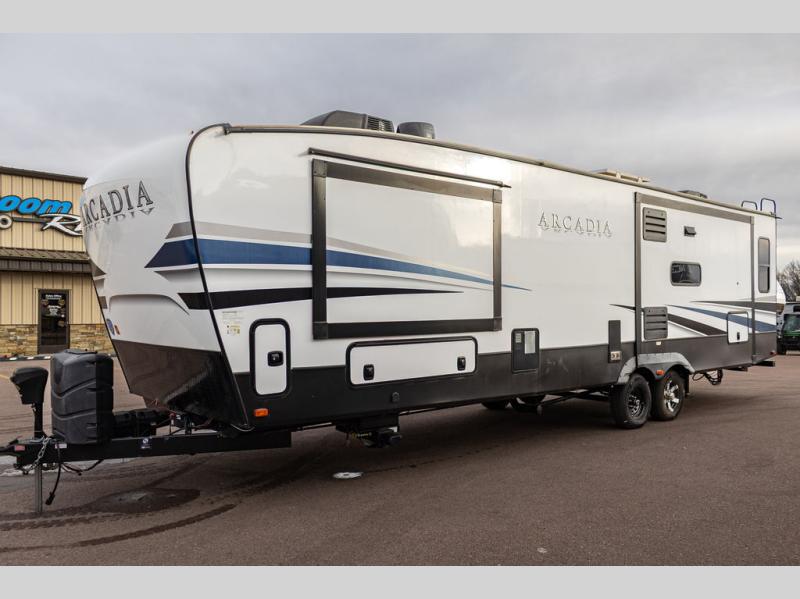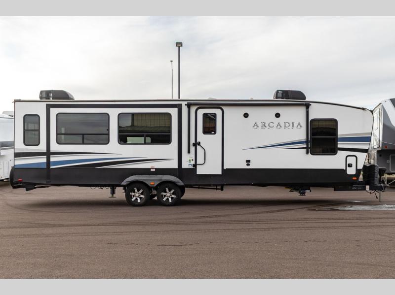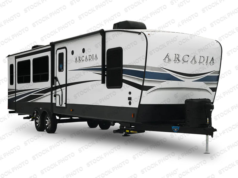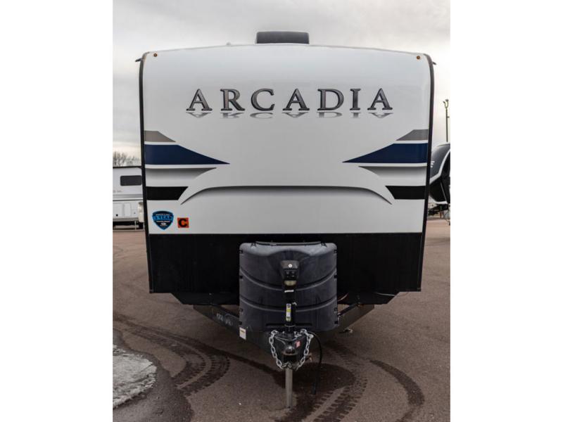 It's time to camp better with Keystone, and the Arcadia travel trailers and 3/4 ton fifth wheels allow you to do just that! There are many features that come standard you are sure to appreciate, like the Blade high-performance air flow system, the Tru-Fit slide construction, and the durable Hyper Deck flooring. Each model features the Curt Performance Package with HD axles with reinforced axle wall tube, HD forward self-adjusting brake assembly, a rubberized equalization suspension system, and more to create a smooth towing experience. You will enjoy an HD flat screen TV included with each model, plus there is a Winegard AIR 360 amplified omni-directional antenna and satellite and cable prep on all TV's to keep you entertained throughout your camping trips. The Arcadia kitchen features custom cabinetry with solid wood and painted cabinet doors, oversized drawers for maximum storage space, a stainless steel farmhouse style sink, plus many more comforts.