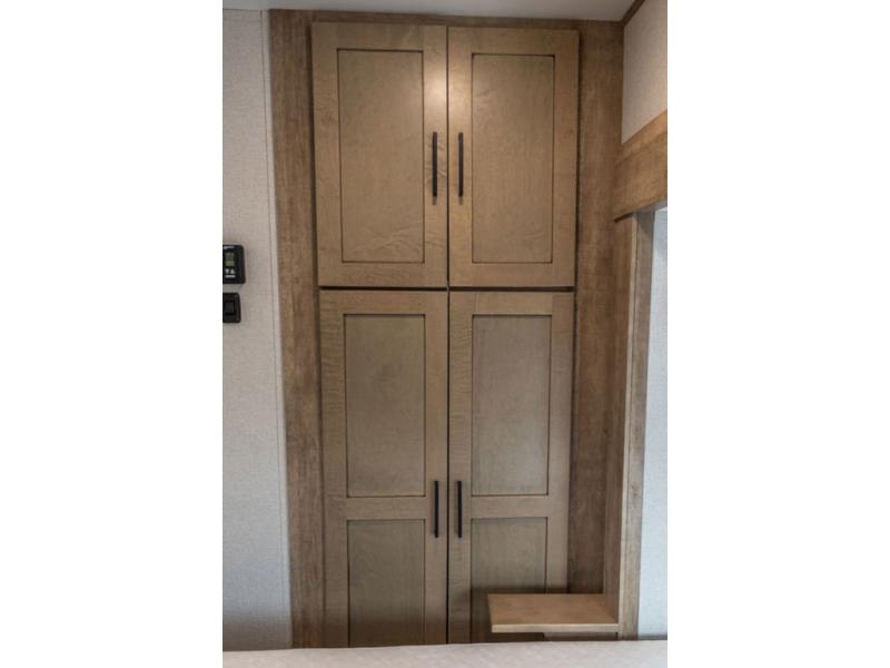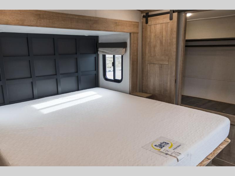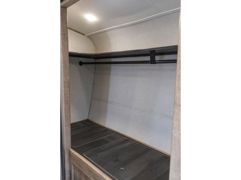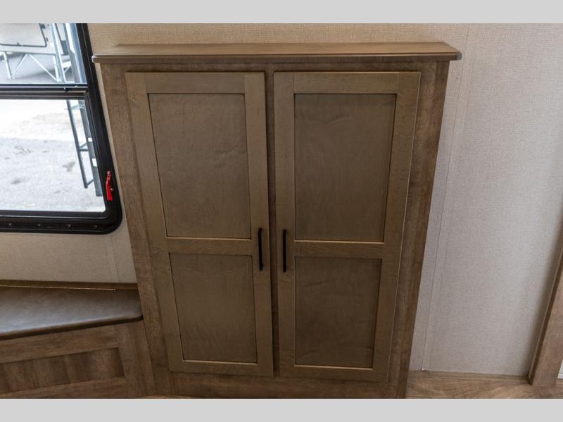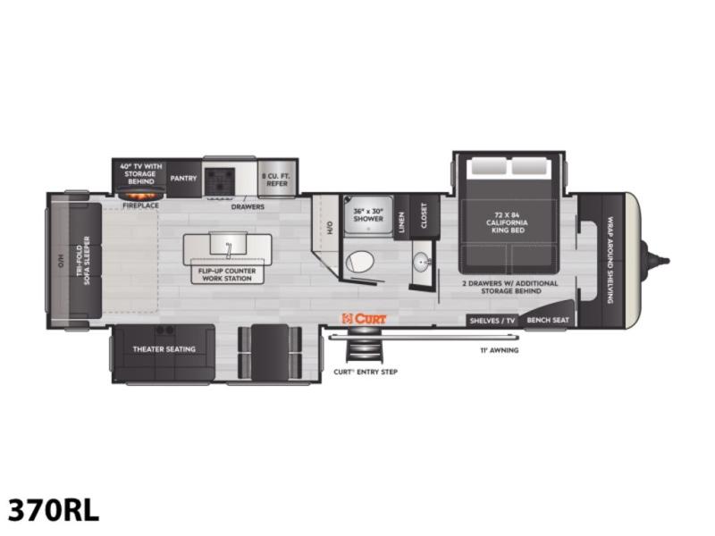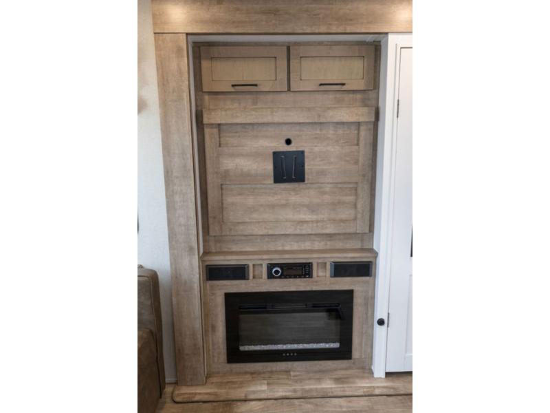 Camp in comfort with this travel trailer in tow! Once you arrive at the campground, set up the 11' power awning and enjoy a cold drink before heading out for the day. The chef of your group can prepare lunch at the kitchen island that includes a flip-up counter workstation, while the little ones play a game at the free-standing table. There is also theater seating here and a 40" TV with a fireplace for those cooler fall evenings. When it's time to call it a night, you will love the slide out California king bed with two drawers underneath, plus additional storage behind the drawers. There is a walk-in closet with wrap-around shelving, plus a bench seat and even more shelves for all your valuables.