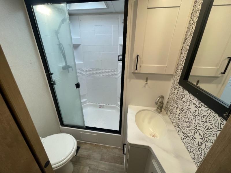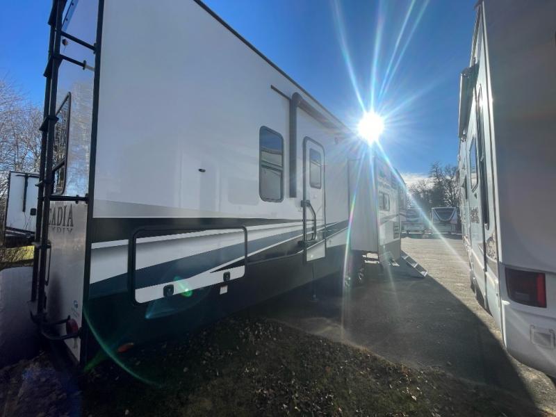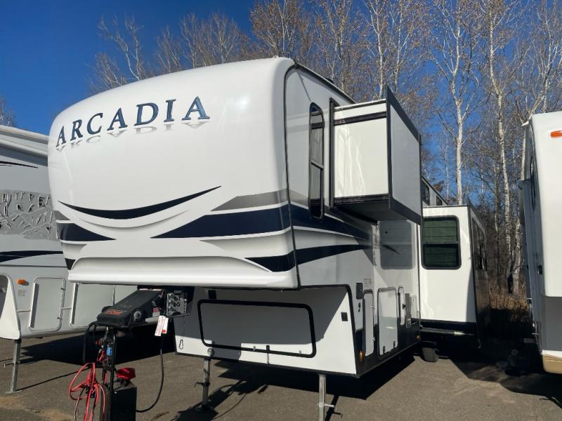 It's time to camp better with Keystone, and the Arcadia travel trailers and 3/4 ton fifth wheels allow you to do just that! There are many features that come standard you are sure to appreciate, like the Blade high-performance air flow system, the Tru-Fit slide construction, and the durable Hyper Deck flooring. Each model features the Curt Performance Package with HD axles with reinforced axle wall tube, HD forward self-adjusting brake assembly, a rubberized equalization suspension system, and more to create a smooth towing experience. You will enjoy an HD flat screen TV included with each model, plus there is a Winegard AIR 360 amplified omni-directional antenna and satellite and cable prep on all TV's to keep you entertained throughout your camping trips. The Arcadia kitchen features custom cabinetry with solid wood and painted cabinet doors, oversized drawers for maximum storage space, a stainless steel farmhouse style sink, plus many more comforts.