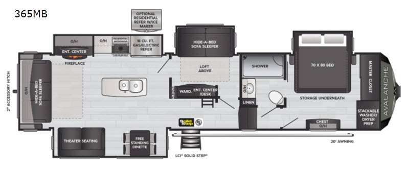 With any Keystone luxury full-profile Avalanche fifth wheel, you can experience wide-body construction that allows you to stretch out and stay awhile during any season thanks to the Polar Pack All Season Protection that includes a heated and enclosed underbelly, an Astro foil reflective layer on the roof, front and rear walls, and two static attic vents, plus more! The interior offers grained soft gray wood throughout and polished natural stone solid surface countertops, plus your choice of modern interior design. There are many more Keystone exclusives, plus standard and optional features that will allow you to choose the perfect RV for you!