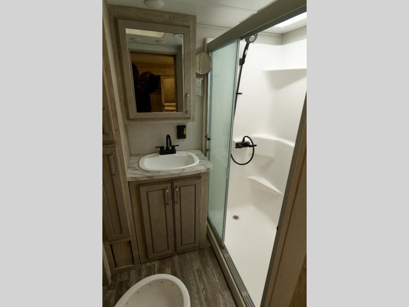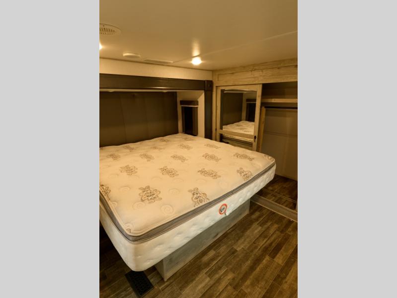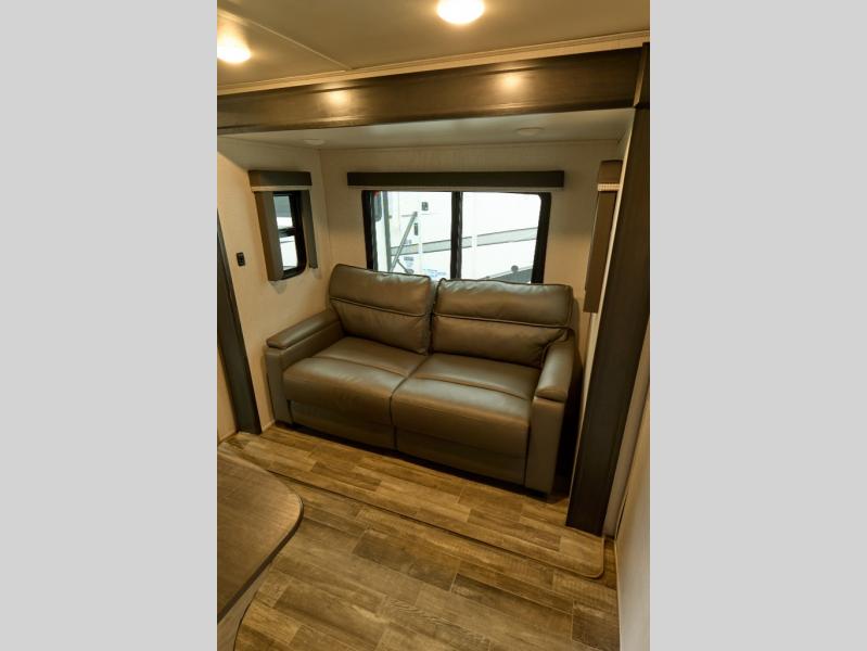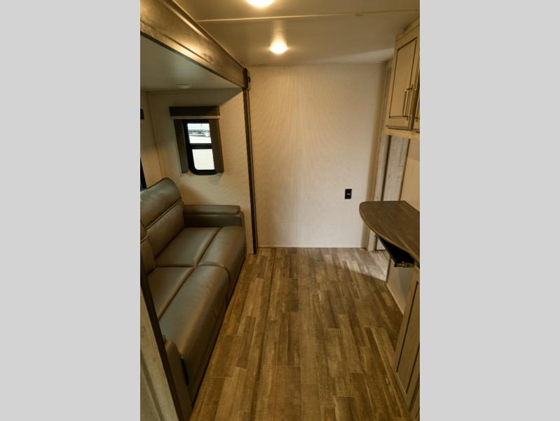 Whether you decide to live in this fifth wheel or travel for long weekends you will love the master suite with its own entrance into the bathroom, a king-size bed, and a master closet, plus a place to add a washer/dryer option. You will find a sofa sleeper, a wardrobe, and a desk in the additional private bedroom that is located just below the loft area allowing you to utilize this room as you wish. You will also love the wide-open kitchen and living area where you can gather together to watch the 50" LED TV, play games on the free-standing table with chairs, or stand around the kitchen island eating food and talking about your adventures.