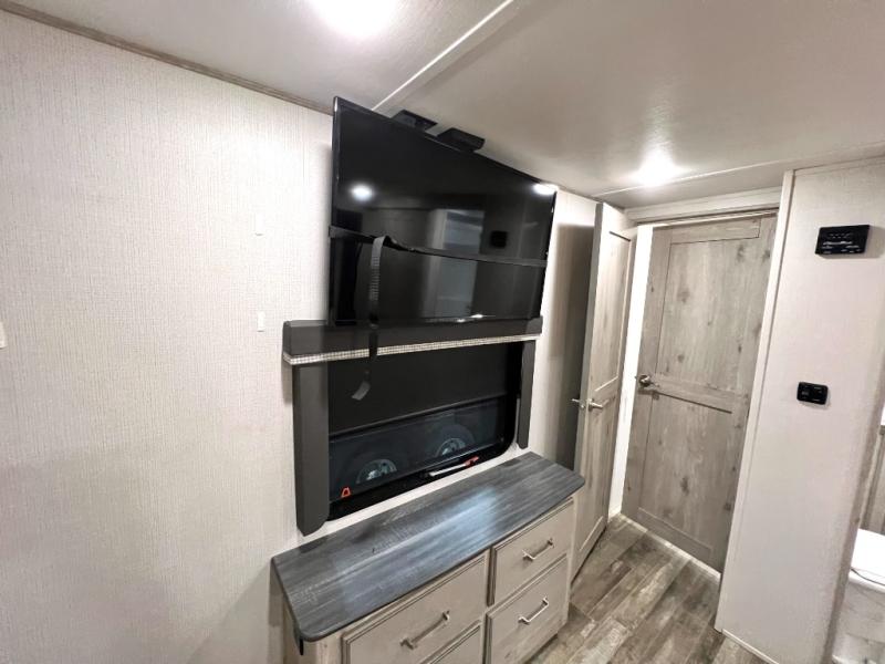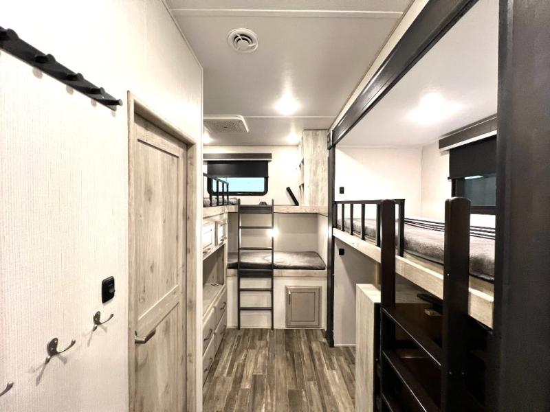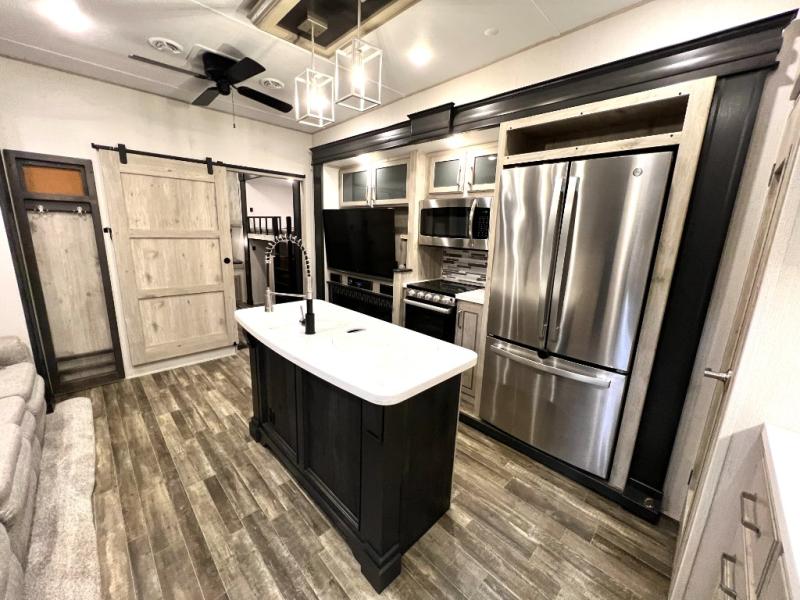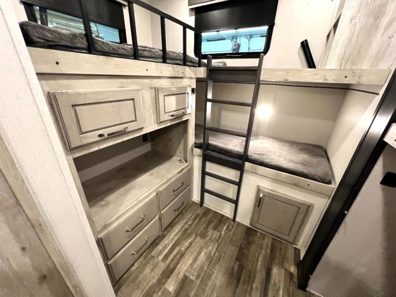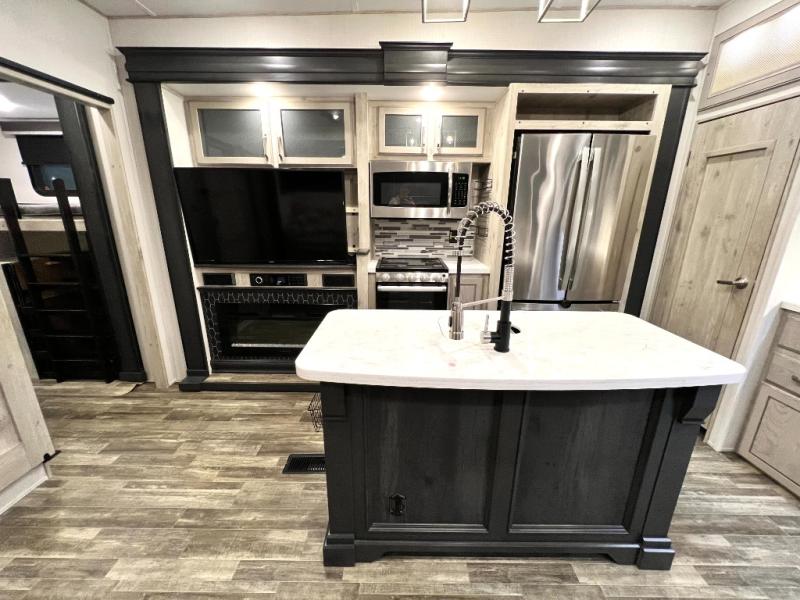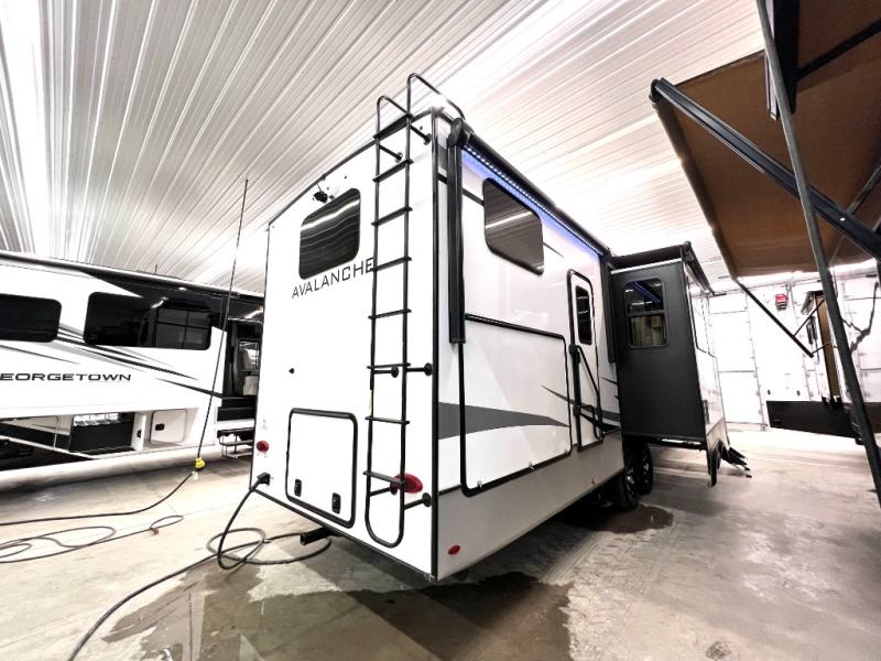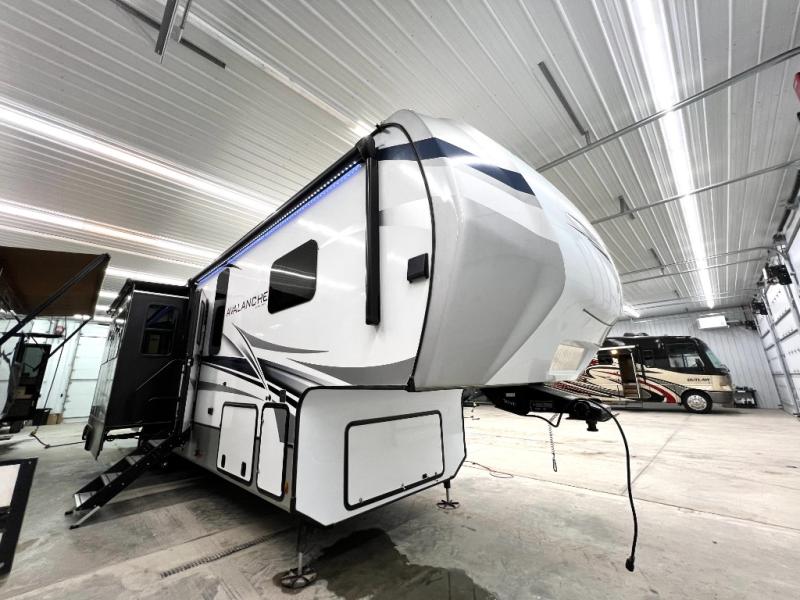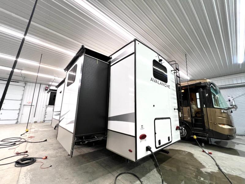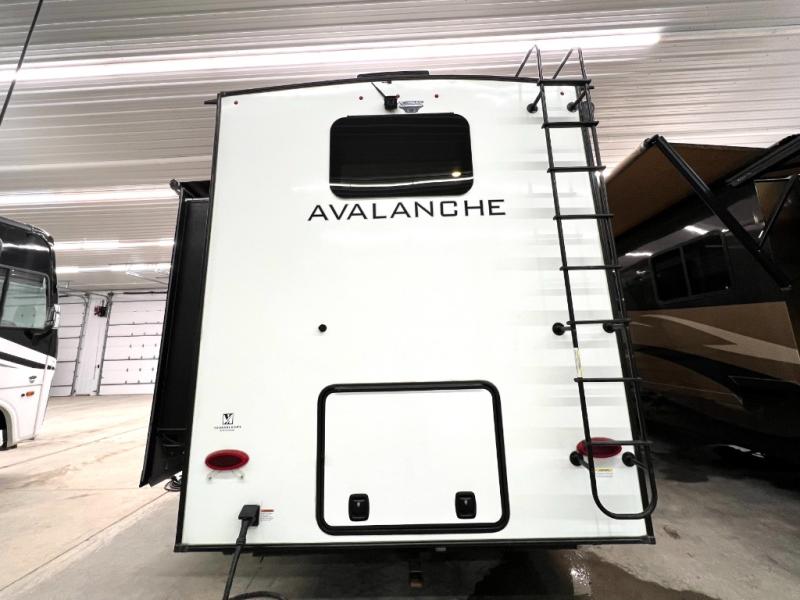 You won't believe how many extravagant details have been included in this Avalanche fifth wheel! Traveling with guests or extended family will be easy to do with the separate bunkhouse suite and master suite. Since the master suite has its own master closet and entrance into the full bathroom, and the bunkhouse contains its very own half bathroom, everyone will have their own private space to get ready each morning. On top of that, you will also be able to choose where you want to prepare and cook each day's meals with both a spacious indoor kitchen with full amenities, plus an outdoor kitchen. There is even an outdoor entertainment center with TV. You can also add an option or two such as a washer/dryer and/or a residential refrigerator. And there is so much more to love about this fifth wheel!