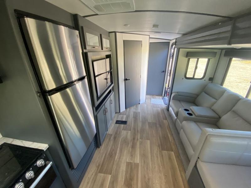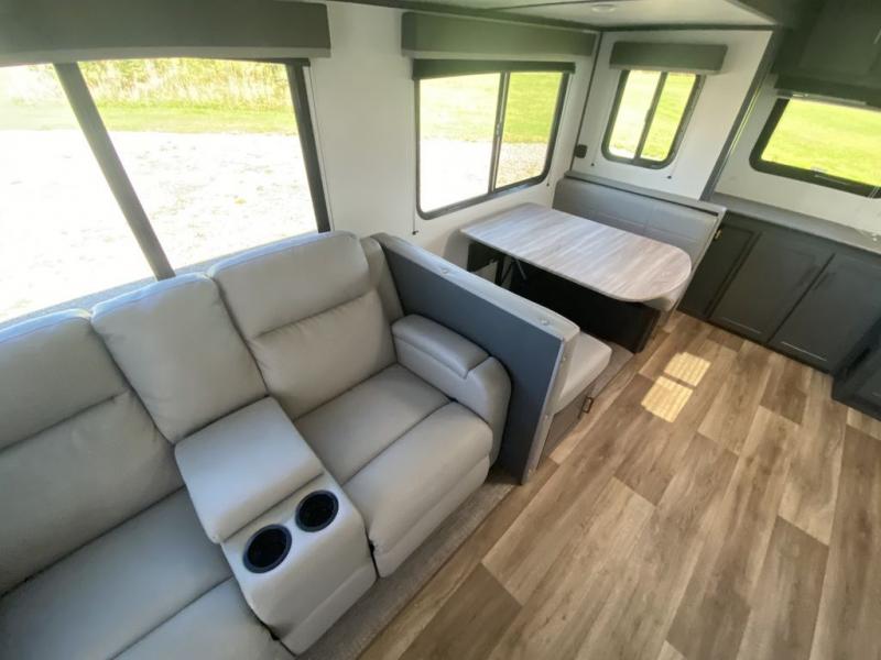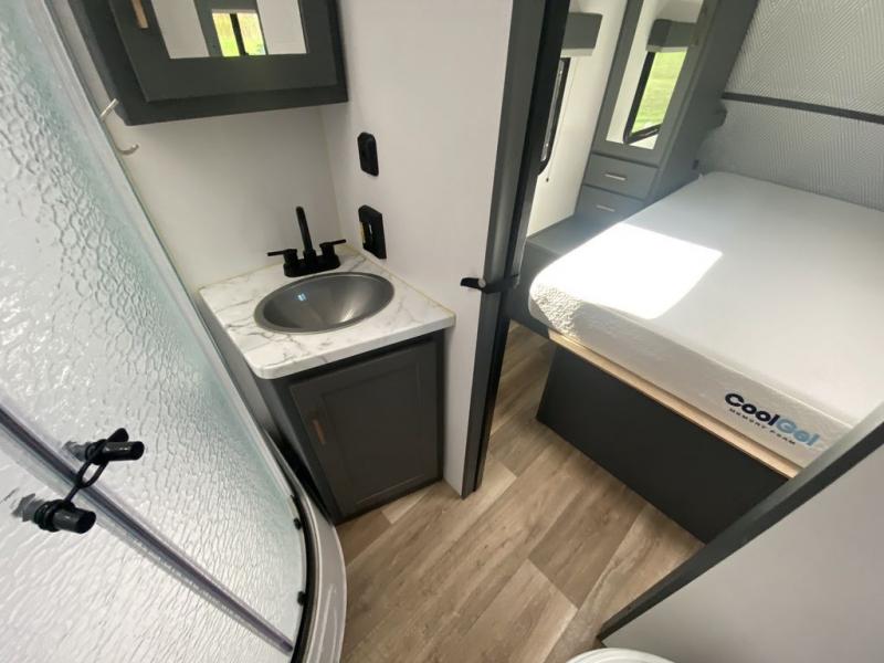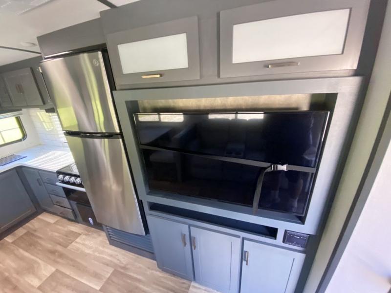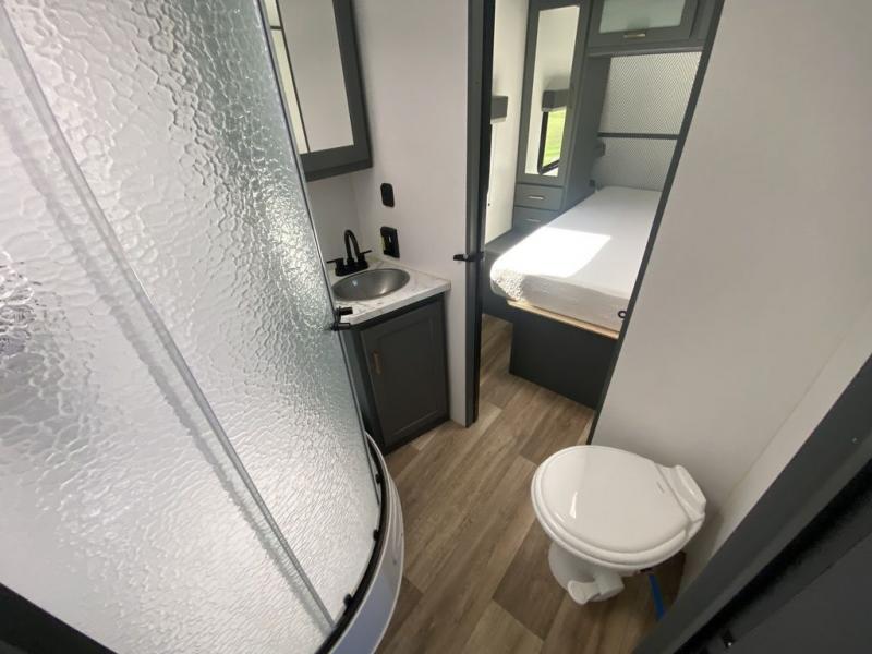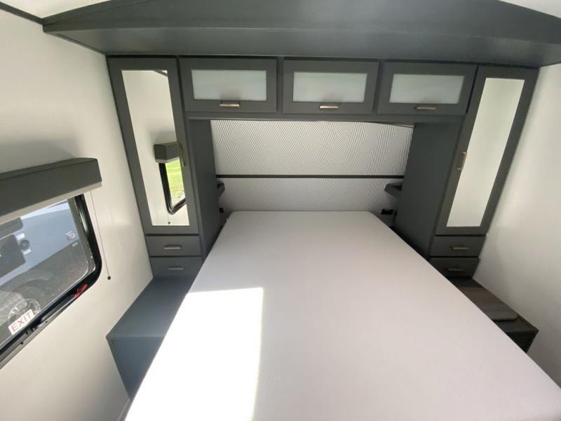 This Bullet allows you to work and entertain while away thanks to the desk/bar top in the rear kitchen area, and the cook will have an L-shaped corner counter including a single basin stainless steel sink and high rise faucet to keep everything clean. The Furrion appliances allow you to cook like at home, and the 8 cu. ft. refrigerator will hold the cold items. There is a hidden pantry for storage as well as overhead cabinets. The double entry bath is convenient, and the front bedroom provides a walk-around queen bed, wardrobes, a laundry chute and offers privacy when you have overnight guests sleeping on the furniture.