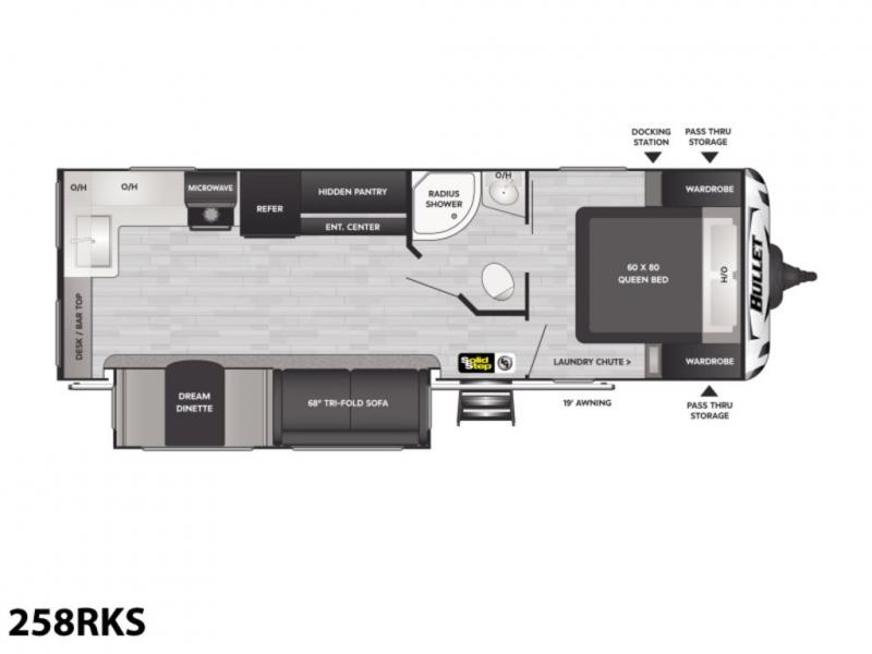 With any Keystone Bullet travel trailer you can experience ultra-lightweight camping with style! The interior design and functionality will impress you, and the stunning cabinetry, the vaulted ceilings, and the built-in laundry chute are just a few of the highlights. Each is built with Hyper Deck RV flooring that is stronger, lighter and more resilient than traditional wood laminated flooring, a 51 cu. ft. pass-through storage compartment which provides 25% more storage space and has a 40" wider door meaning easier access and more room for supplies, and a docking station, an easily accessible convenience center with water connections, water heater bypass, KeyTV hookups, stabilizer jack switches and winterization access. You will also find a Giggy box, a weather protected, labeled, and fused electric box, plus more Keystone Exclusives. Start your glamorous and carefree trip today in a Bullet!