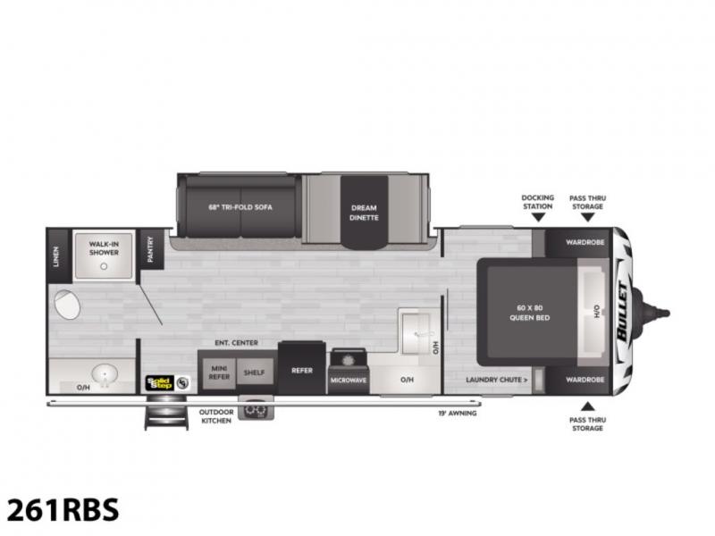 With any Keystone Bullet travel trailer you can experience ultra-lightweight camping with style! The interior design and functionality will impress you, and the stunning cabinetry, the vaulted ceilings, and the built-in laundry chute are just a few of the highlights. Each is built with Hyper Deck RV flooring that is stronger, lighter and more resilient than traditional wood laminated flooring, a 51 cu. ft. pass-through storage compartment which provides 25% more storage space and has a 40" wider door meaning easier access and more room for supplies, and a docking station, an easily accessible convenience center with water connections, water heater bypass, KeyTV hookups, stabilizer jack switches and winterization access. You will also find a Giggy box, a weather protected, labeled, and fused electric box, plus more Keystone Exclusives. Start your glamorous and carefree trip today in a Bullet!