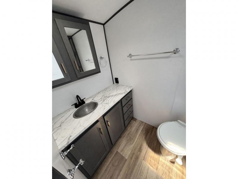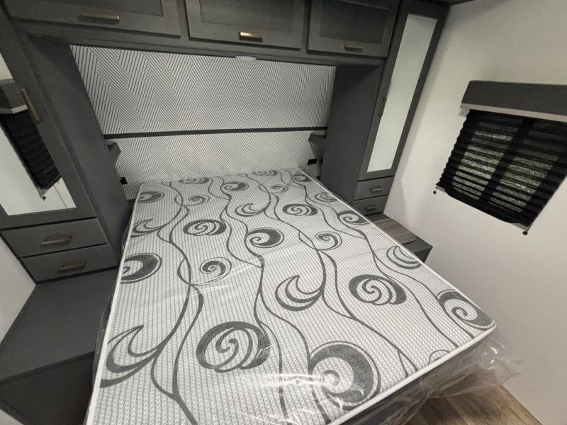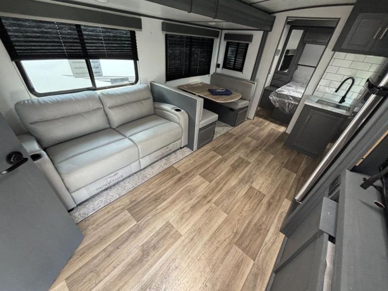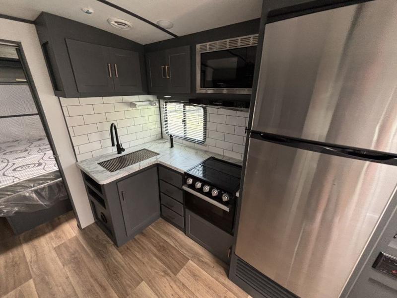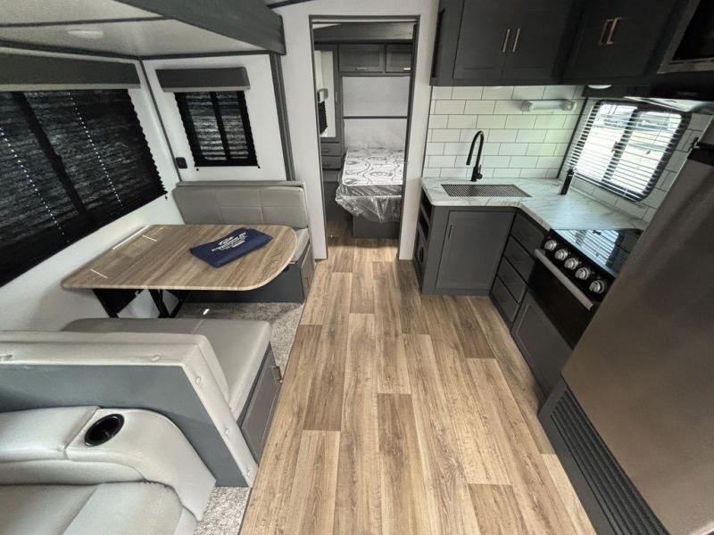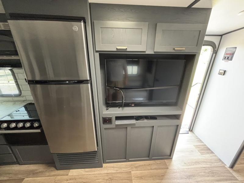 Head out to the state park to meet your friends or enjoy a relaxing weekend with your favorite person! Or maybe you enjoy walking the trails, fishing in the pond, and hiking up the hills. This trailer will be waiting with all the comforts of home from the full rear bathroom with a walk-in shower and linen storage to the front bedroom with a space saving sliding door and a walk-around queen bed. The main living and kitchen area has a large slide with a tri-fold sofa and booth dinette, and the kitchen offers an L-shaped counter including a single basin stainless steel sink and high rise faucet, plus Furrion appliances and an 8 cu. ft. refrigerator. And the cook will love the outside kitchen.