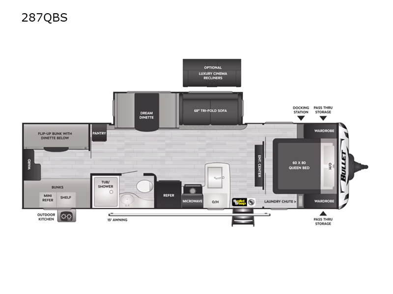 With any Keystone Bullet travel trailer you can experience ultra-lightweight camping with style! The interior design and functionality will impress you, and the stunning cabinetry, the vaulted ceilings, and the built-in laundry chute are just a few of the highlights. Each is built with Hyper Deck RV flooring that is stronger, lighter and more resilient than traditional wood laminated flooring, a 51 cu. ft. pass-through storage compartment which provides 25% more storage space and has a 40" wider door meaning easier access and more room for supplies, and a docking station, an easily accessible convenience center with water connections, water heater bypass, KeyTV hookups, stabilizer jack switches and winterization access. You will also find a Giggy box, a weather protected, labeled, and fused electric box, plus more Keystone Exclusives. Start your glamorous and carefree trip today in a Bullet!
