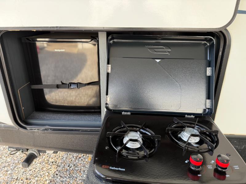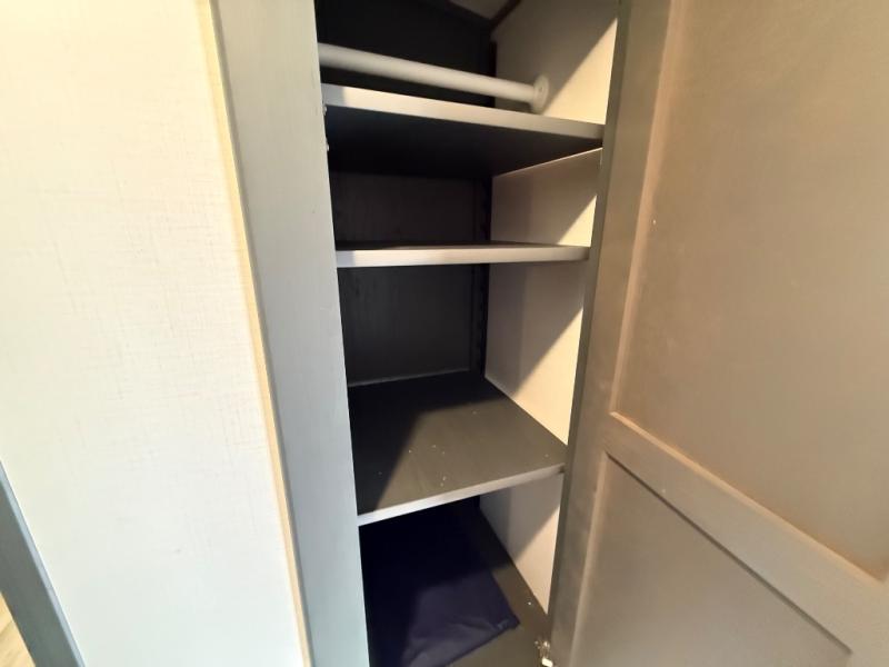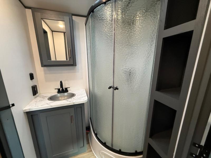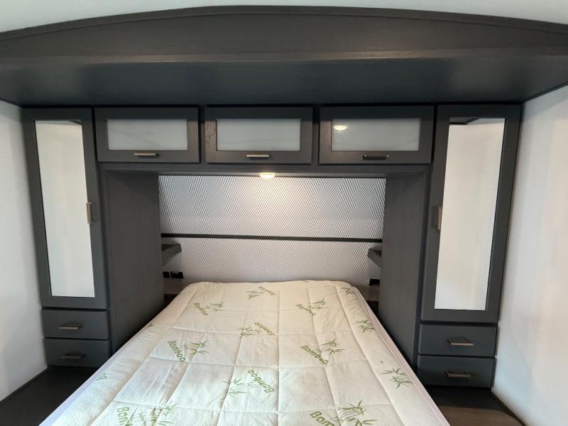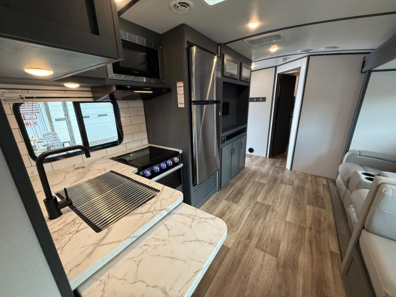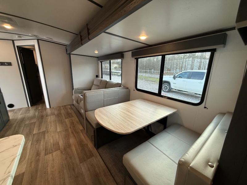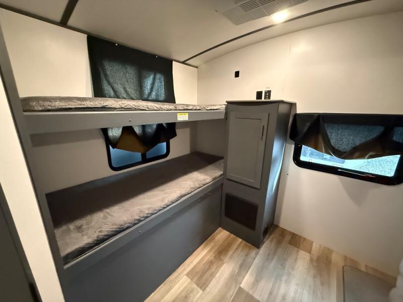 Whether you camp for outdoor fun or inside comforts with a view, this trailer will offer both! The slide out in the main living area gives you more floor space and includes a tri-fold sofa and Dream dinette to relax on, dine at and play games, while the kitchen provides Furrion appliances, a refrigerator, a pantry, a single basin stainless steel sink and high rise faucet. The cook will surely make several meals using the outside kitchen, and the 21' electric awning gives everyone an outdoor living area once you add your camping chairs taken from the pass-through compartment. When it's bedtime, you can head to the front bedroom with a walk-around queen bed and wardrobes, plus a handy laundry chute, and your friends can have privacy in the bunkhouse with a slide out flip-up bunk with two flip chairs below, plus two more bunks and storage.