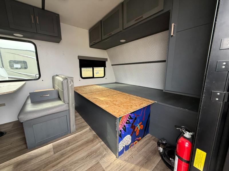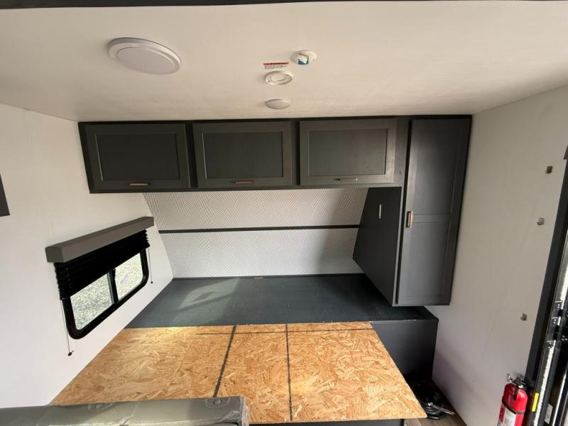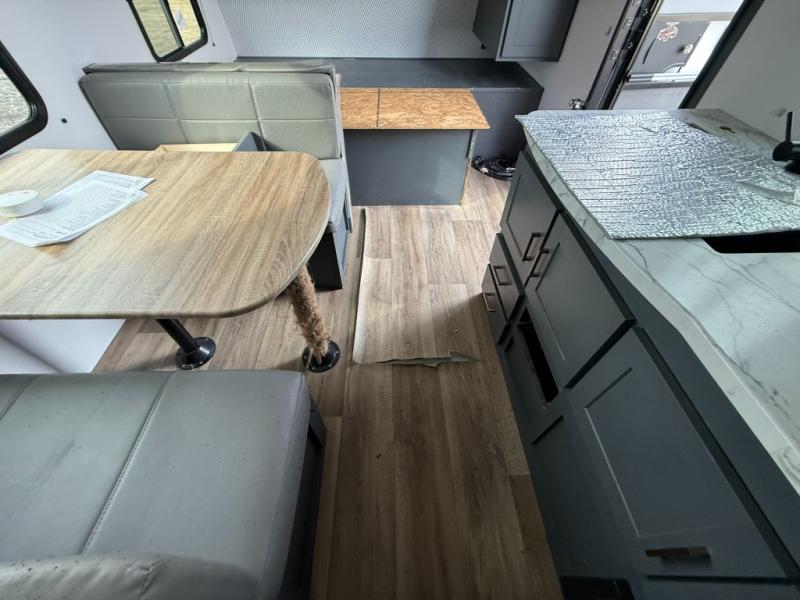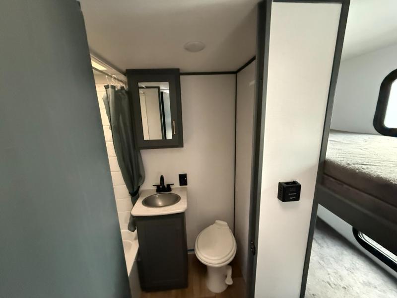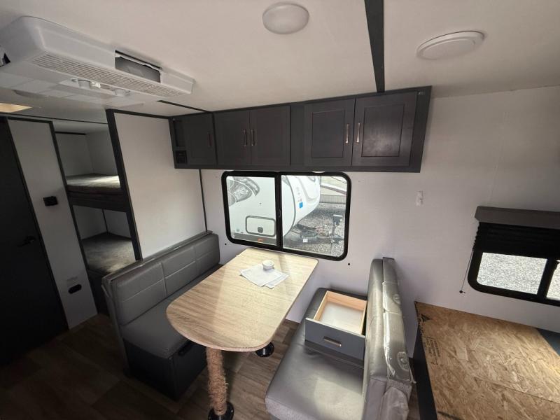 Trips to the Grand Canyon are made comfortable in this travel trailer for five. You will enjoy your own queen bed up front with a wardrobe for your clothes. The kids or your guests will love bunk beds right next to the full bath, and there is also a booth dinette that can serve as both dining and sleeping space. Prepare all your meals in the Furrion microwave, or use the two burner gas range, and the 6 cu. ft. gas/electric refrigerator will be perfect for all your perishables.