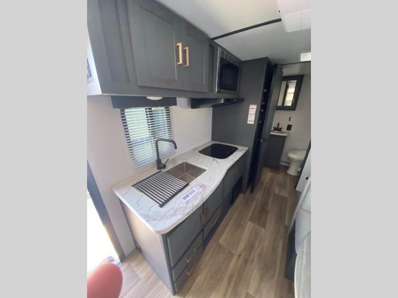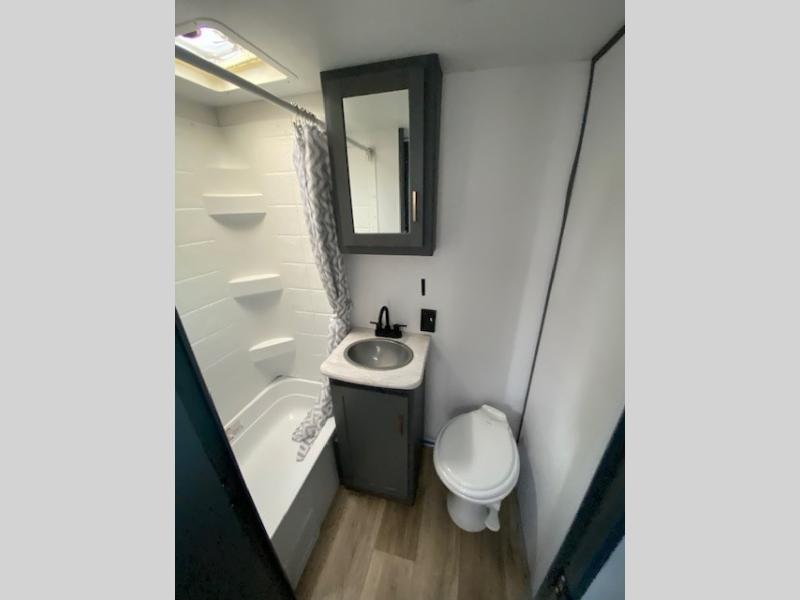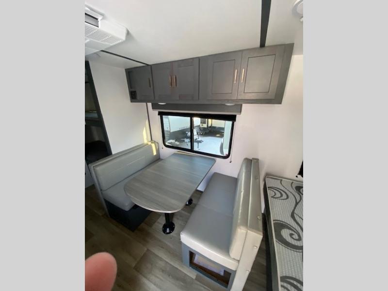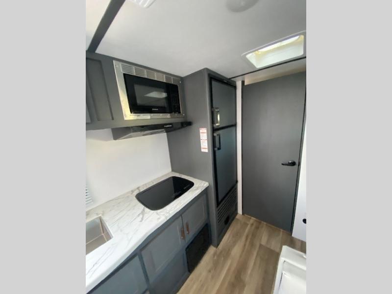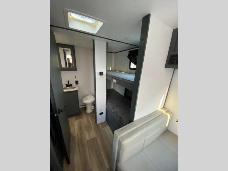 Trips to the Grand Canyon are made comfortable in this travel trailer for five. You will enjoy your own queen bed up front with a wardrobe for your clothes. The kids or your guests will love bunk beds right next to the full bath, and there is also a booth dinette that can serve as both dining and sleeping space. Prepare all your meals in the Furrion microwave, or use the two burner gas range, and the 6 cu. ft. gas/electric refrigerator will be perfect for all your perishables.