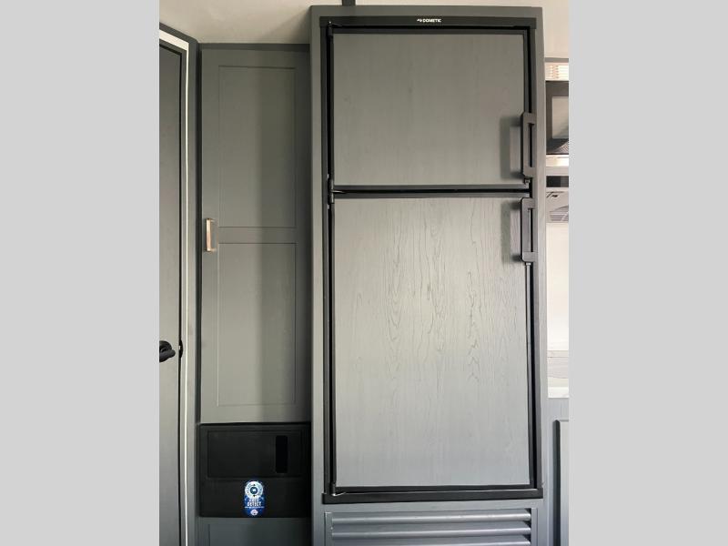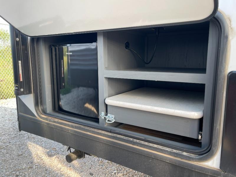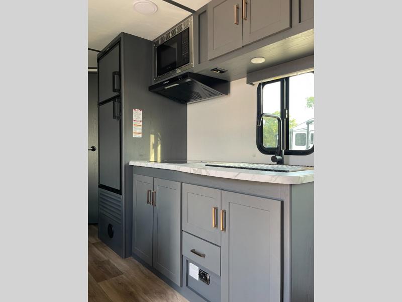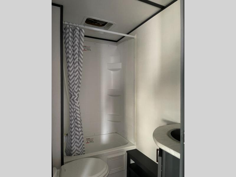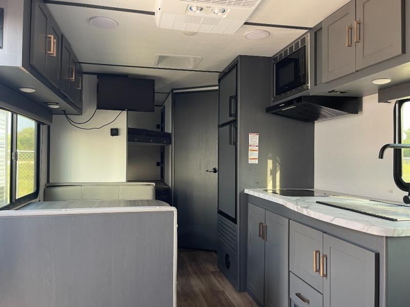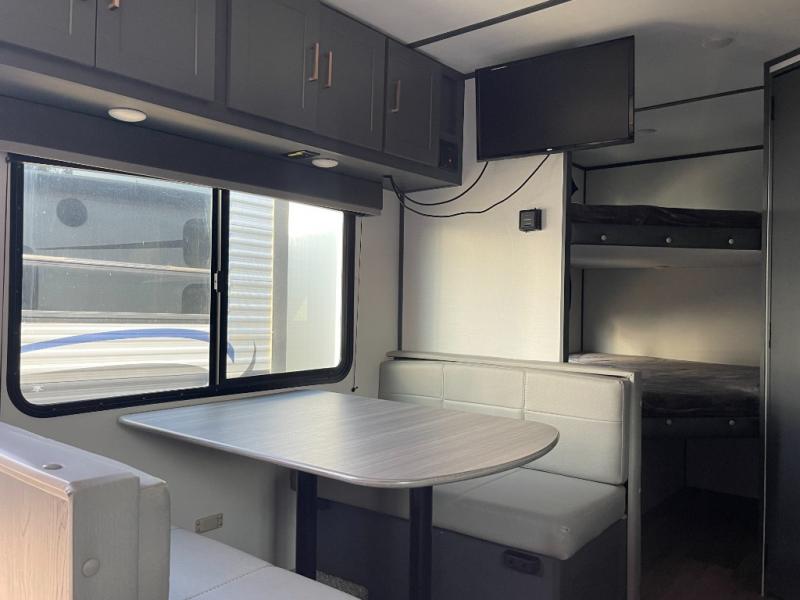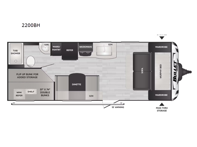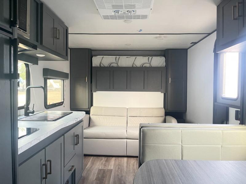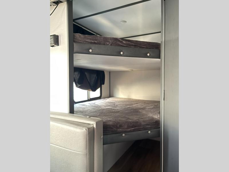 Added sleeping space and a versatile Murphy bed are a dream come true in this cozy travel trailer. The double-size bunks include a flip-up bunk for added storage, and the front Murphy bed can be folded away in the morning so you can relax on the sofa. There is also a booth dinette where you can dine, play games, and sleep more guests. This model includes a full bath with a tub/shower that will make bath time for little ones easier than ever, and there is a wardrobe/pantry just outside the bath for clean towels and necessities. And check out the exterior with its 15' power awning with LED lights, pass-through storage, and mini refrigerator with an added shelf for snacks or cups.
