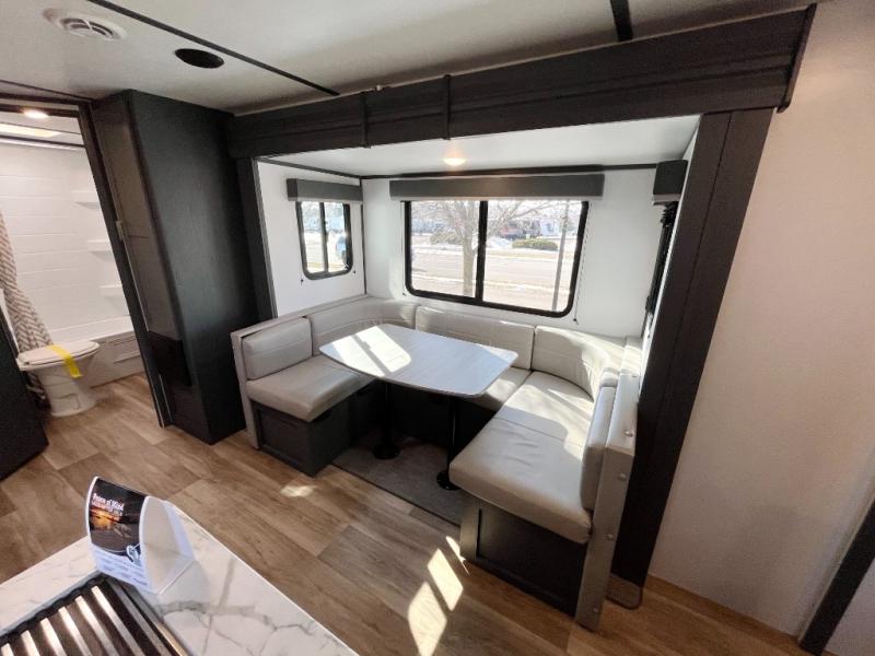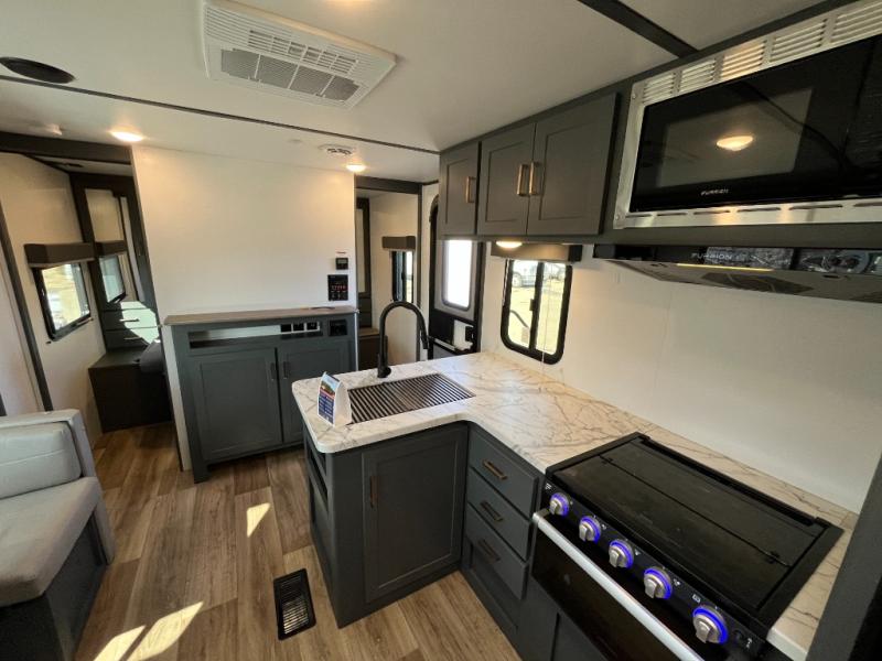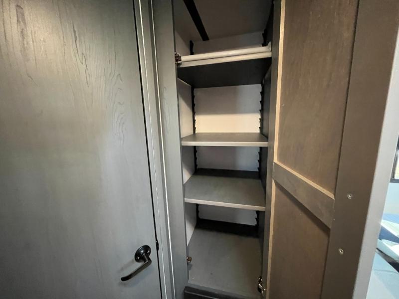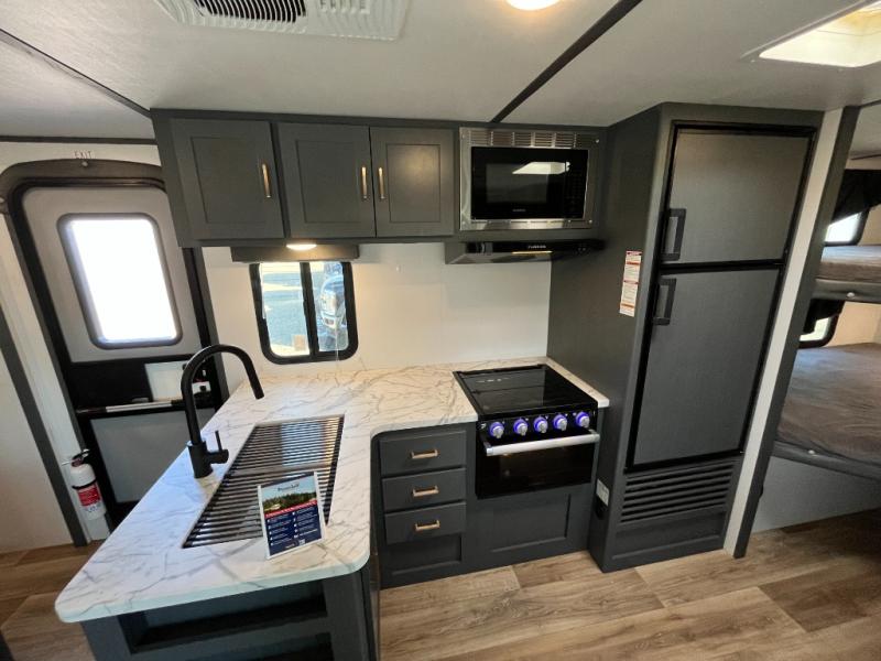 You can easily sleep eight in this travel trailer thanks to the 51" x 74" double-size bunks, the U-shaped dinette slide, and the queen bed in the front bedroom. There is a laundry chute in the bedroom that will go straight to the pass-through storage for convenience. Whip up your best meals on the two burner gas range, or use the Furrion microwave oven. You can dine around the dinette, or take your plate outdoors to sit under the 19' power awning with LED lights, plus there is an outdoor mini refrigerator so you can easily get a cold drink.