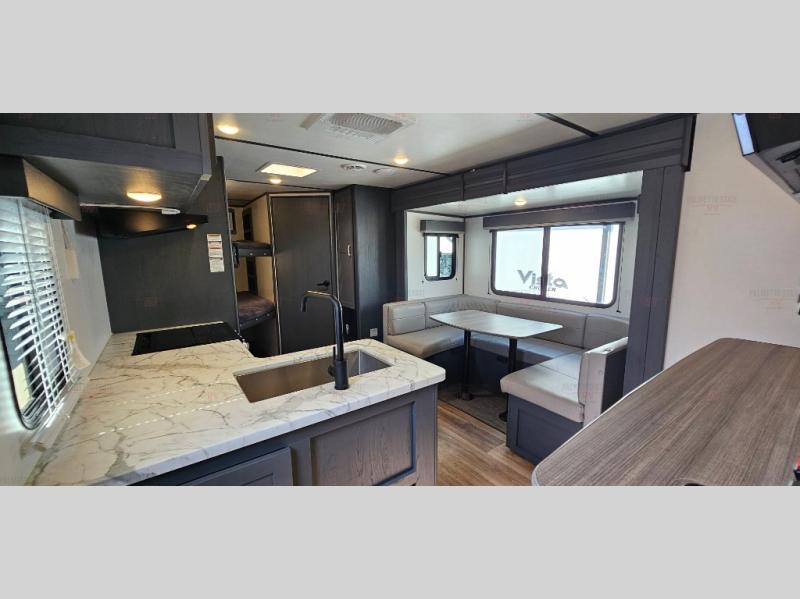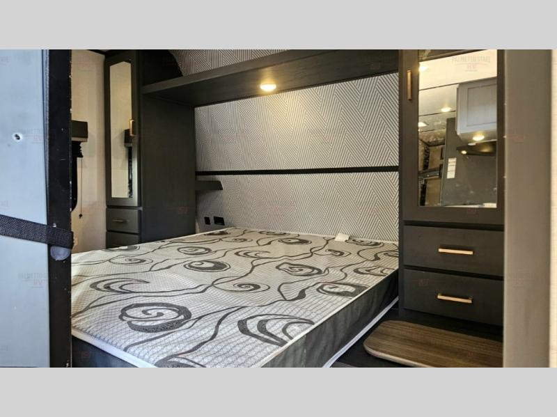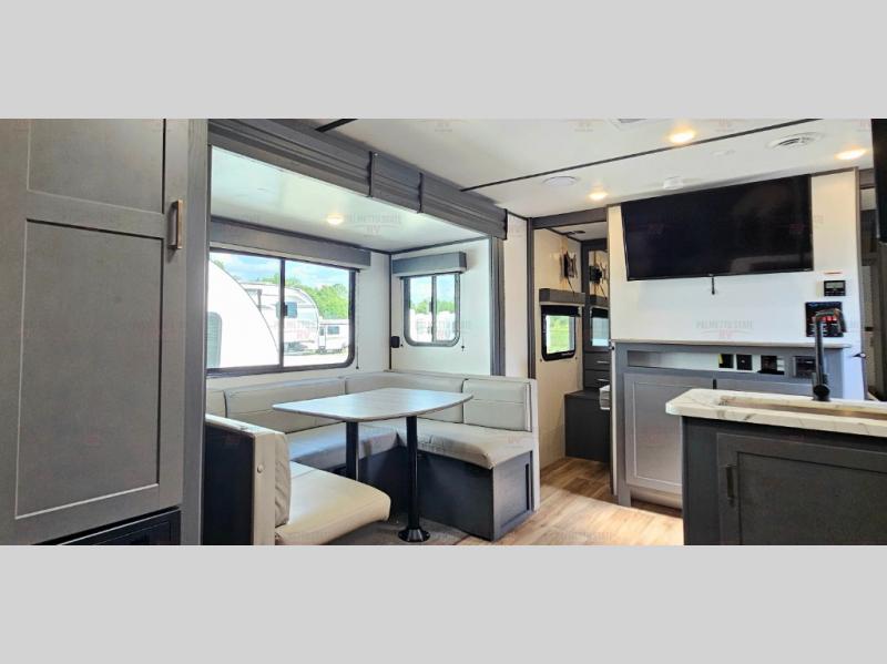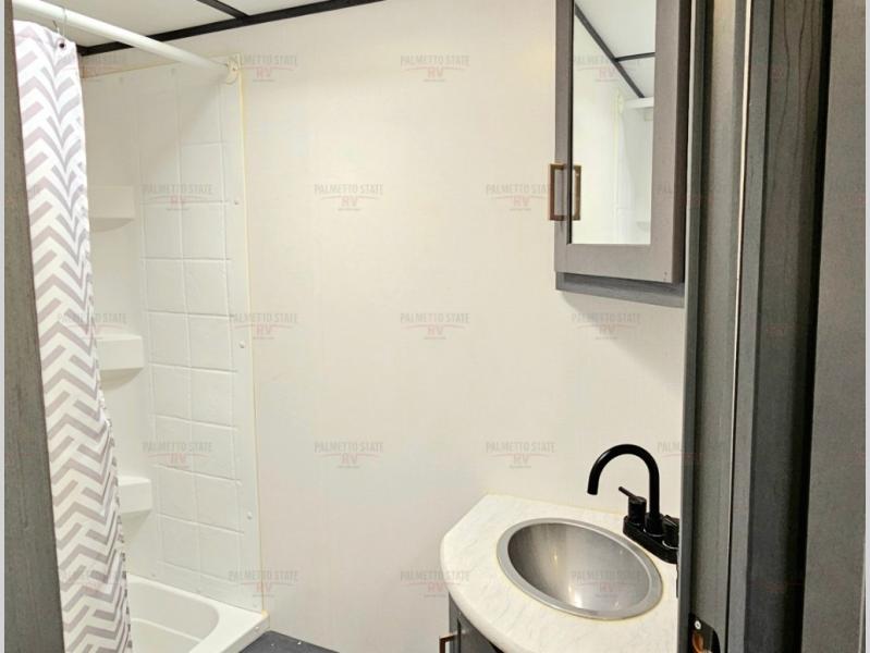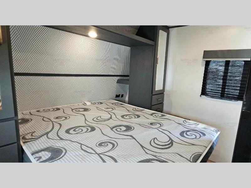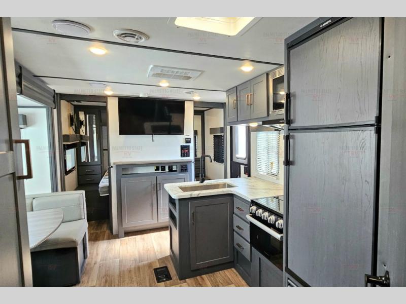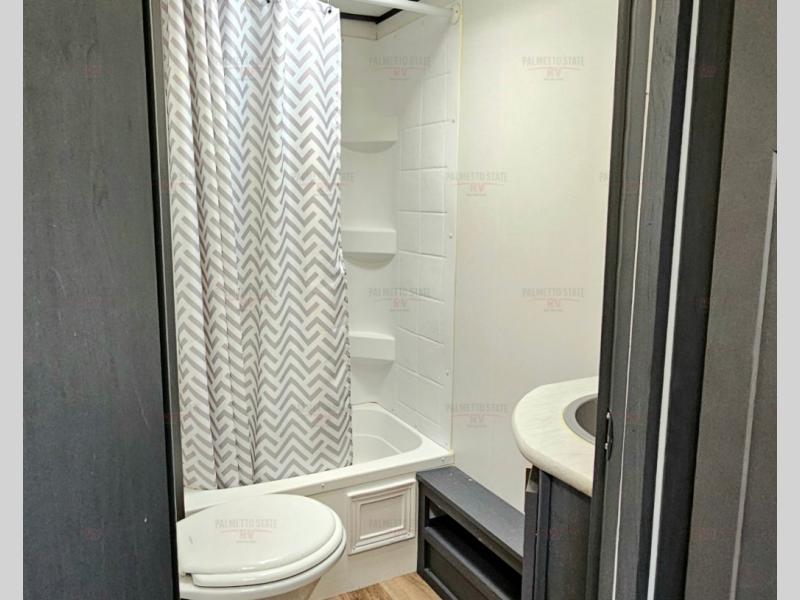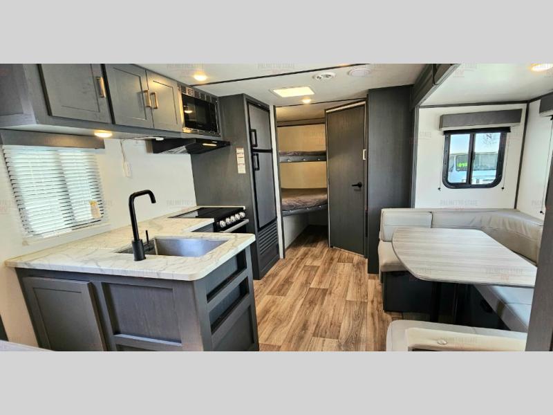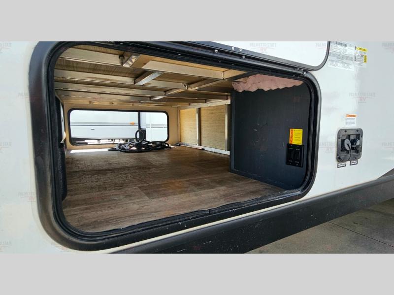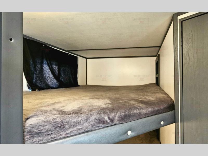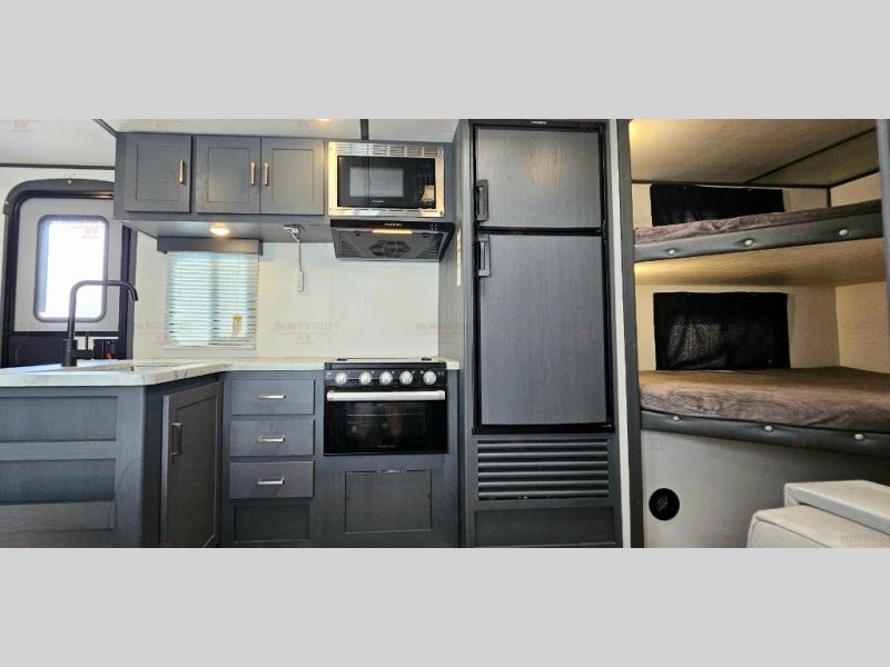 You can easily sleep eight in this travel trailer thanks to the 51" x 74" double-size bunks, the U-shaped dinette slide, and the queen bed in the front bedroom. There is a laundry chute in the bedroom that will go straight to the pass-through storage for convenience. Whip up your best meals on the two burner gas range, or use the Furrion microwave oven. You can dine around the dinette, or take your plate outdoors to sit under the 19' power awning with LED lights, plus there is an outdoor mini refrigerator so you can easily get a cold drink.