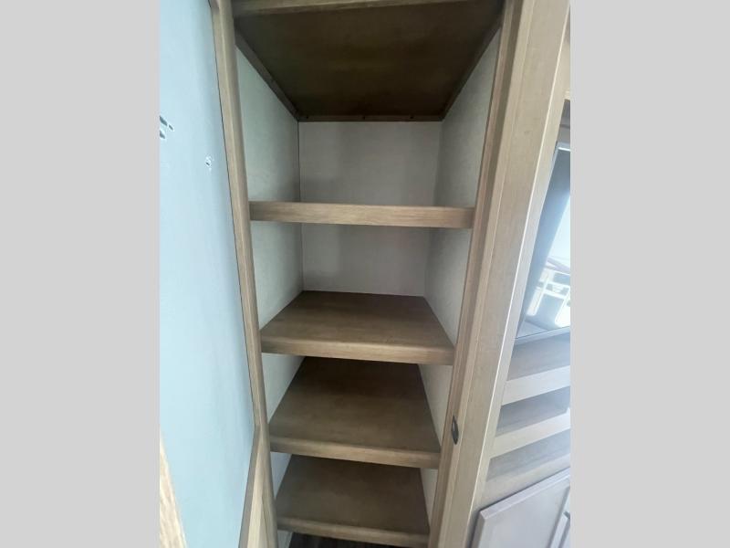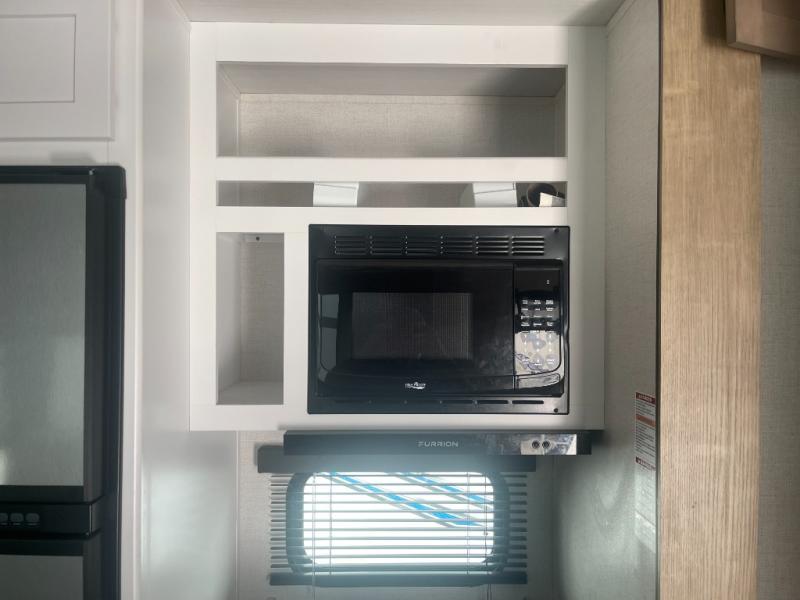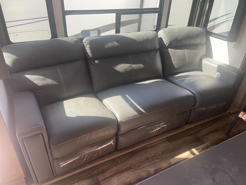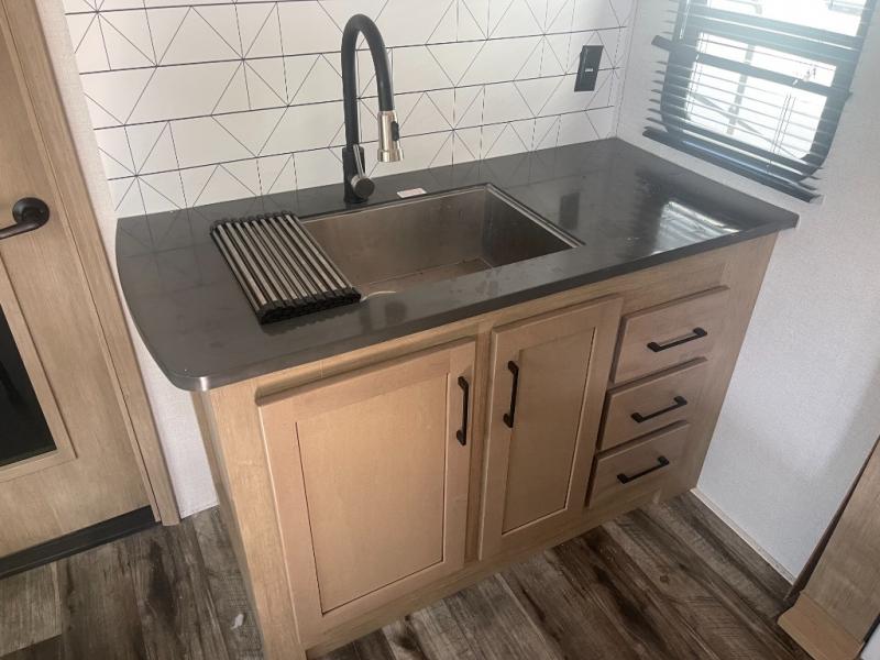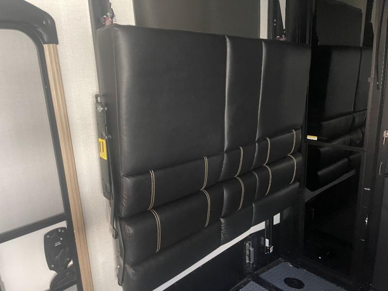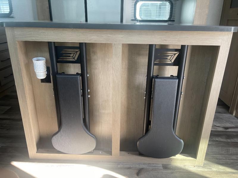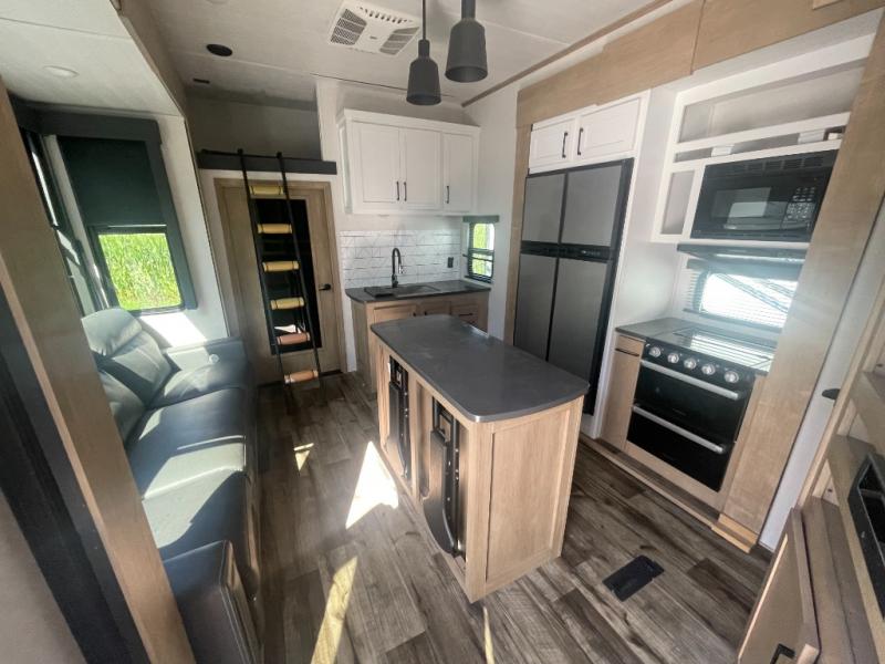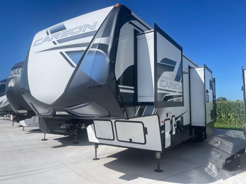 Looking for an island that you can dine at and a tandem axle fifth wheel that offers 13' of garage space for your ATV or motorcycles? Look no further than this Carbon that provides both plus offers triple slides for more interior space in the main living and kitchen area as well as the front bedroom. The garage doesn't just offer toy storage for traveling, it converts into a living and sleeping area with the electric bed with dual opposing sofas, overhead storage, a washer/dryer prepped space, and a loft with a twin bed is above with access from the main living and kitchen area. The kitchen has a large farmhouse style sink, appliances to make warm meals, a pantry, and an entertainment center with a 50" LED TV with surround sound. And the front bedroom gives you privacy, a queen bed, wireless phone chargers and plenty of storage for your clothing.