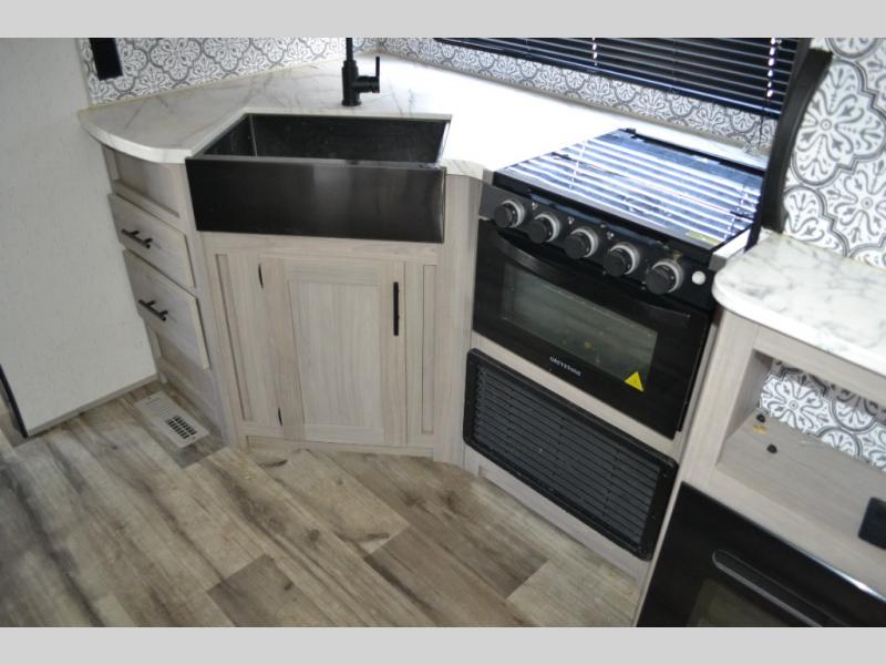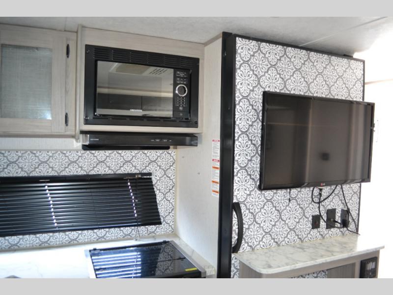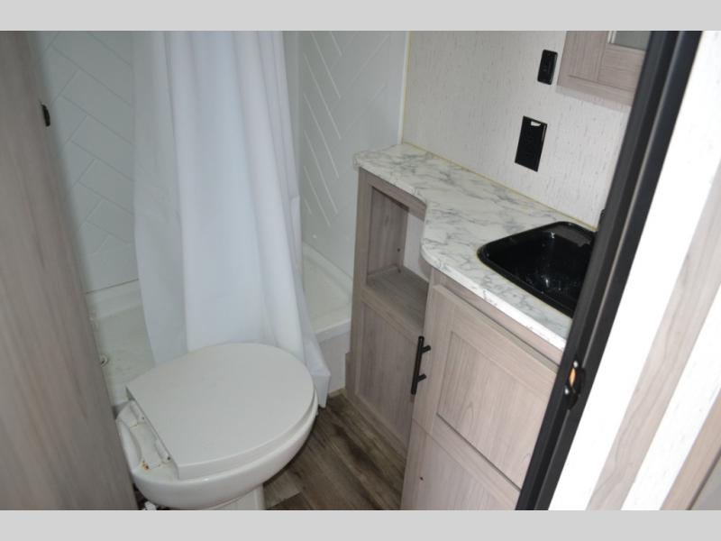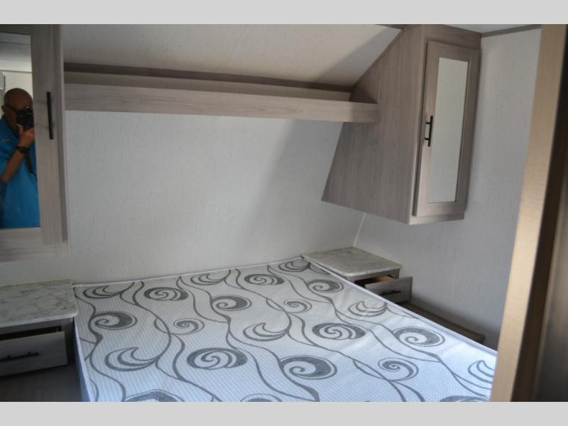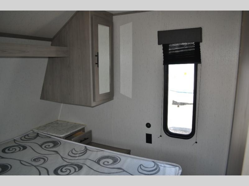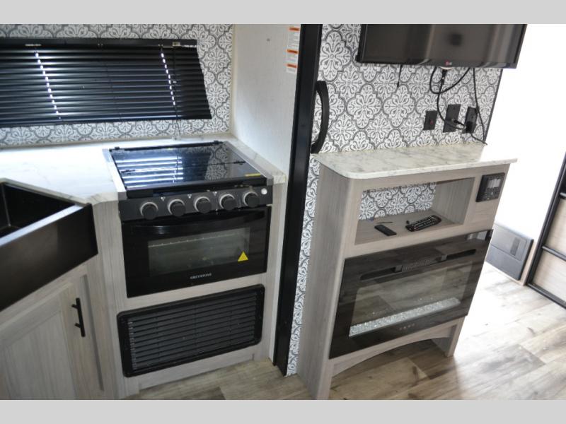 If you enjoy making memories and telling lots of stories, then take this trailer with you on your next trip! You will be able to offer sleeping space for four on the double-size bunks in the rear next to the entry and the full bathroom, plus the conventional U-shaped dinette once easily setup for bedtime gives two more a space to call theirs. Of course, the front bedroom with a queen bed and dual wardrobes will be all yours especially when you want privacy. Everyone can gather around the U-shaped dinette to visit, plan the day's activities, and enjoy the fireplace while the cook makes meals using the kitchen appliances. And don't forget about the outside kitchen when cooking, and the power awning when you want to relax outside.
