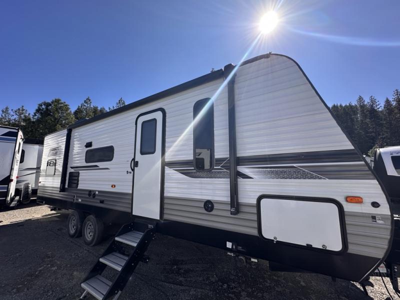 Family fun is found in this spacious travel trailer with double-size bunks, a large slide out, and a private bedroom up front! You can relax on the sofa or play a card game at the booth dinette, or you can visit outdoors under the 14' power awning with LED lights. The cooktop and oven will be perfect to prepare at-home meals on, and there is plenty of counter space to cut fresh fruits and vegetables. This model includes a full bath for convenience, and you'll love how the shower skylight allows natural light in. The queen bed in the bedroom will make this model feel more like home, and the little ones will love to climb into double-size bunks each night. And don't overlook the pass-through storage for fishing poles and hiking gear!