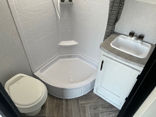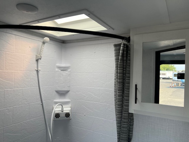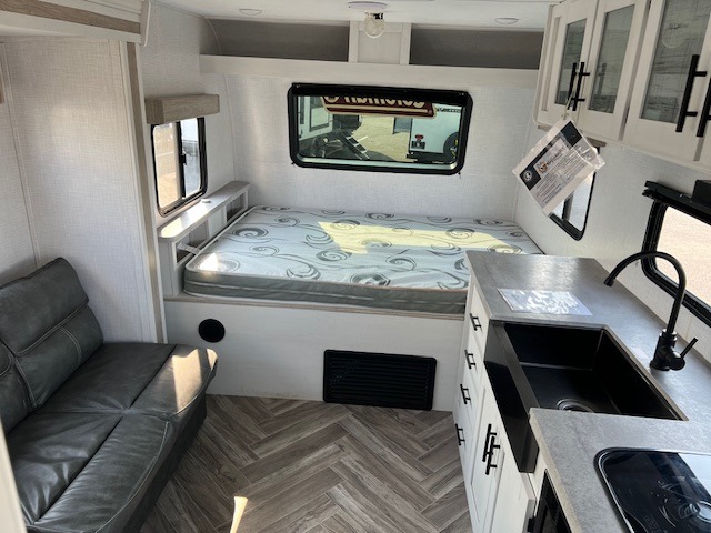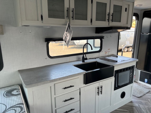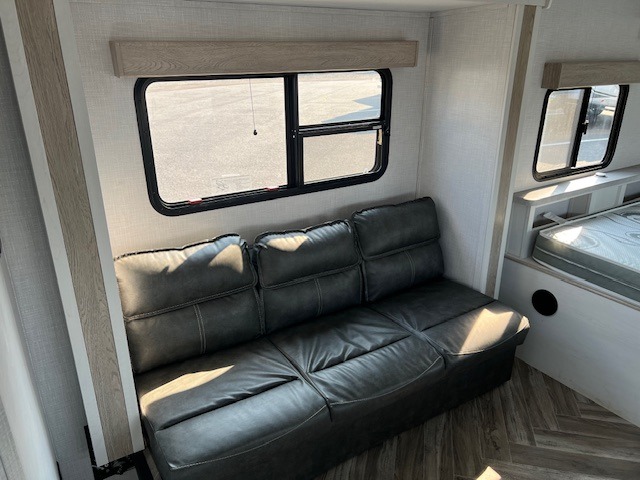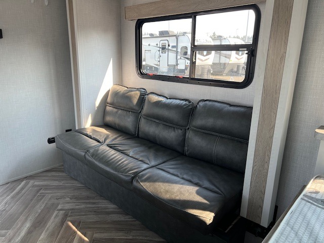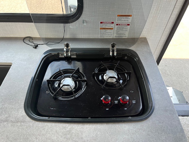 This travel trailer is perfect for two people looking to escape the hustle and bustle of everyday life! The front queen bed welcomes you to enjoy a good night's rest each night so you can feel refreshed every morning. After you have fried up some eggs with the two burner range, you can head to the sofa slide and enjoy it there with the indoor/outdoor table or take the table outside to have breakfast outdoors under the 12' power awning. The rear corner bathroom has a radius shower with a skylight above for natural lighting as you get ready each morning!