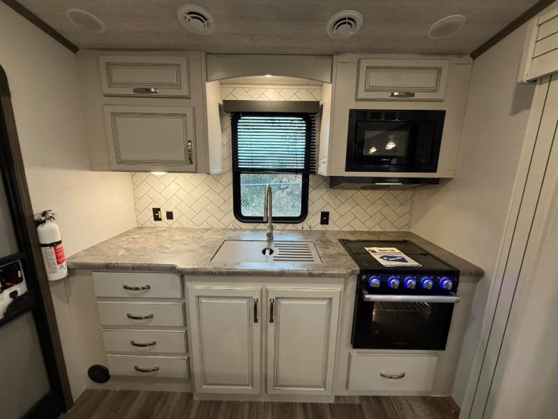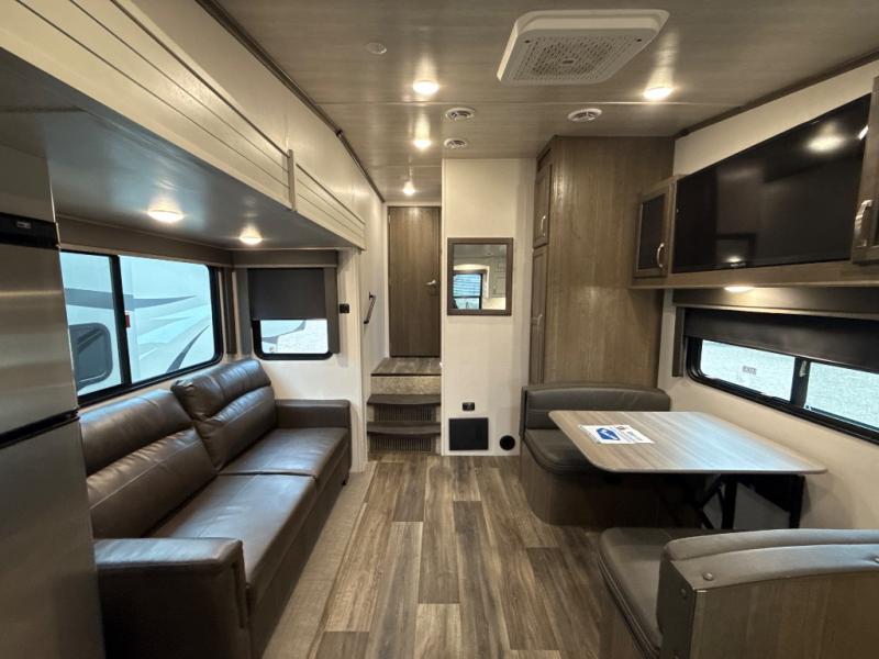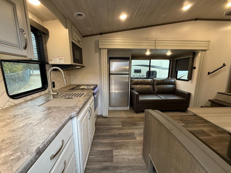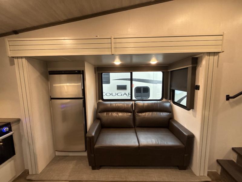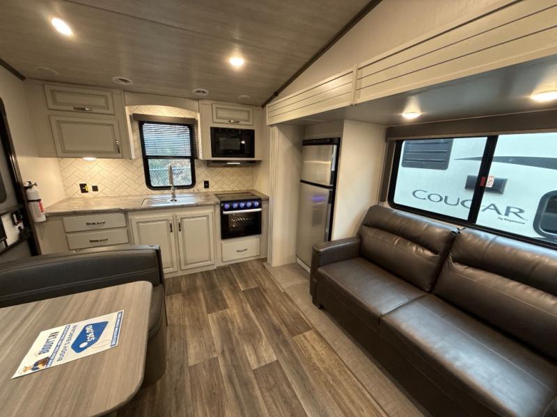 The 2022 Cougar 23MLS is a lightweight fifth wheel designed for easy towing without sacrificing comfort. It features a rear kitchen with modern appliances, a central living area with seating and entertainment space, and a front bedroom with a queen bed and ample storage. The bathroom includes a roomy shower and vanity. With a power awning, stylish interior, and convenient layout, it's a great choice for couples or small families looking to travel in comfort.