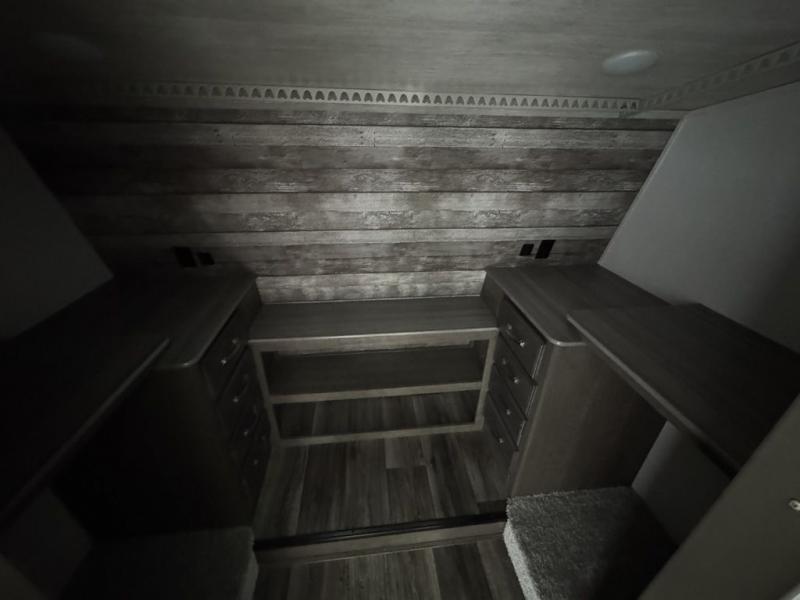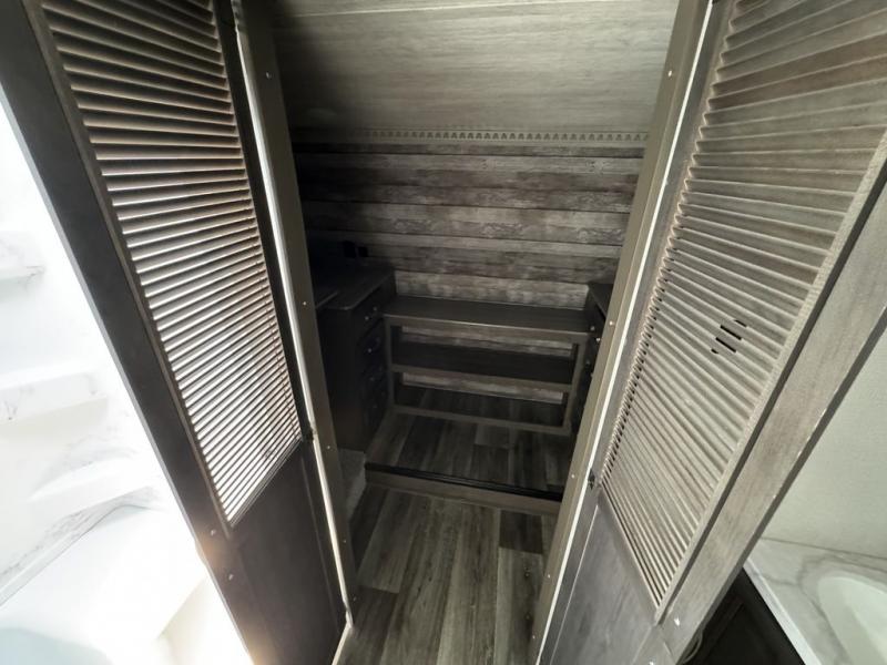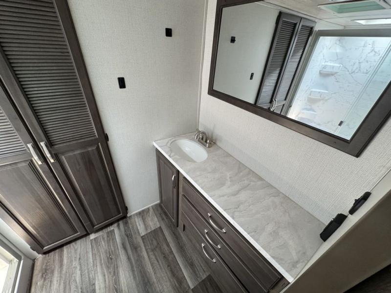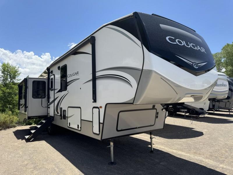 You will be so excited to take this Cougar fifth wheel out for the first time! Because of its secluded and fully stocked master suite at the front, this unit is perfect for a couple who want to see the country or visit family. The master bathroom has a wonderful walk-in closet that has shoe storage and preparations for a washer/dryer. There is also under-bed storage in the bedroom portion, and the queen bed slide gives you a little more space to get to the dresser and linen closet. The half bathroom is located out in the main living area so that your friends will have a place to go when they visit. Opposing slides keep this living area open for lounging comfortably on the tri-fold sleeper sofa and theater seating, and you can get everyone together for a board game at the booth dinette.