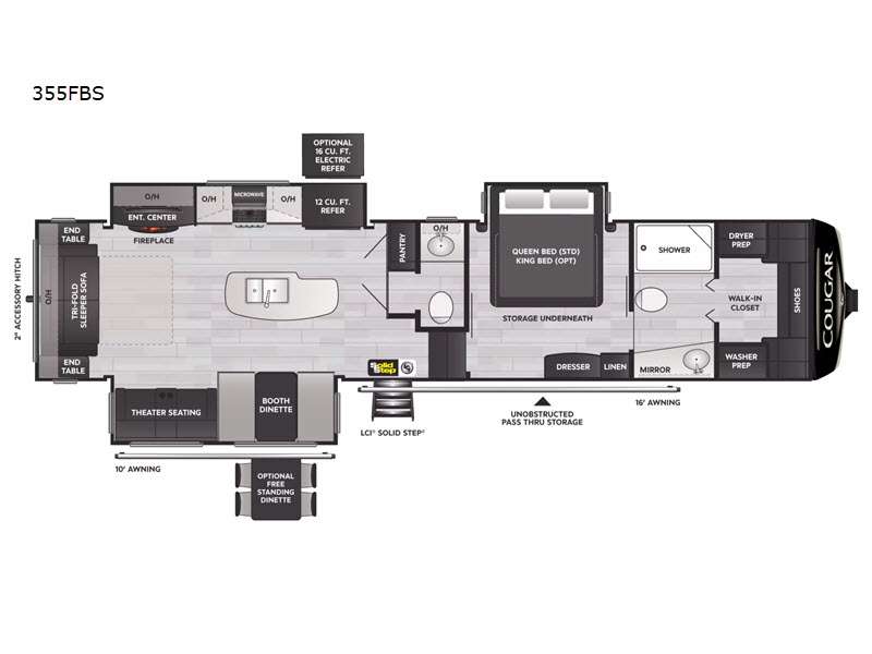 Spend more time having fun and less time worrying about your RV with the Keystone Cougar fifth wheel! These units have all that you will need for excellent vacations. The interior comes with 5/8" one-piece DynaSpan® flooring, tall slide outs for added comfort and head room, night roller shades throughout, residential, raised-panel hardwood cabinet doors and drawers, decorative crown molding, a 5,500 BTU electric fireplace with thermostat control and remote, and a Max Air exhaust fan with rain sensor. The exterior is also fully outfitted with a convenience center, friction-hinge entry door, electric four-point auto leveling system, an LCI® SolidStep® on main entry, a full pass-through storage with slam-latch baggage doors, an industry-best 80-gallon fresh tank capacity, a 2" accessory hitch with 300-LB storage capacity, and an outside shower.