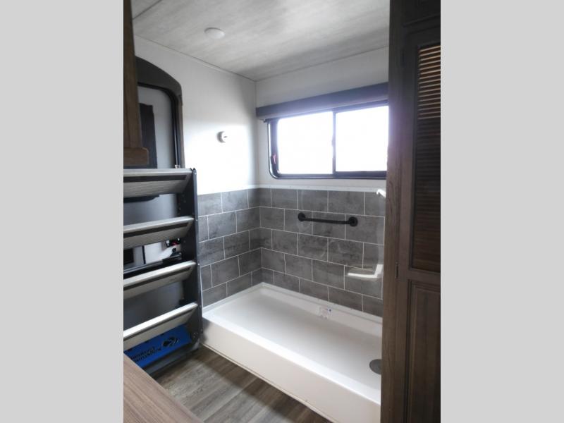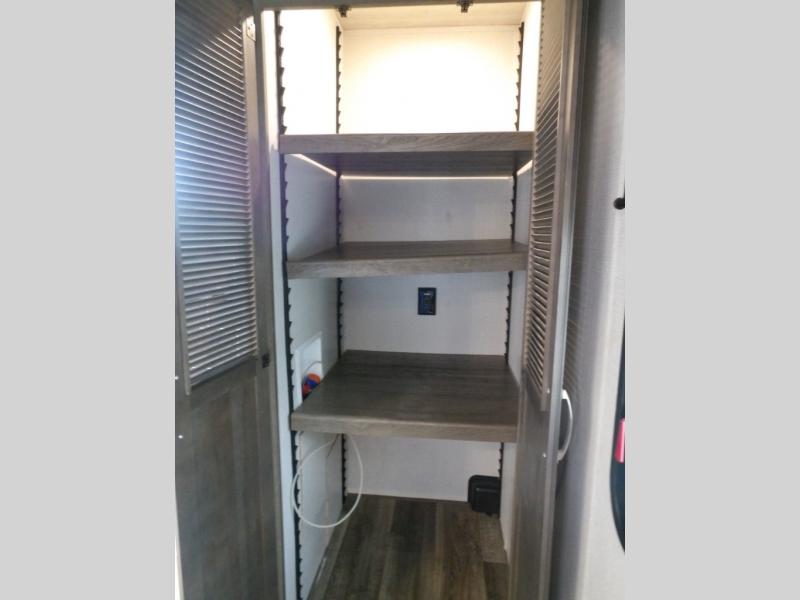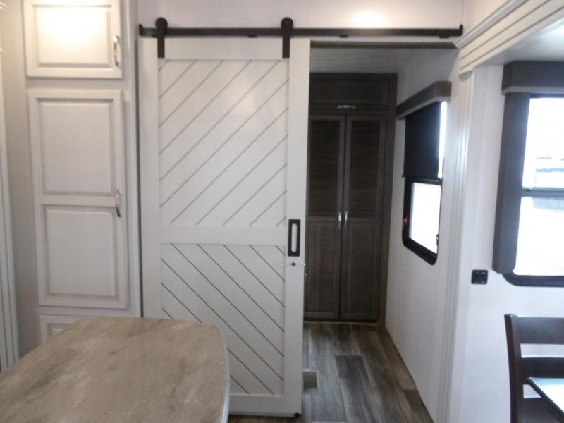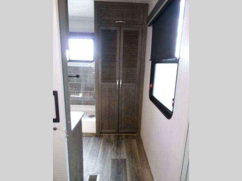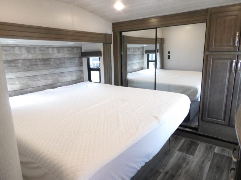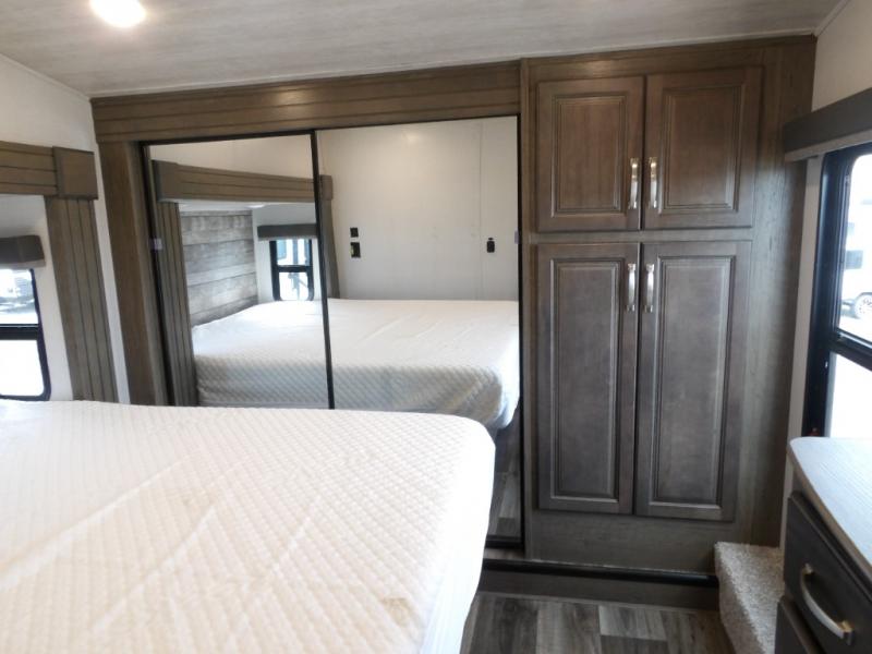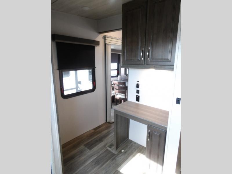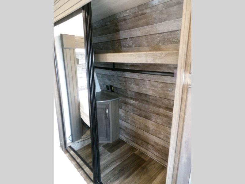 This Cougar fifth wheel is amazingly unique because of the rear mud room that has its own exterior entry door! When you step foot into this space from outside, you'll see a pet-friendly utility shower to your left that you can use to wash off your dog's paws after playing all day out in the mud. There is a washer/dryer cabinet, so this space can also be used as a laundry room while you're out on the road, and you can even fold your clothes or store laundry baskets on the desk with overhead cabinets. Talk about residential living! When you make your way out of the mud room and into the main living area, you'll find even more homey comforts with the theater seating, sofa, kitchen island, fireplace, and LED HDTV. You'll also have plenty of space with opposing slides on either side. The front portion of this unit has a private bedroom that you can escape to each night, and there is a full-height wardrobe in the bedroom for great clothing storage.