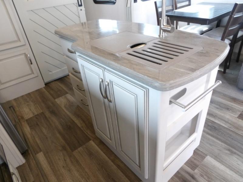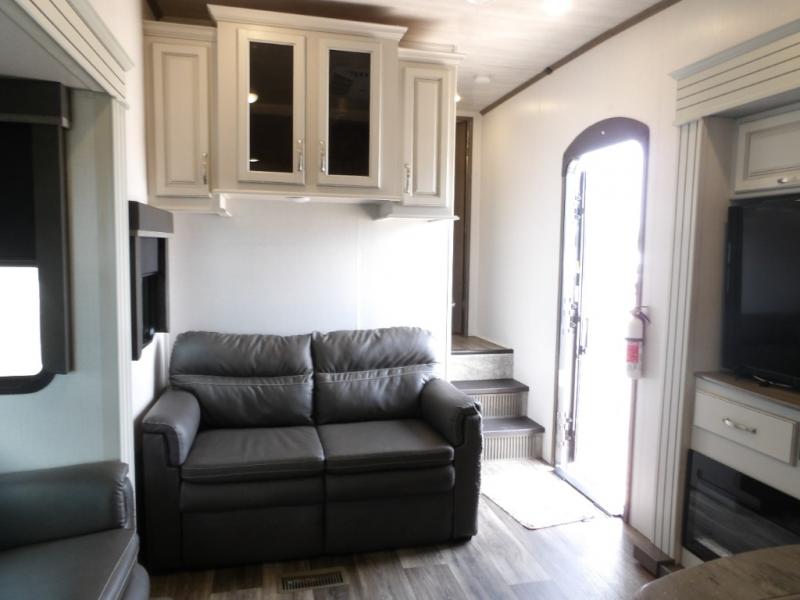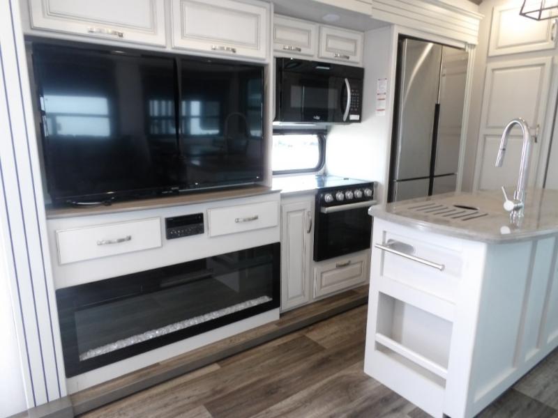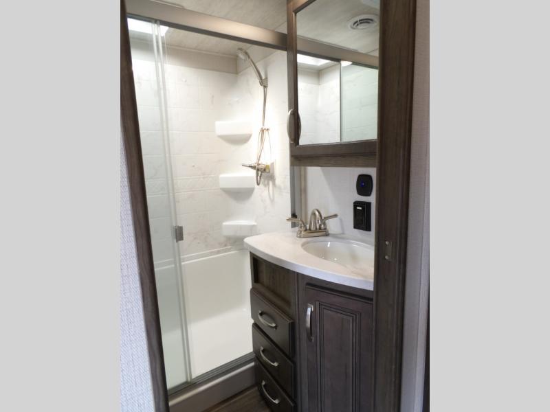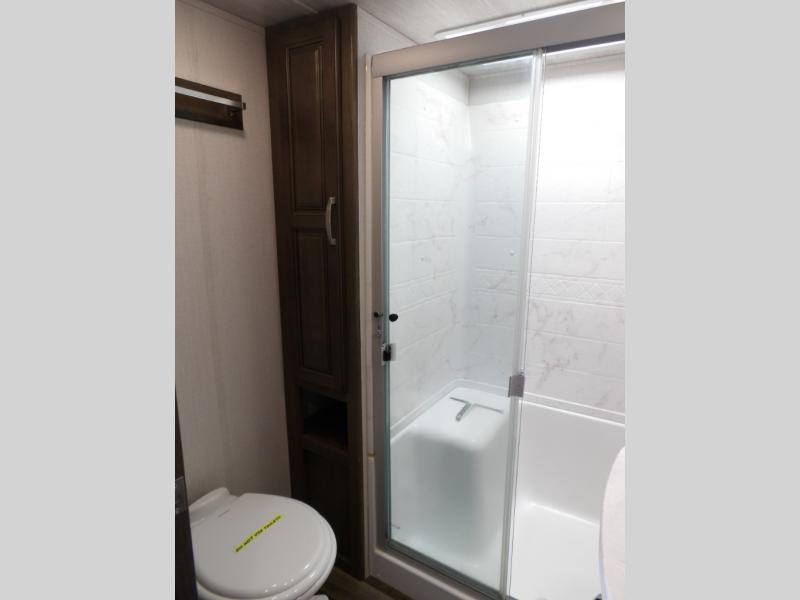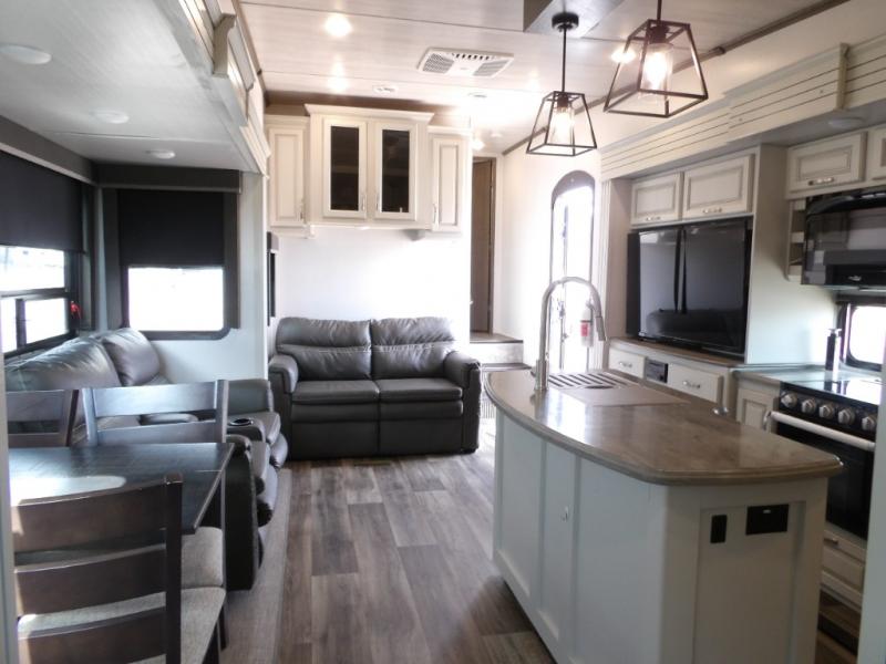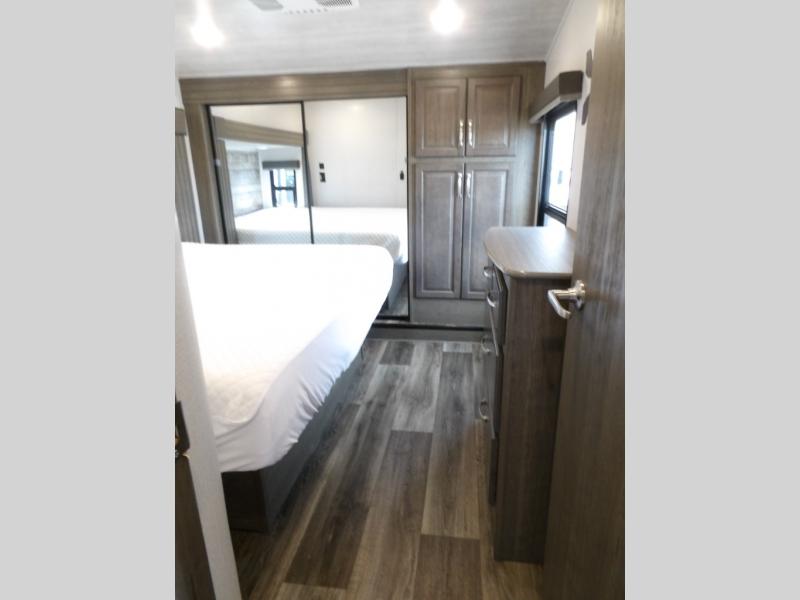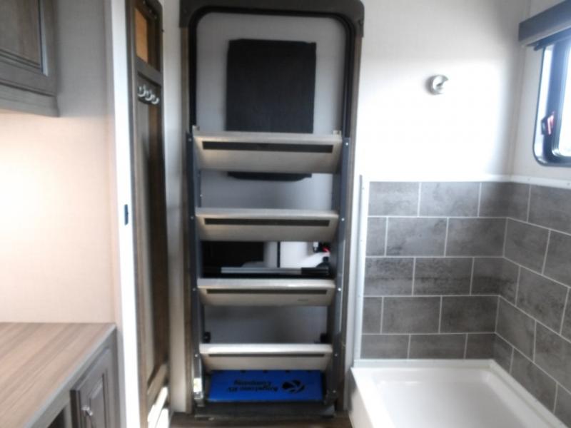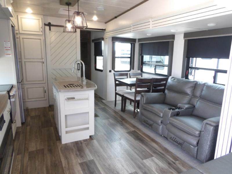 This Cougar fifth wheel is amazingly unique because of the rear mud room that has its own exterior entry door! When you step foot into this space from outside, you'll see a pet-friendly utility shower to your left that you can use to wash off your dog's paws after playing all day out in the mud. There is a washer/dryer cabinet, so this space can also be used as a laundry room while you're out on the road, and you can even fold your clothes or store laundry baskets on the desk with overhead cabinets. Talk about residential living! When you make your way out of the mud room and into the main living area, you'll find even more homey comforts with the theater seating, sofa, kitchen island, fireplace, and LED HDTV. You'll also have plenty of space with opposing slides on either side. The front portion of this unit has a private bedroom that you can escape to each night, and there is a full-height wardrobe in the bedroom for great clothing storage.