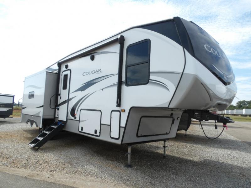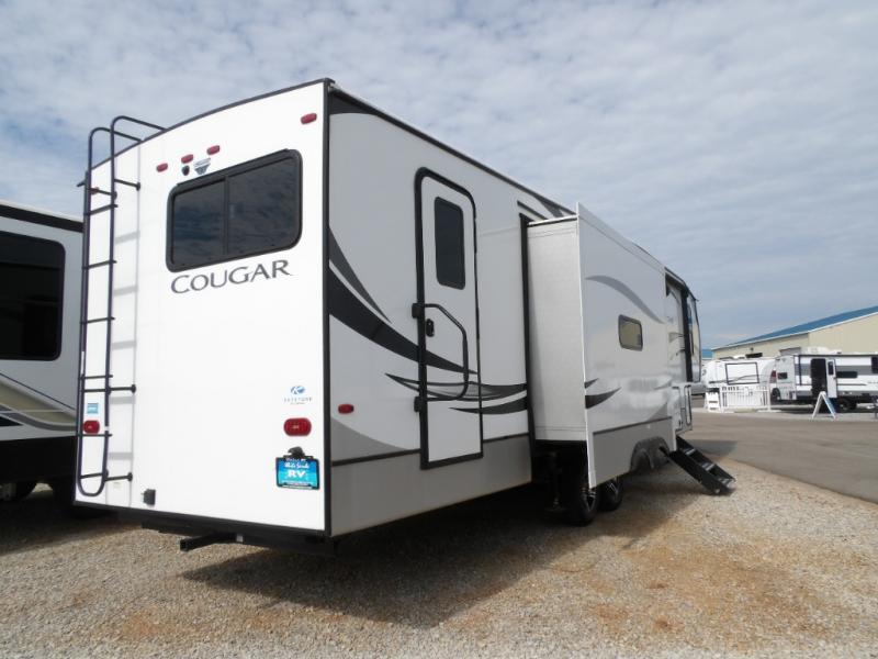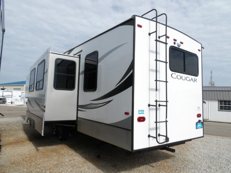 Spend more time having fun and less time worrying about your RV with the Keystone Cougar fifth wheel! These units have all that you will need for excellent vacations. The interior comes with 5/8" one-piece DynaSpan® flooring, tall slide outs for added comfort and head room, night roller shades throughout, residential, raised-panel hardwood cabinet doors and drawers, decorative crown molding, a 5,500 BTU electric fireplace with thermostat control and remote, and a Max Air exhaust fan with rain sensor. The exterior is also fully outfitted with a convenience center, friction-hinge entry door, electric four-point auto leveling system, an LCI® SolidStep® on main entry, a full pass-through storage with slam-latch baggage doors, an industry-best 80-gallon fresh tank capacity, a 2" accessory hitch with 300-LB storage capacity, and an outside shower.