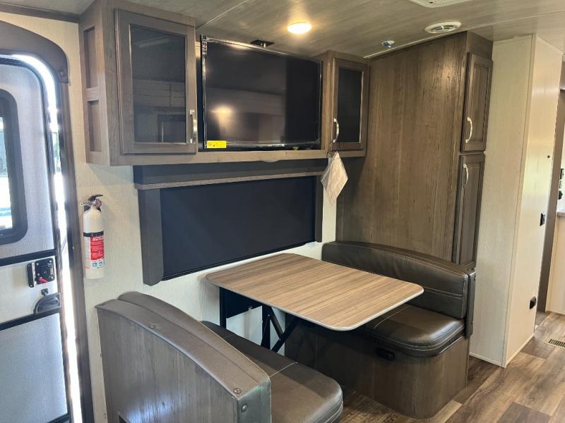With a king-size bed, this Cougar Half-Ton travel trailer shows that you can still be comfortable even while you're away from home! The bed has wardrobes and nightstands on either side, and it also has a privacy curtain to section it off from the rest of the trailer. When you use the LCI Solid Step entry to get inside, you'll notice and appreciate the shoe cubby to your left. Right next to the booth dinette is the pantry, and next to the pantry is the full bathroom which is certainly one of the most valuable features to any trailer.