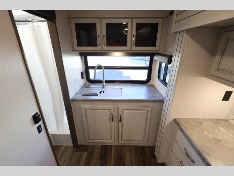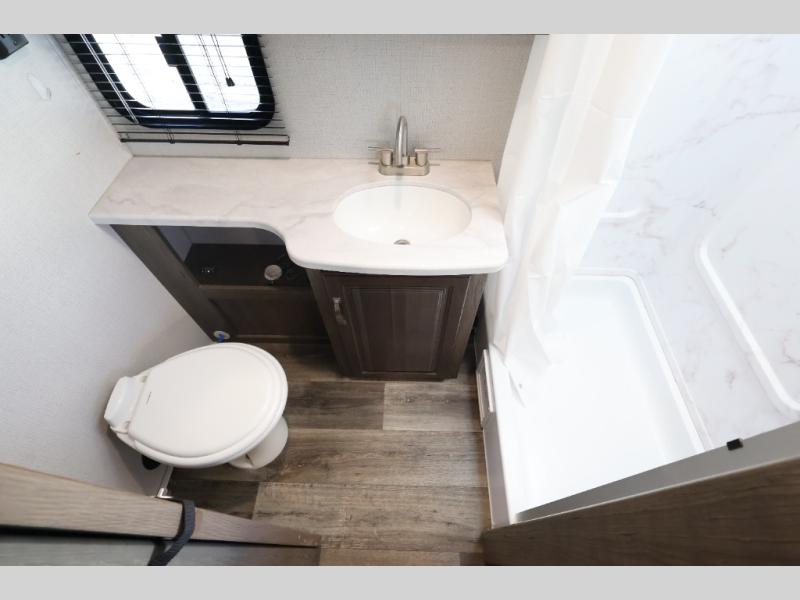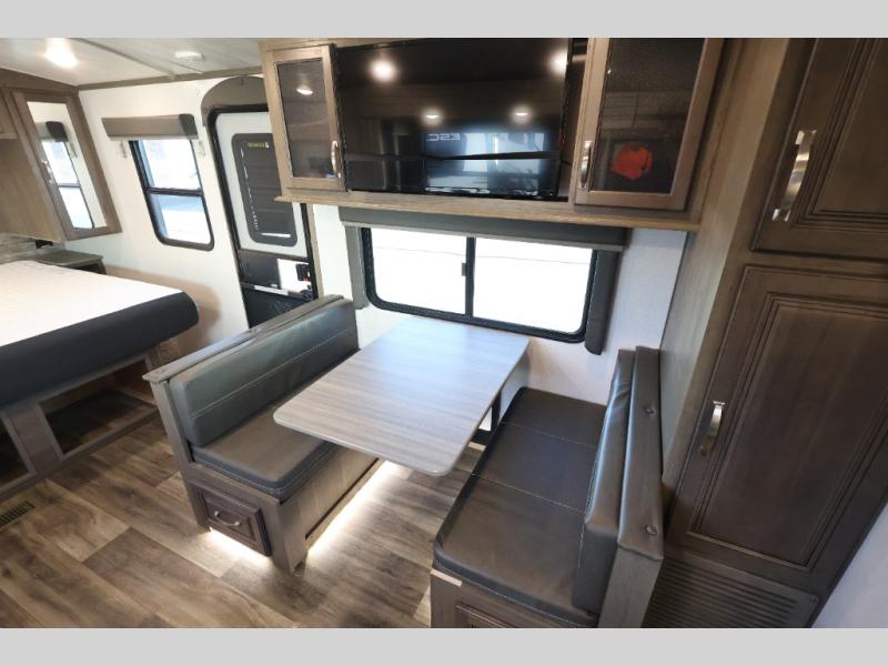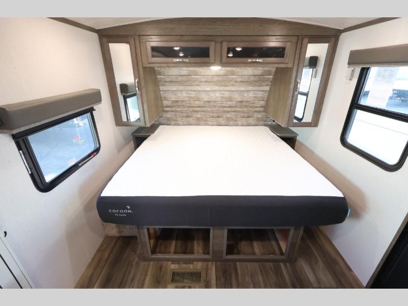 With a king-size bed, this Cougar Half-Ton travel trailer shows that you can still be comfortable even while you're away from home! The bed has wardrobes and nightstands on either side, and it also has a privacy curtain to section it off from the rest of the trailer. When you use the LCI Solid Step entry to get inside, you'll notice and appreciate the shoe cubby to your left. Right next to the booth dinette is the pantry, and next to the pantry is the full bathroom which is certainly one of the most valuable features to any trailer.