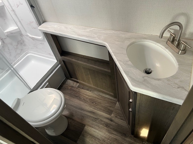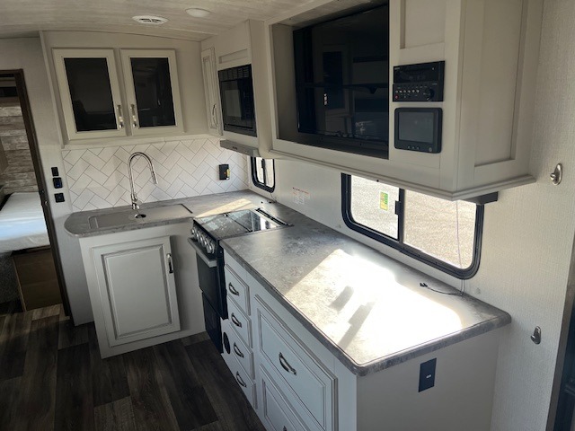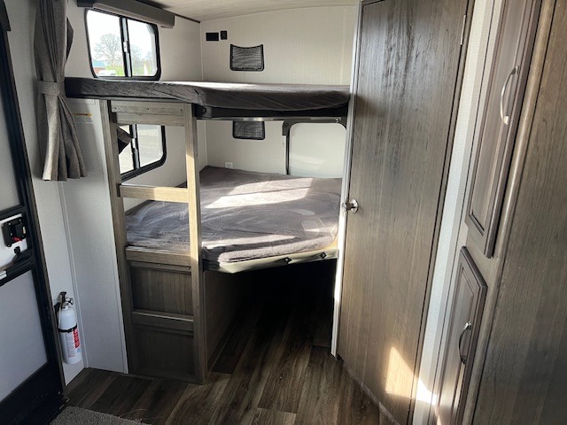 Look no further because this Cougar Half-Ton travel trailer has what you want! With a rear cargo door and pass-through storage, you can bring along loads of gear, and you can also bring along lots of food because the indoor and outdoor kitchen will provide you with plenty of tools to cook it up. At the end of a long and tiresome day, you will want a place to relax, and that is when the king-size bed shines best. This bed is hidden away in a private bedroom so that you can recover peacefully. Your kids can also take a break back on the double-size bunks, and the lower bunk is able to flip up for storage.