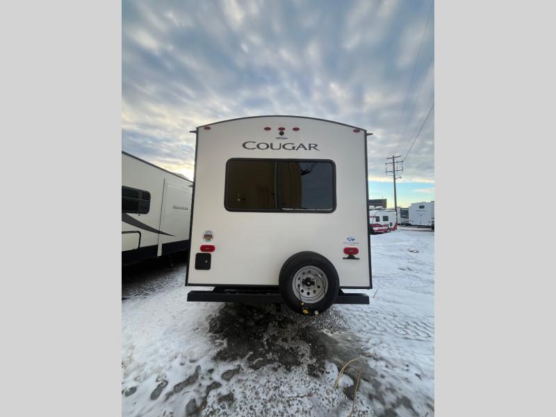 This Cougar Half-Ton travel trailer has an excellent dining area with its huge rear U-shaped dinette! Right next to the dinette is a large slide out that holds the 68" tri-fold sleeper sofa, 8-cubic foot refrigerator, and pantry. The kitchen has been excellently appointed with a Furrion range, foil-wrapped seamless countertops, a stainless steel undermount sink, and a microwave, and you will be grateful that you can access both sides of the walk-through bathroom. The private bedroom is ultra convenient with its exterior entrance, king-size bed, and wardrobe/nightstands on either side of the bed.