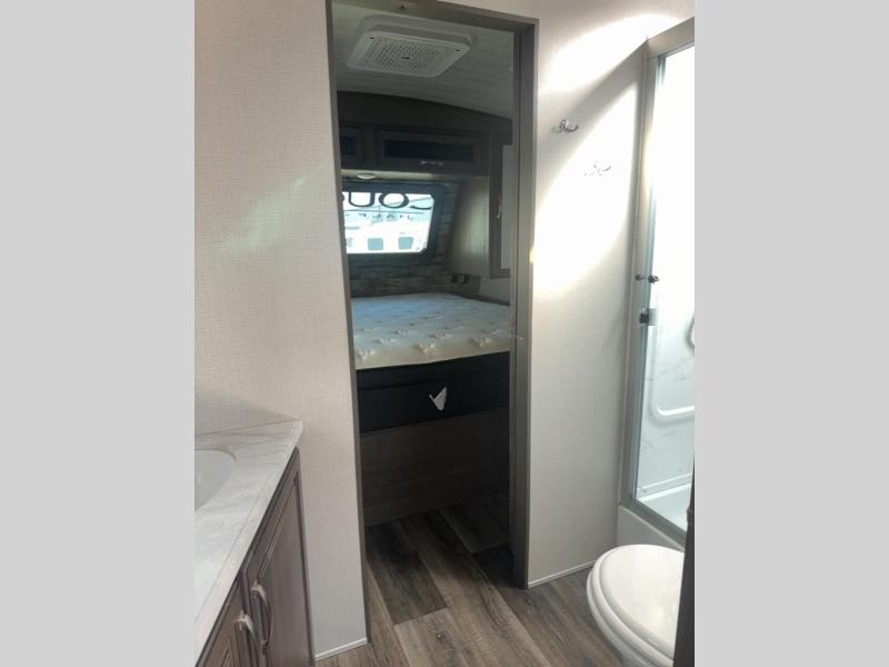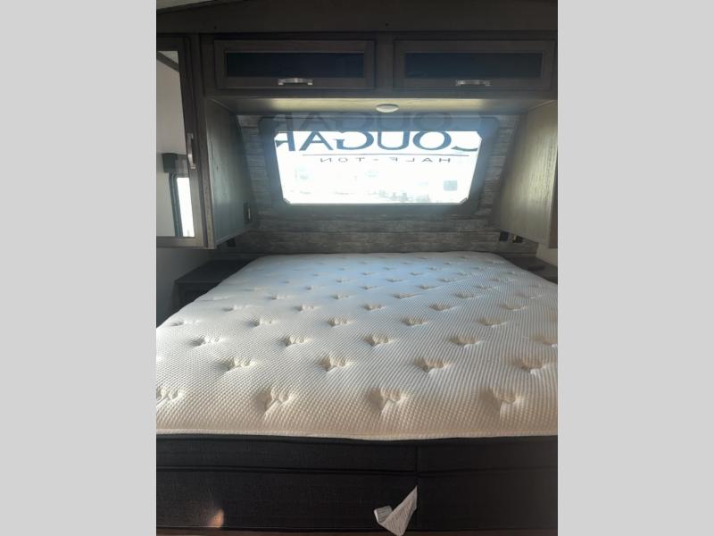 This Cougar Half-Ton travel trailer has an excellent dining area with its huge rear U-shaped dinette! Right next to the dinette is a large slide out that holds the 68" tri-fold sleeper sofa, 8-cubic foot refrigerator, and pantry. The kitchen has been excellently appointed with a Furrion range, foil-wrapped seamless countertops, a stainless steel undermount sink, and a microwave, and you will be grateful that you can access both sides of the walk-through bathroom. The private bedroom is ultra convenient with its exterior entrance, king-size bed, and wardrobe/nightstands on either side of the bed.