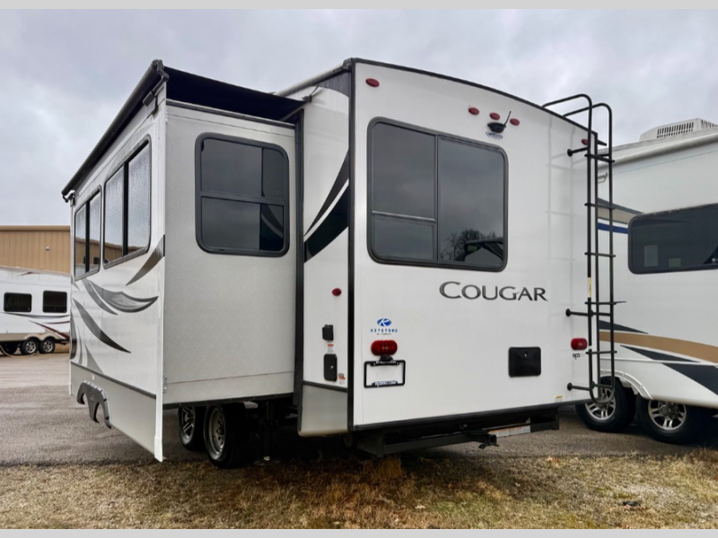 Grab your gear, your family, and your sense of adventure and head out with this Cougar Half-Ton fifth wheel! You'll have plenty of space to bring along your favorite gear with the rear storage compartment, the hidden storage space behind the entertainment center, the linen closet, the wardrobe slide, and the exterior pass-through storage. Plus, you will also find a private bedroom for a quick nap or a night of sleep, and the 68" tri-fold sleeper sofa will be great to have when you have any afternoon visitors turn into overnight guests.