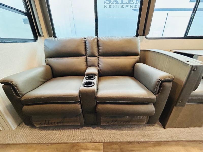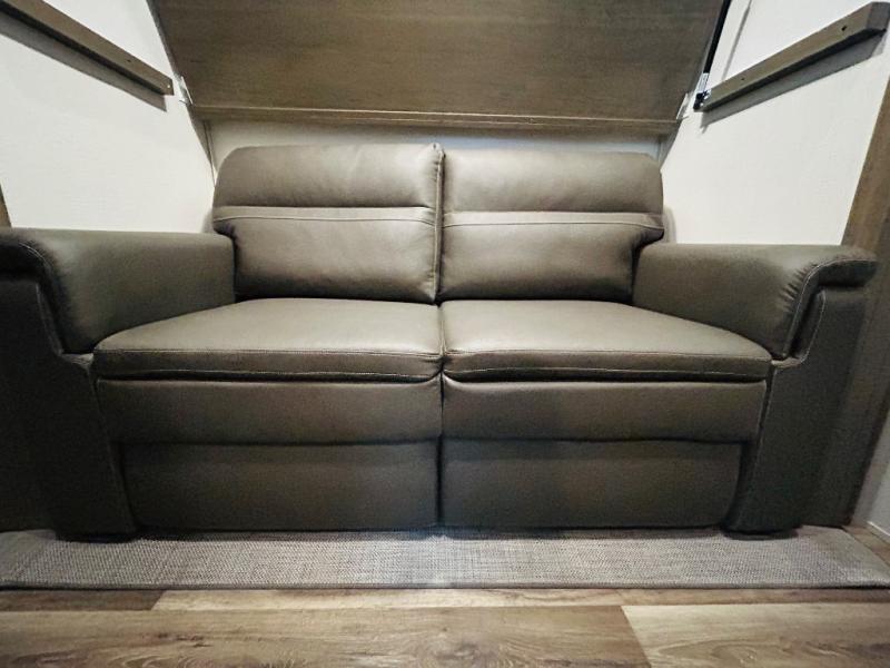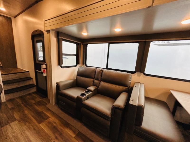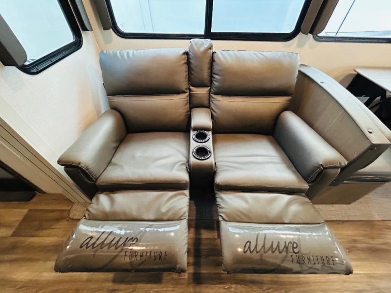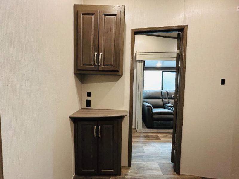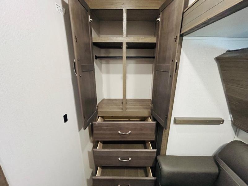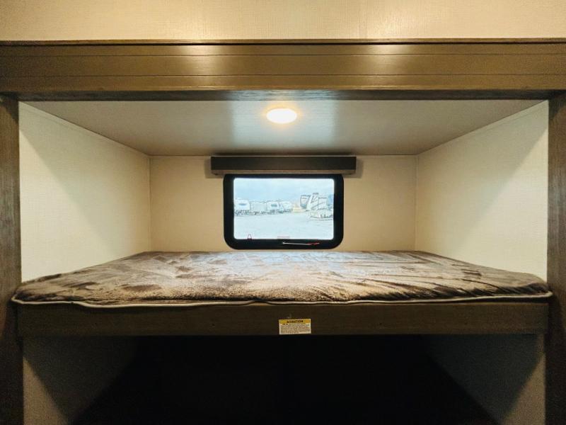 You'll have a new way to vacation once you get this Cougar Half-Ton fifth wheel in the driveway! Because this unit has two bedrooms, you'll be able to sleep separately and comfortably each night. The front private bedroom has a wardrobe slide so that you can store your garments, and the private bunkhouse has a slide out with a flip bunk above a sofa. Plus, there is also a desk top so that you can sit down and get some work done whenever you need.