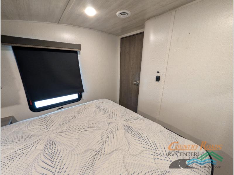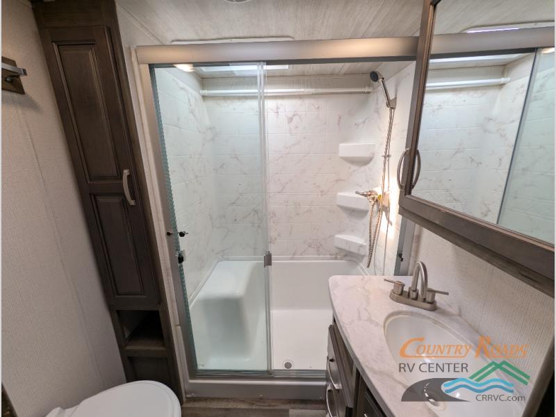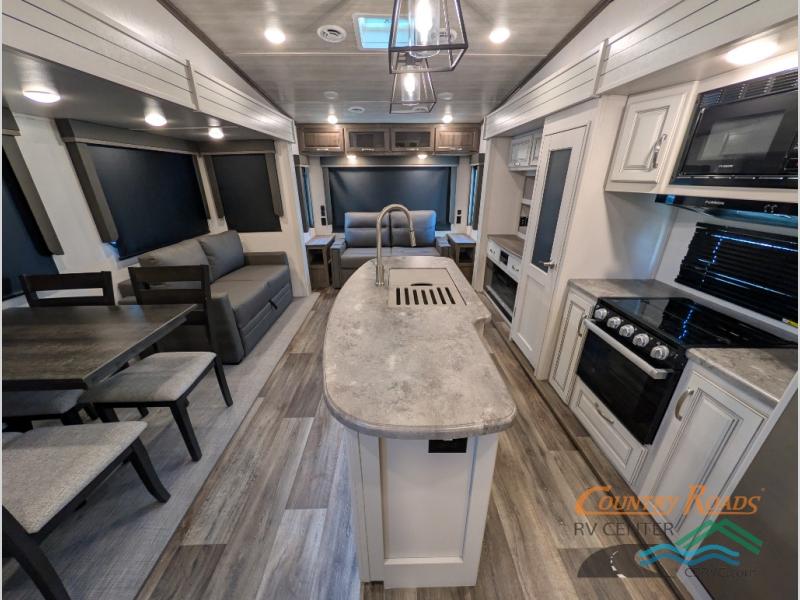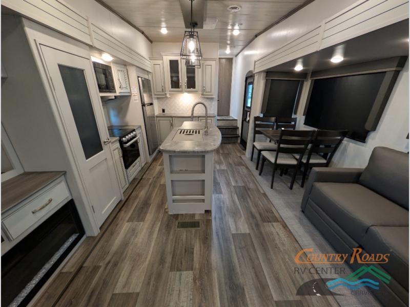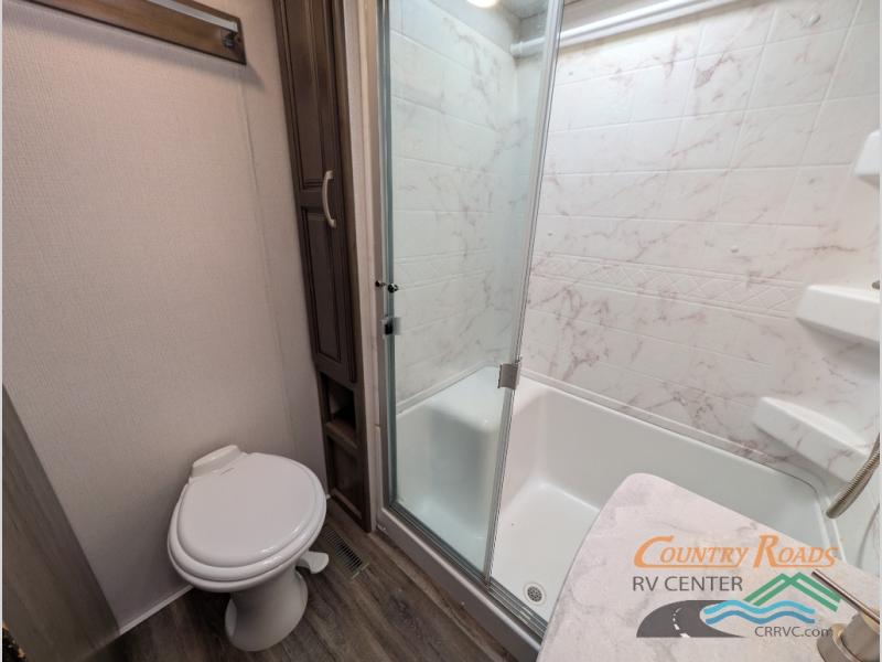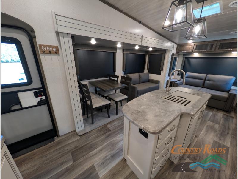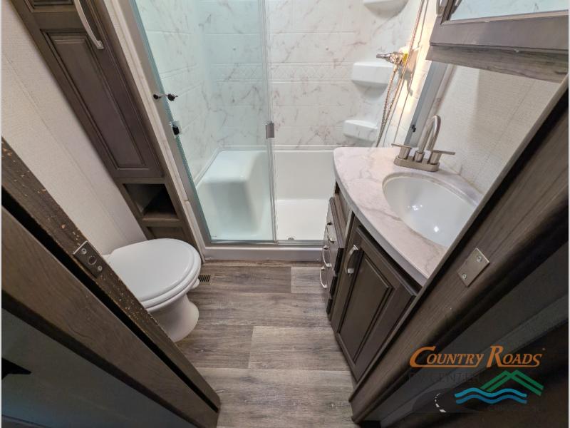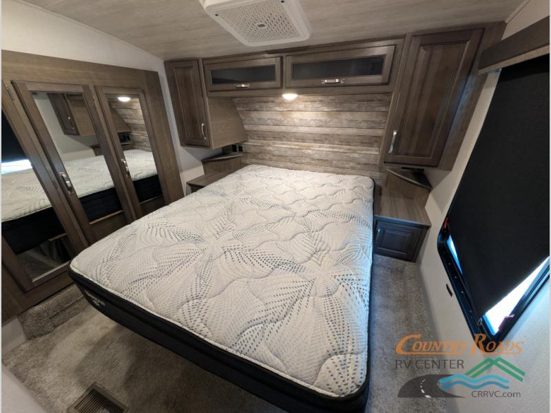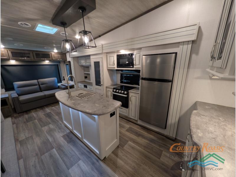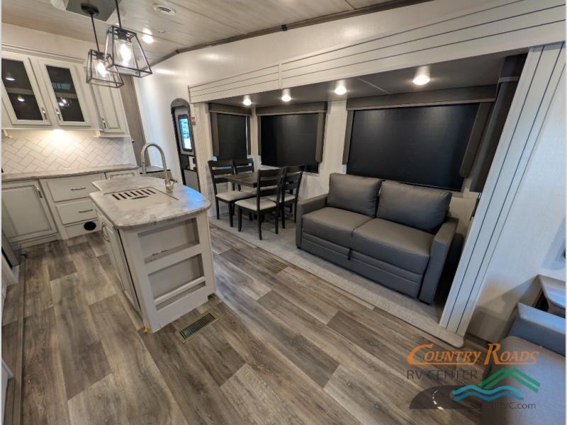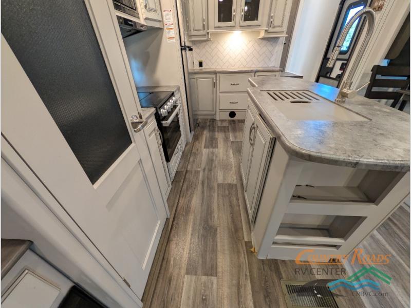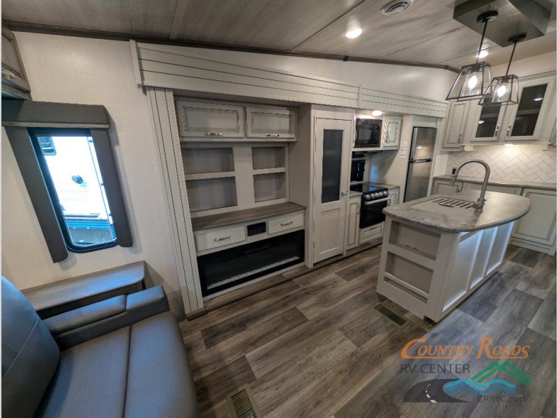 You will have the time of your life in this Cougar Half-Ton fifth wheel! There is so much comfort with the theater seating and 68" tri-fold sleeper sofa with end tables in the living area, and the comfort is taken up a notch with the addition of the fireplace below the entertainment center. You also have lots of space in this area because of the opposing slides, so you can work freely around the kitchen island preparing dinner or washing dishes. The booth dinette is right next to the kitchen, so you won't have to go far to set the table. If you don't need the dinette to serve as a bed, then you might be interested in switching it out for the optional free-standing table with chairs. The pantry is big enough to keep your favorite foods stored away, and the 8-cubic foot refrigerator can hold the items that need to be kept chilled.