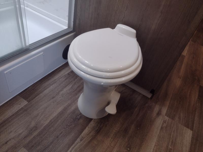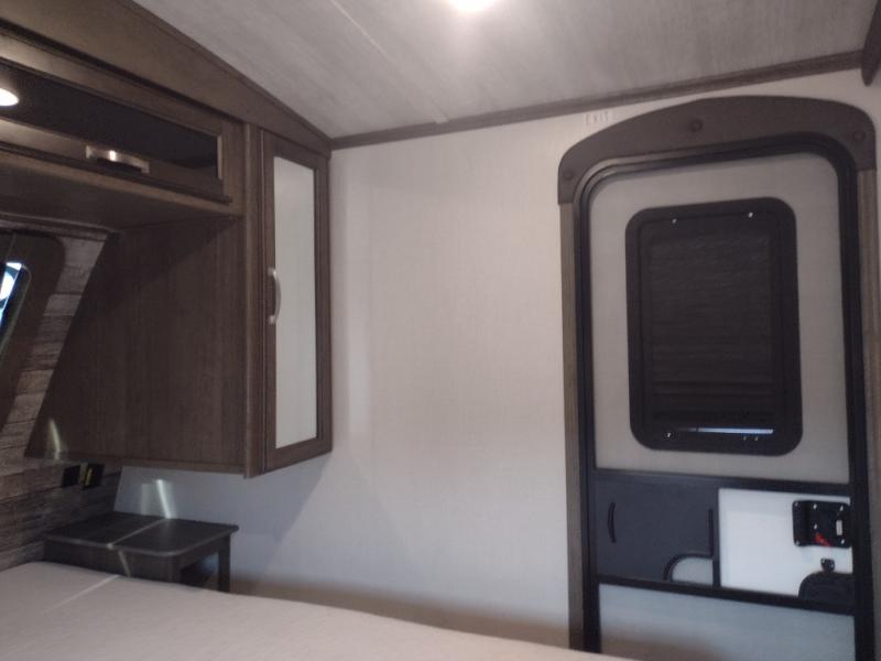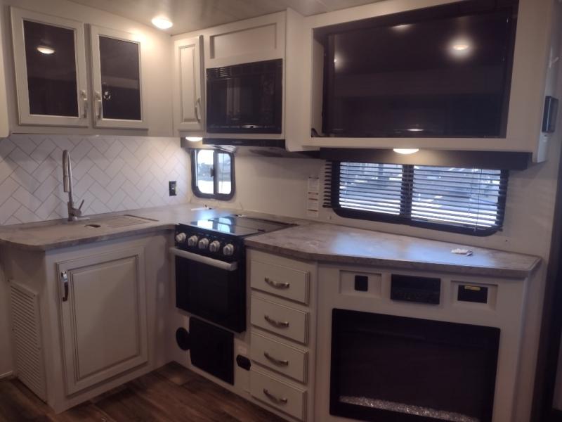 You're going to love camping with friends or family in this spacious travel trailer. There are double-size bunks in the back, and the lower bunk flips up for storage of luggage, camp gear, or toys. The group can relax in the main living area that includes a tri-fold sleeper sofa within the large slide out, plus there is an L-shaped booth dinette with an ottoman/bench seat for a unique set-up. There is even a fireplace and an LED HDTV for those rainy days you stay indoors. This model includes all the appliances indoors needed to prepare meals each day, plus there is a capital grill outdoors and an exterior mini fridge for cold drinks. And check out the 19' power awning that will shade you as you cook up lunch!