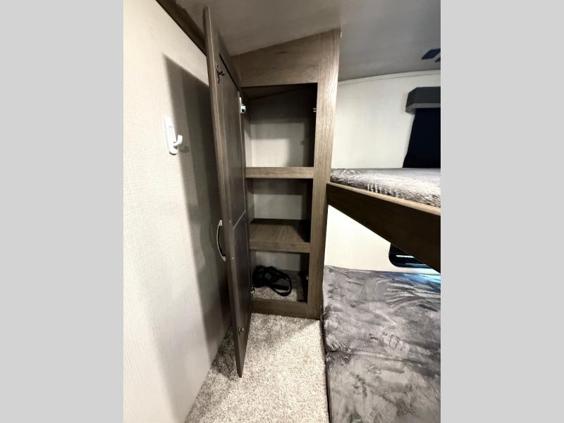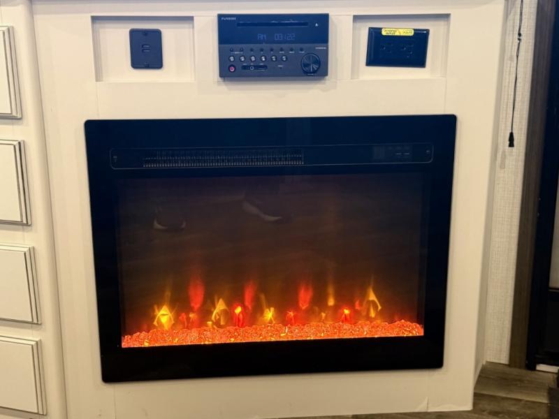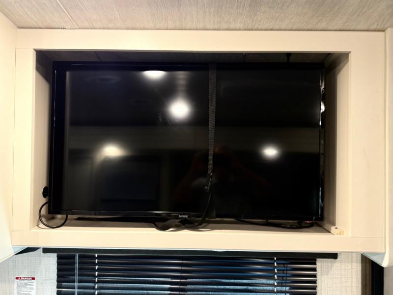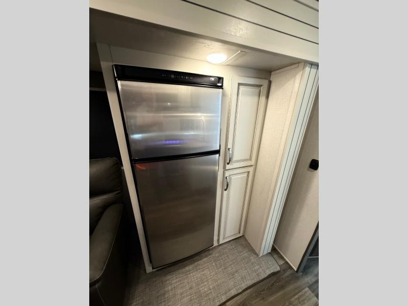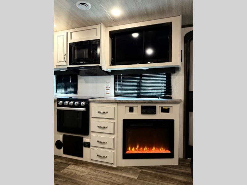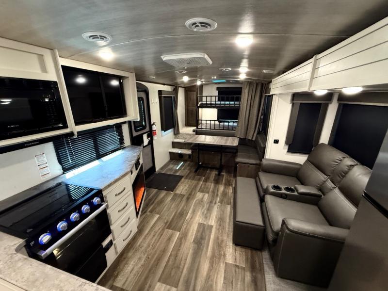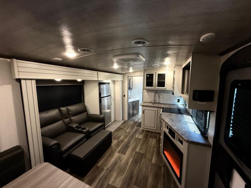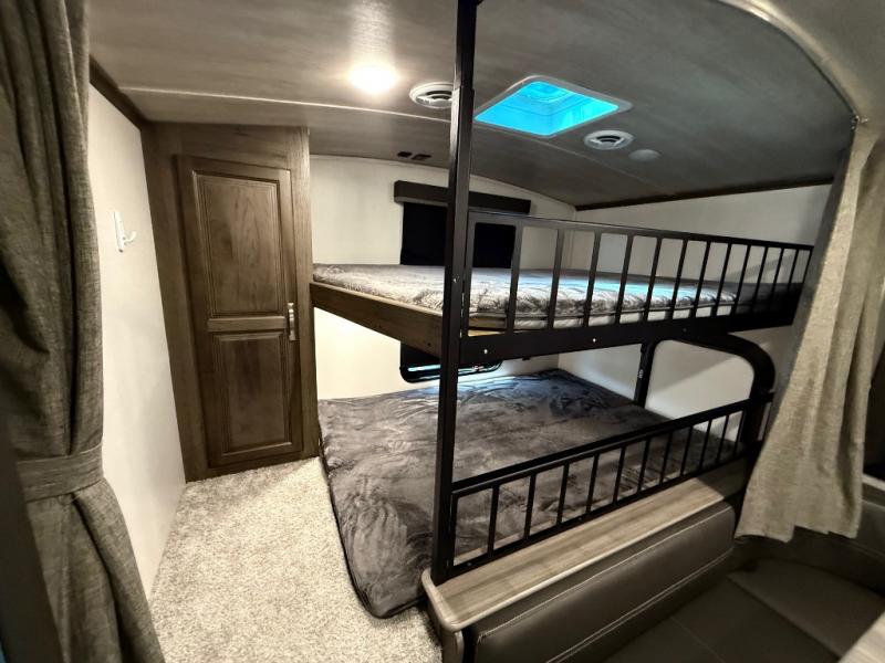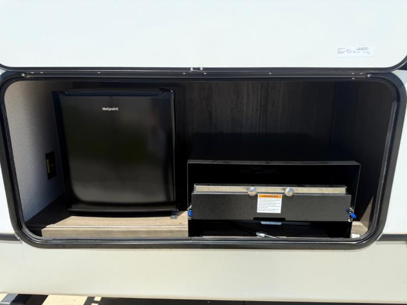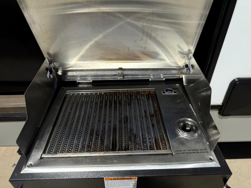You're going to love camping with friends or family in this spacious travel trailer. There are double-size bunks in the back, and the lower bunk flips up for storage of luggage, camp gear, or toys. The group can relax in the main living area that includes a tri-fold sleeper sofa within the large slide out, plus there is an L-shaped booth dinette with an ottoman/bench seat for a unique set-up. There is even a fireplace and an LED HDTV for those rainy days you stay indoors. This model includes all the appliances indoors needed to prepare meals each day, plus there is a capital grill outdoors and an exterior mini fridge for cold drinks. And check out the 19' power awning that will shade you as you cook up lunch!
