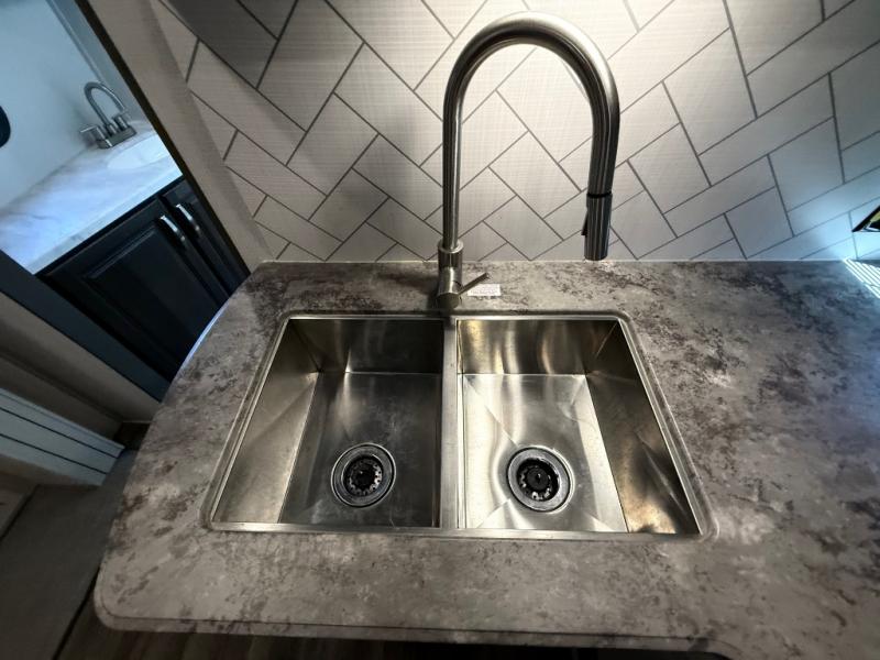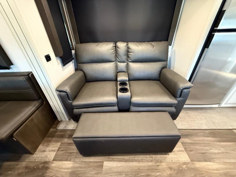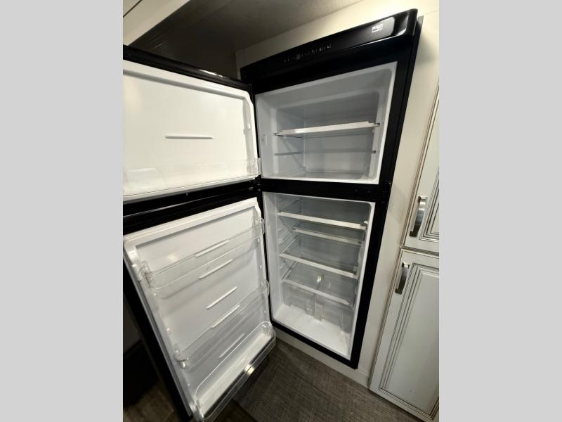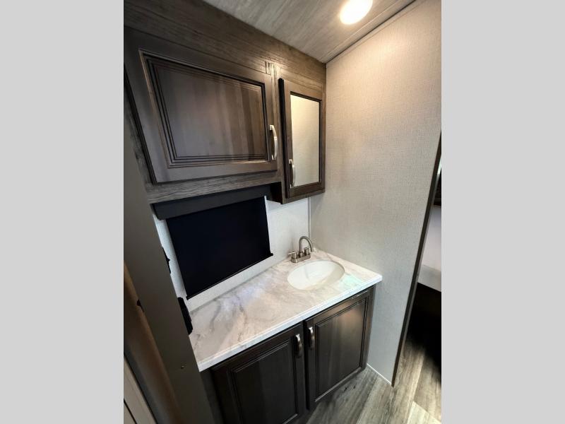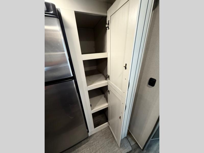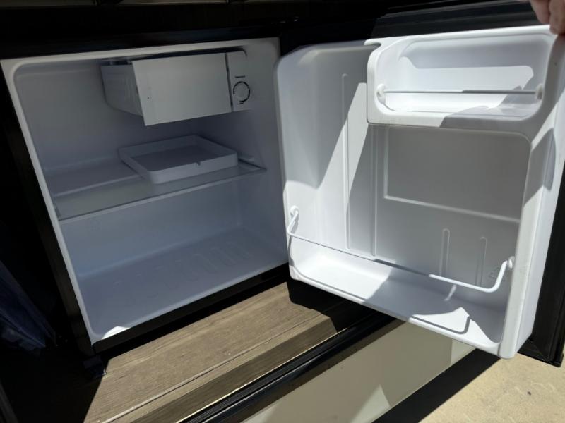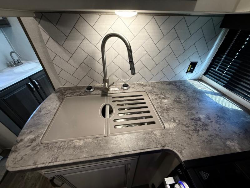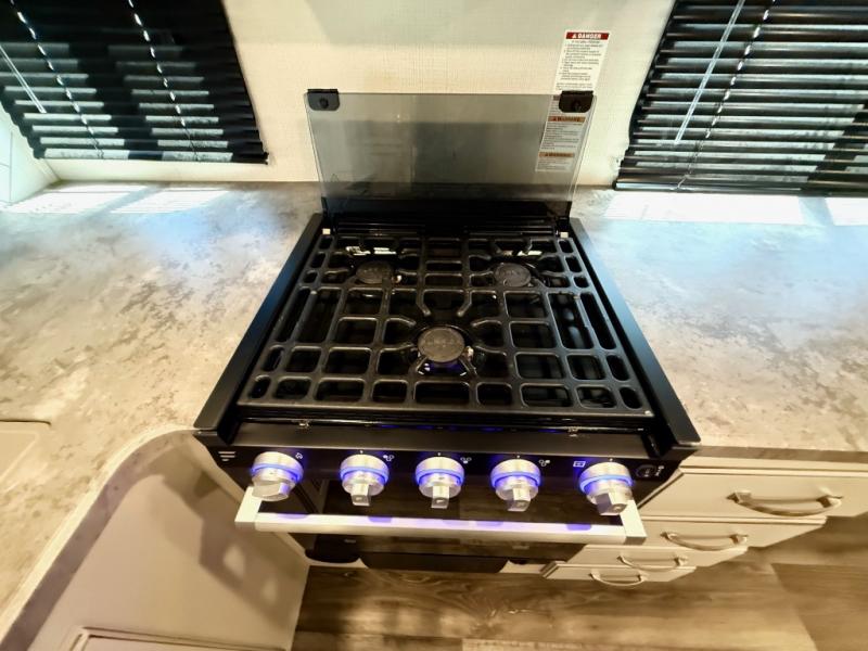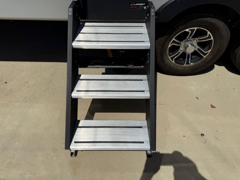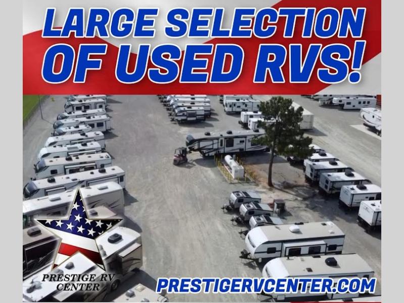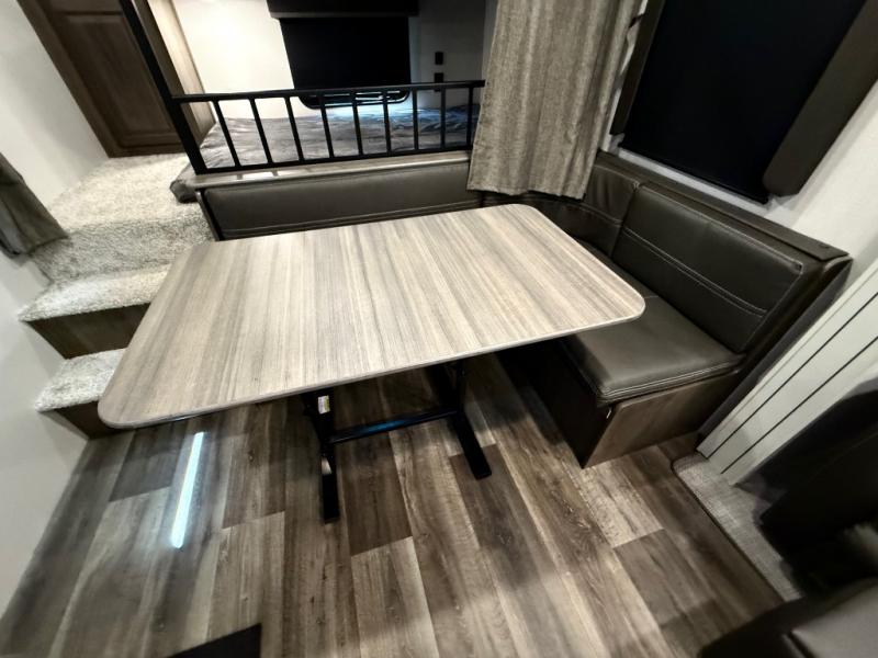 You're going to love camping with friends or family in this spacious travel trailer. There are double-size bunks in the back, and the lower bunk flips up for storage of luggage, camp gear, or toys. The group can relax in the main living area that includes a tri-fold sleeper sofa within the large slide out, plus there is an L-shaped booth dinette with an ottoman/bench seat for a unique set-up. There is even a fireplace and an LED HDTV for those rainy days you stay indoors. This model includes all the appliances indoors needed to prepare meals each day, plus there is a capital grill outdoors and an exterior mini fridge for cold drinks. And check out the 19' power awning that will shade you as you cook up lunch!