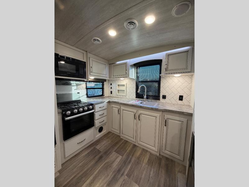 How does a king bed slide within a master suite sound? With this Cougar Half-Ton travel trailer, you'll have extra floor space and a full-width wardrobe allowing you to stay at your favorite campsite for long periods of time. The second slide located in the main living and kitchen area opens up this space for you to enjoy time spent inside just as much as outdoor adventures. The furniture even doubles as sleeping space for the kids or overnight guests. The rear kitchen layout is a convenience, and you will appreciate all the counter space for preparing and serving meals. You will find hidden storage behind the entertainment center, and next to the entertainment center is a pantry where you can store your favorite snacks.