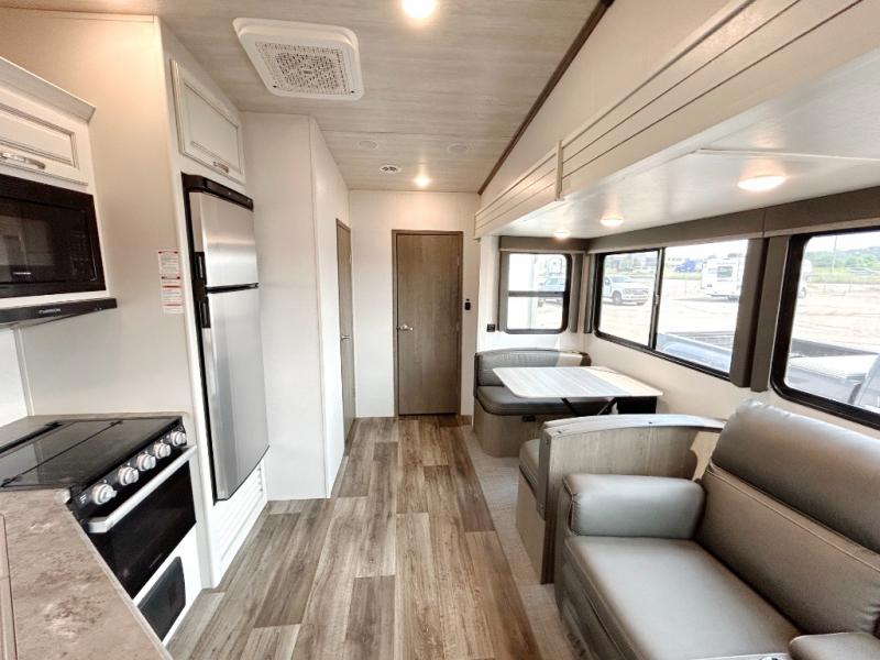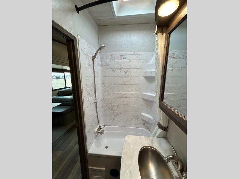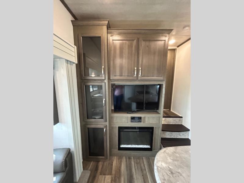 You won't have any trouble convincing your friends or family to join you on an adventure with this Cougar Half-Ton fifth wheel! Since this unit has both a full and a half bathroom, it will be easy for everyone to get ready in the morning, and the 21" Furrion range will allow you to whip up a full batch of pancakes for your guests. Store any leftovers in the 8-cubic foot refrigerator before heading out on your next exciting expedition. If you need your backpacks and hiking gear, you can grab them from the exterior pass-through storage, and you can create a cozy living area by adding the optional fireplace.