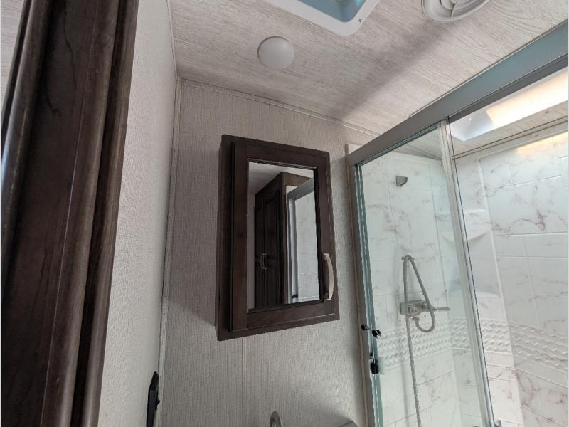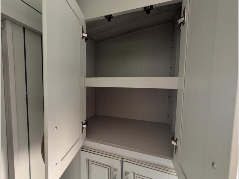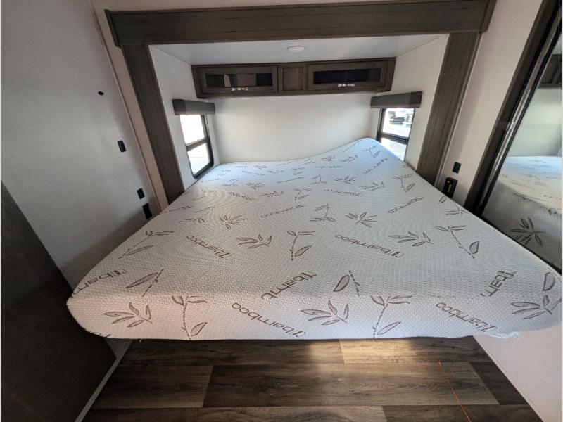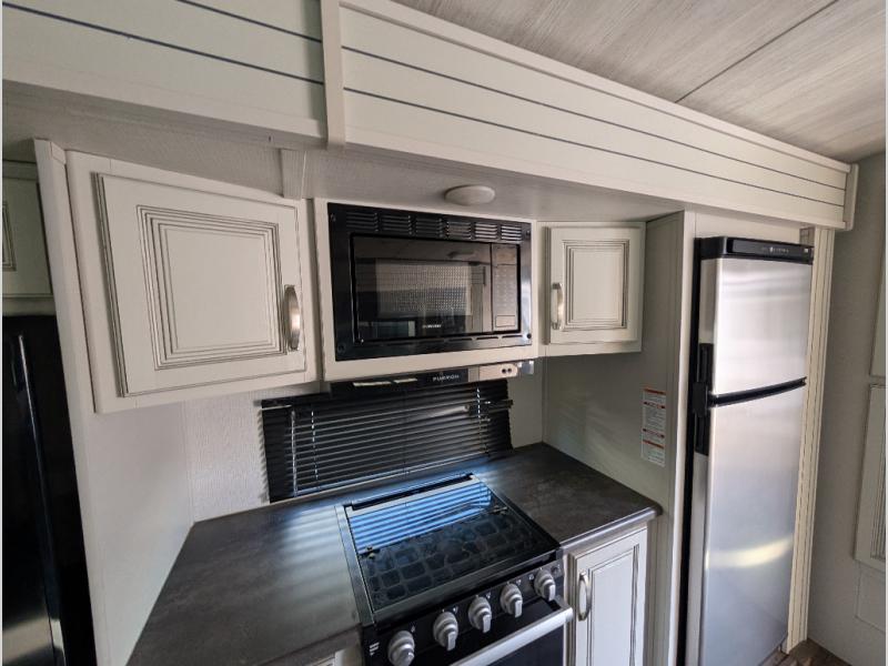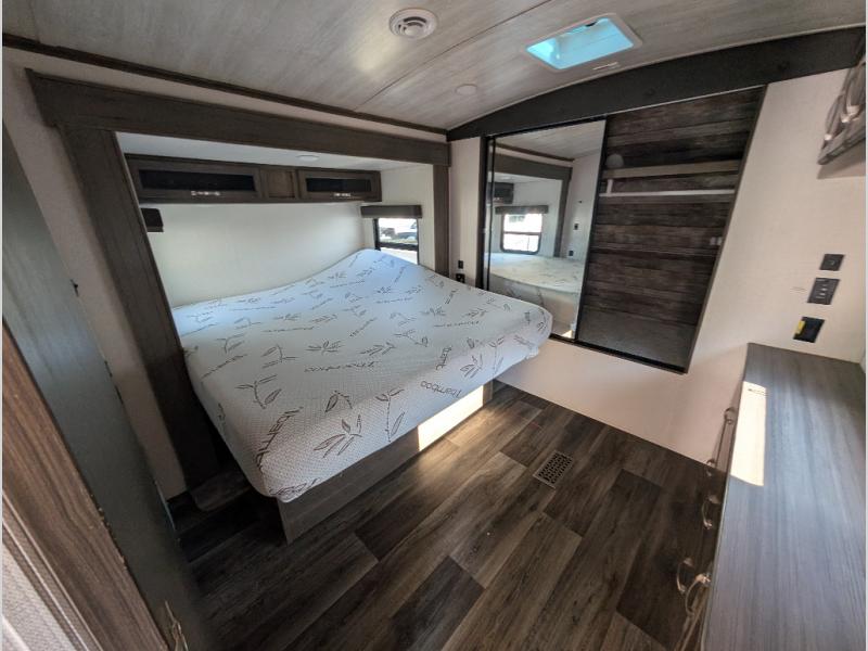 You'll definitely want to snatch up this Cougar Half-Ton travel trailer if you're a couple or small family that wants to live in comfort while at the campsite! There is a private bedroom at the front, and it has a king bed slide, full-width wardrobe, entertainment center, and bench seat which will give you those residential vibes. Right next to the bedroom is a full bathroom that comes with a linen closet prepped for a washer/dryer. The main living area is what truly gives you the royal treatment because it has theater seating directly across from the entertainment center and fireplace, a kitchen island that you can gather around when it's snack time, a booth dinette that will serve as a bed or a dinner table, and a 68" tri-fold sleeper sofa with end tables for your glass of wine. The kitchen also has a pantry, so you can keep your trailer stocked with goodies throughout the whole trip.