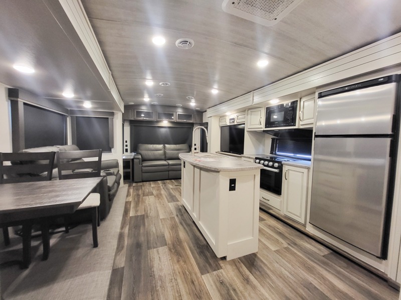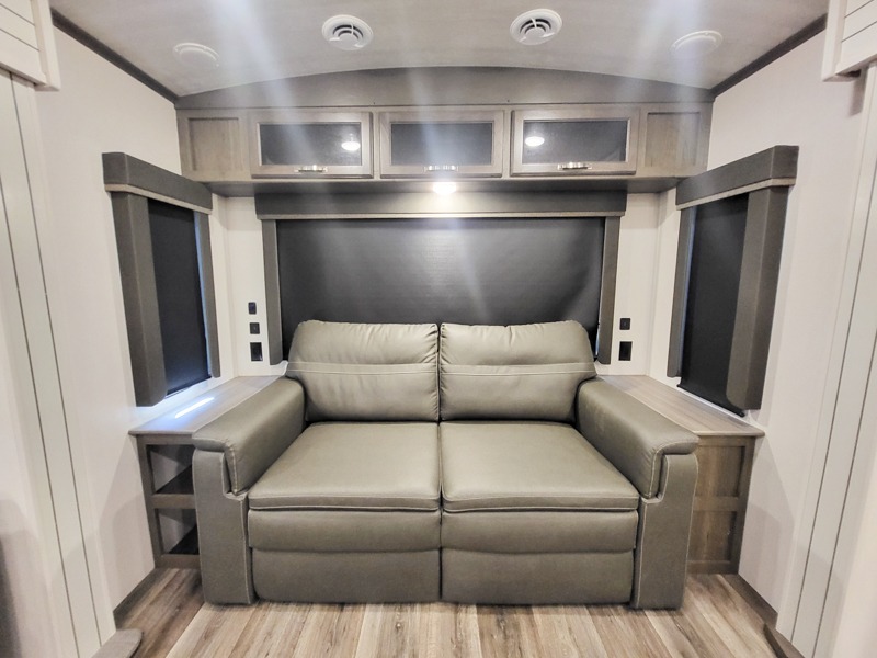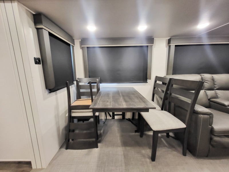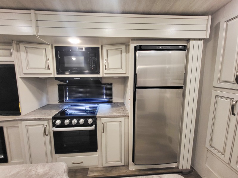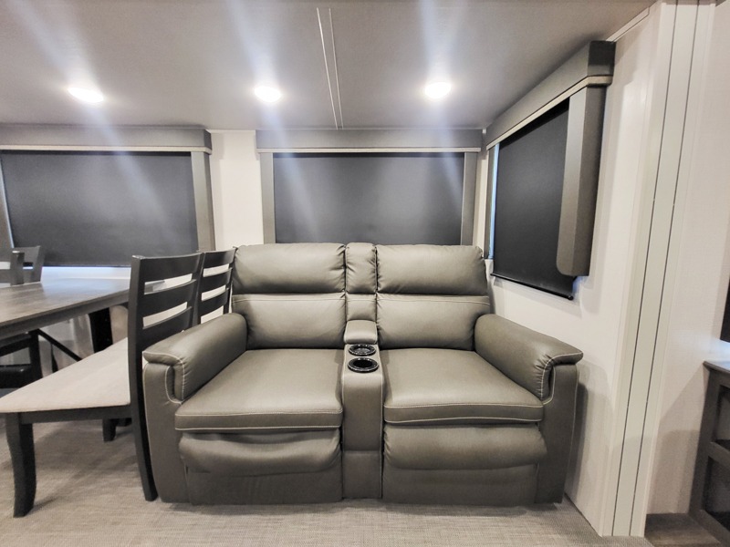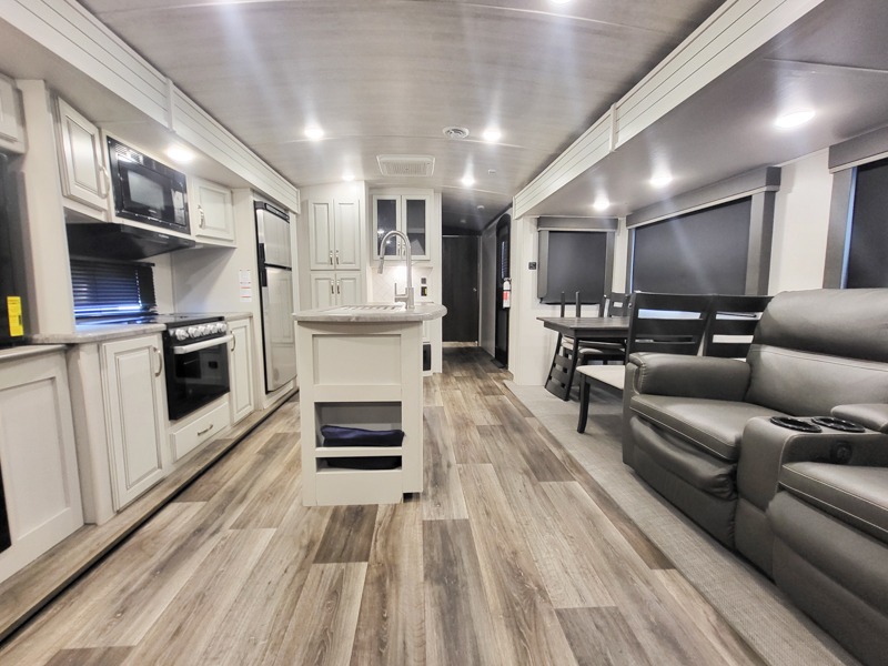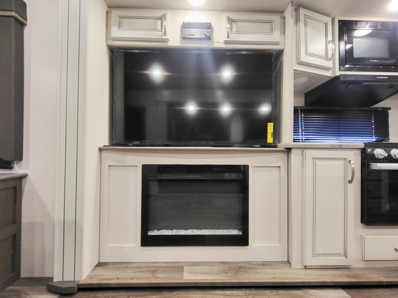 You'll definitely want to snatch up this Cougar Half-Ton travel trailer if you're a couple or small family that wants to live in comfort while at the campsite! There is a private bedroom at the front, and it has a king bed slide, full-width wardrobe, entertainment center, and bench seat which will give you those residential vibes. Right next to the bedroom is a full bathroom that comes with a linen closet prepped for a washer/dryer. The main living area is what truly gives you the royal treatment because it has theater seating directly across from the entertainment center and fireplace, a kitchen island that you can gather around when it's snack time, a booth dinette that will serve as a bed or a dinner table, and a 68" tri-fold sleeper sofa with end tables for your glass of wine. The kitchen also has a pantry, so you can keep your trailer stocked with goodies throughout the whole trip.