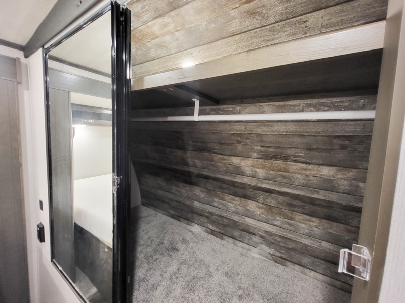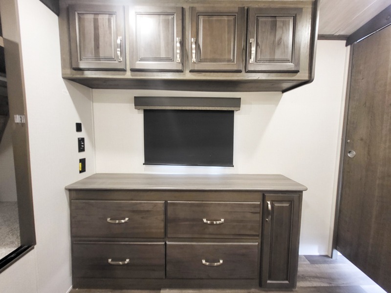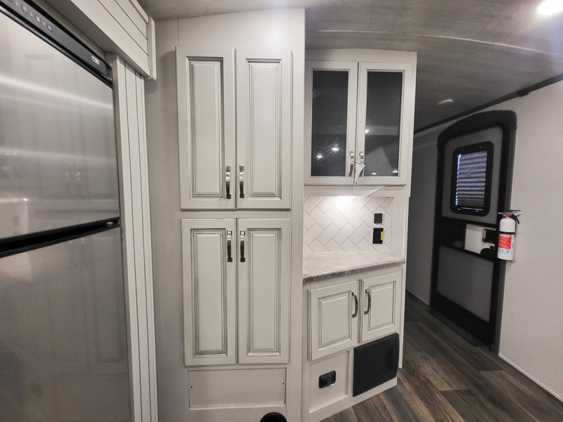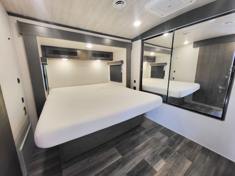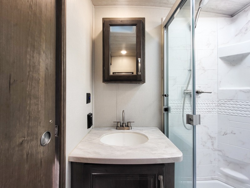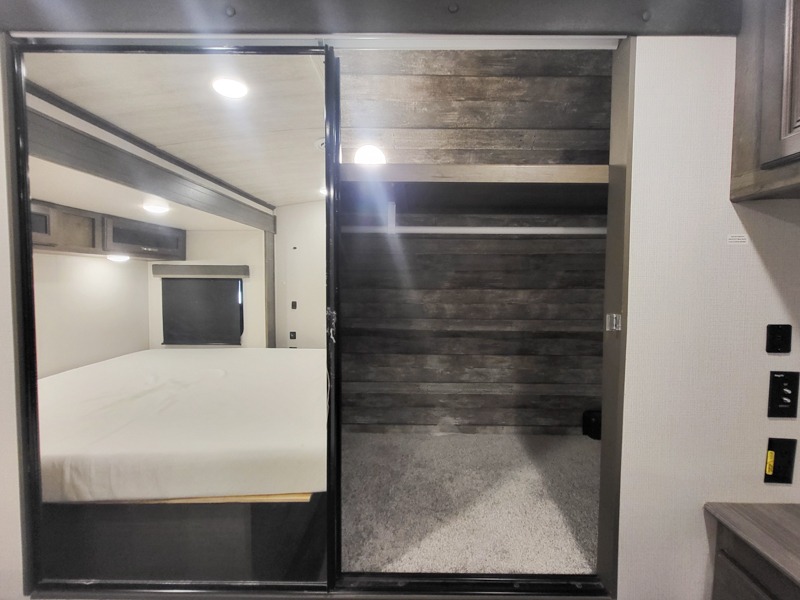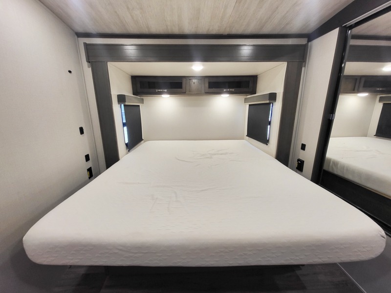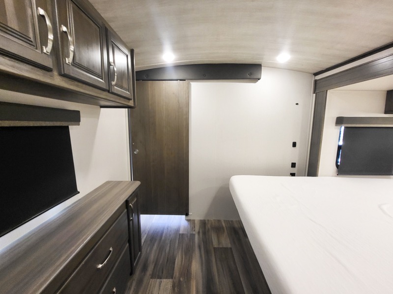 You'll definitely want to snatch up this Cougar Half-Ton travel trailer if you're a couple or small family that wants to live in comfort while at the campsite! There is a private bedroom at the front, and it has a king bed slide, full-width wardrobe, entertainment center, and bench seat which will give you those residential vibes. Right next to the bedroom is a full bathroom that comes with a linen closet prepped for a washer/dryer. The main living area is what truly gives you the royal treatment because it has theater seating directly across from the entertainment center and fireplace, a kitchen island that you can gather around when it's snack time, a booth dinette that will serve as a bed or a dinner table, and a 68" tri-fold sleeper sofa with end tables for your glass of wine. The kitchen also has a pantry, so you can keep your trailer stocked with goodies throughout the whole trip.