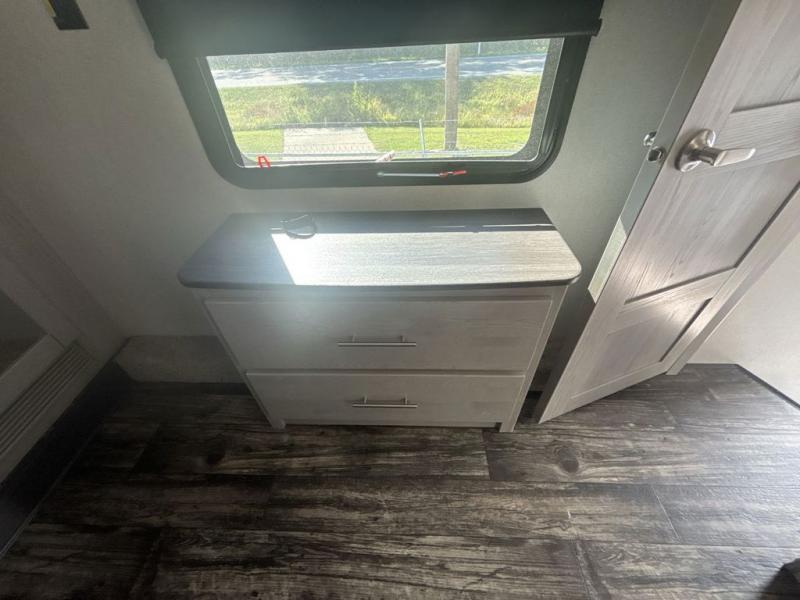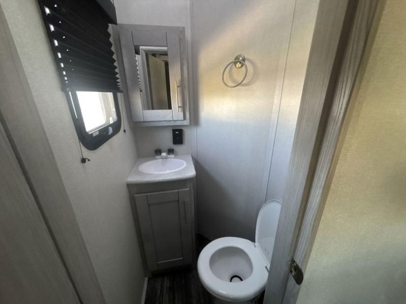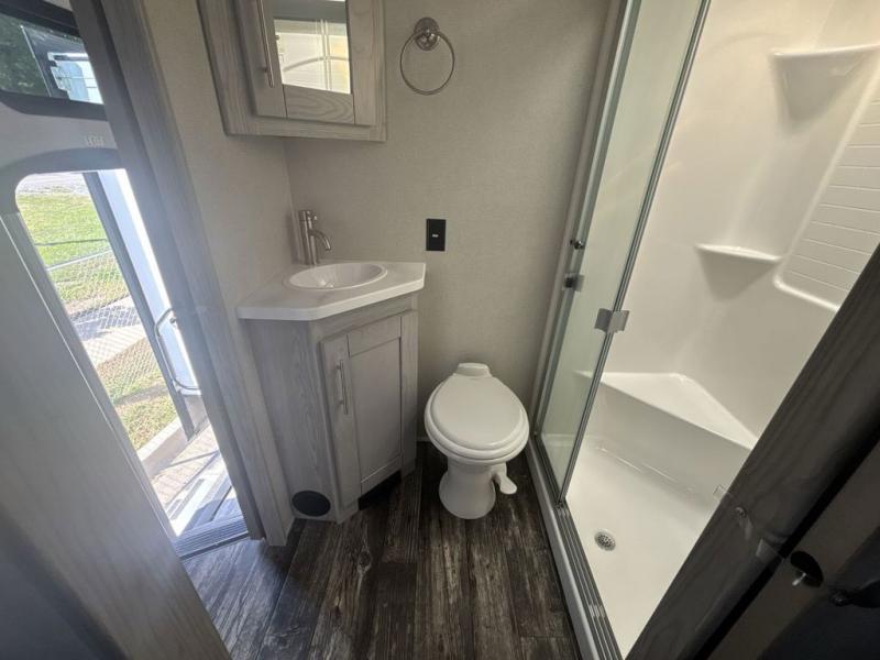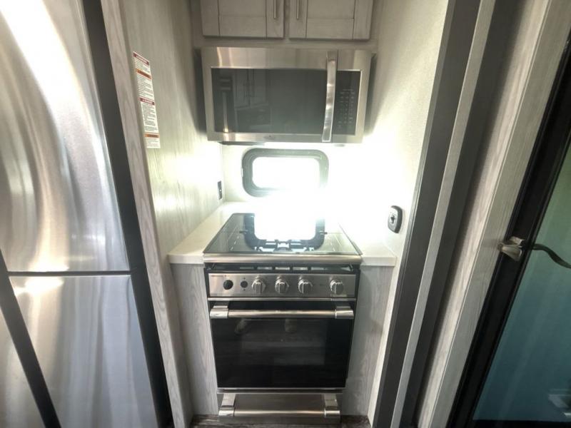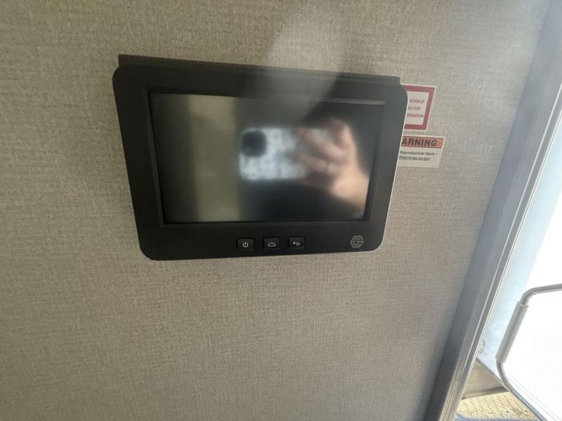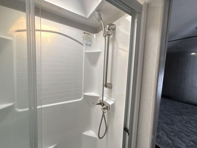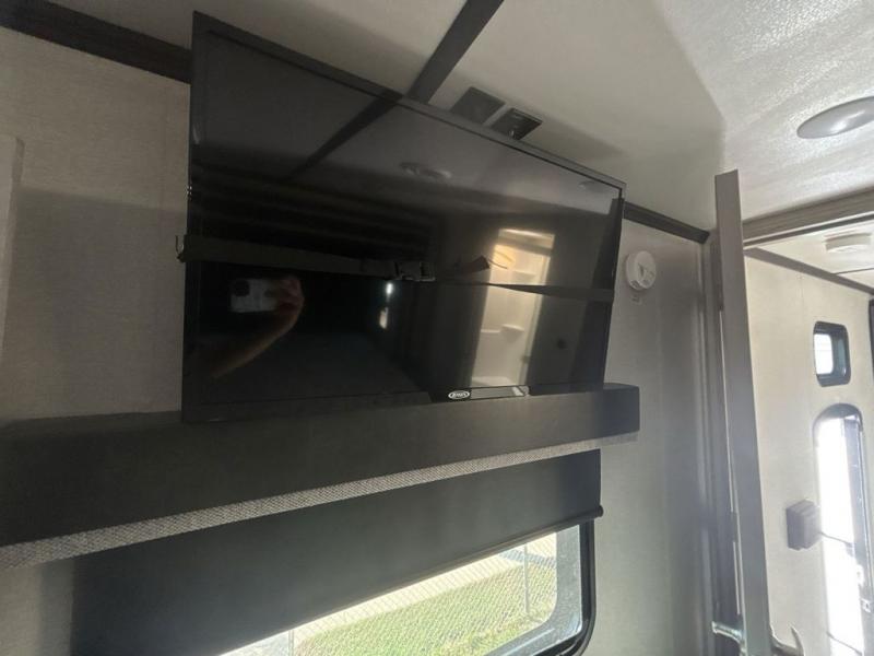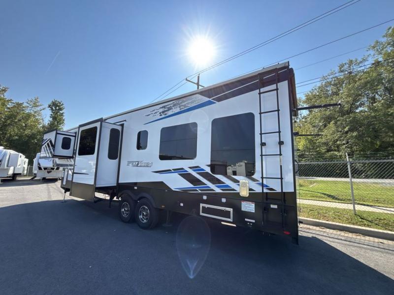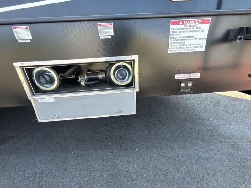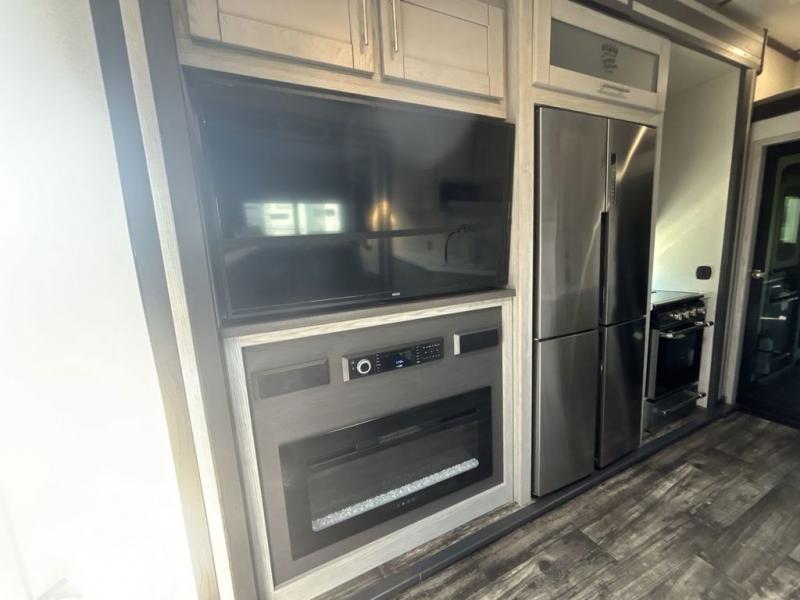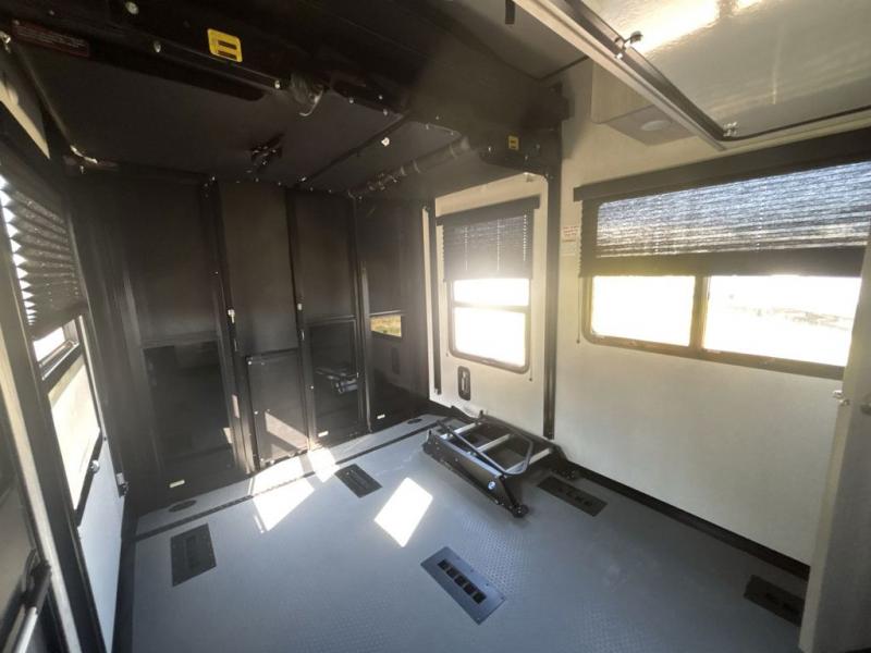 This toy hauler is packed with handy features! Starting with the 11' garage area that has dual opposing sofas with a queen bed above them, an LED TV, a loft with a bunk mat, a half bathroom, and one of the dual entrance doors to the unit. The kitchen slide not only opens up the living space, but also has a three burner range with a convection microwave above, a stainless steel refrigerator, and an entertainment center with an LED TV and fireplace all of which is across from the theater seating slide and a hide-a-bed sofa. There is even an outdoor entertainment center with an LED TV, a pull-out cooktop, and a refrigerator to keep your beverages cold while you watch the big game. When you're ready to wind down your nights, clean up in the dual entry bathroom with the residential shower with a seat then head directly into the front private bedroom to lay your head on the residential queen bed slide with USB ports on either side, plus there is a front master closet that is prepped to add an optional washer and dryer!
