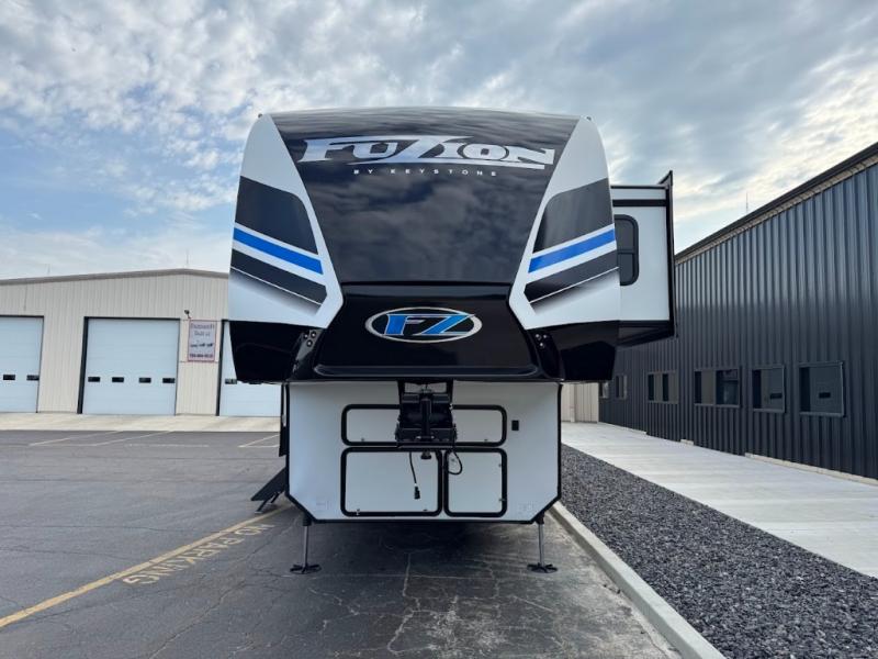 Get your adrenaline pumping with any one of these Keystone RV Fuzion fifth wheel toy haulers! The frame welded, Adjust-A-Trac tie-downs have 38 points to fully secure your toys as you travel, and the extended garage lengths have outside storage so you can haul bigger toys. A fully enclosed fuel pump station is integrated with the iN-Command smart RV control system with Global Connect. The equalizer six-point hydraulic leveling system makes setting up a breeze. And the exclusive Omni-Chill technology offers high-efficiency air conditioning and maximum cooling. The interior provides fiberglass backed linoleum flooring, extra-tall slide height, solid wood cabinet and drawer frames, and extra tall ceilings with crown molding to mention a few attention to details features. Choose a Fuzion because you want to be seen with the best RV garage for power sports enthusiasts and enjoy comfort and amenities when you are away!