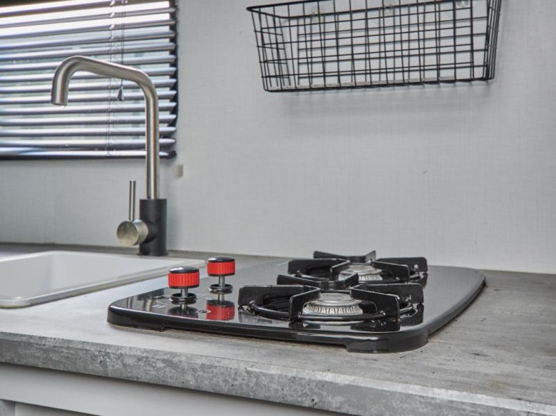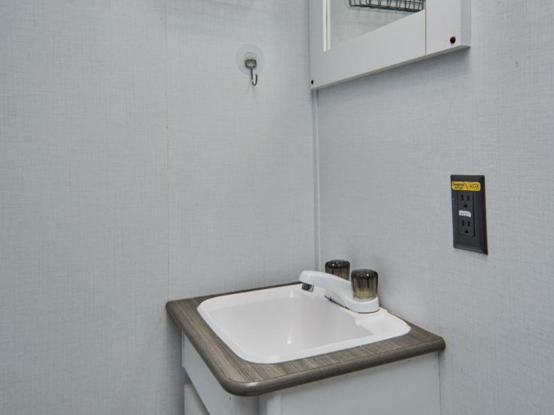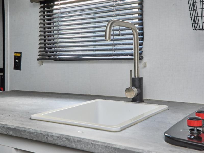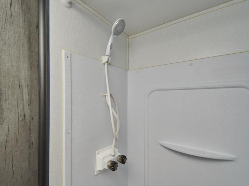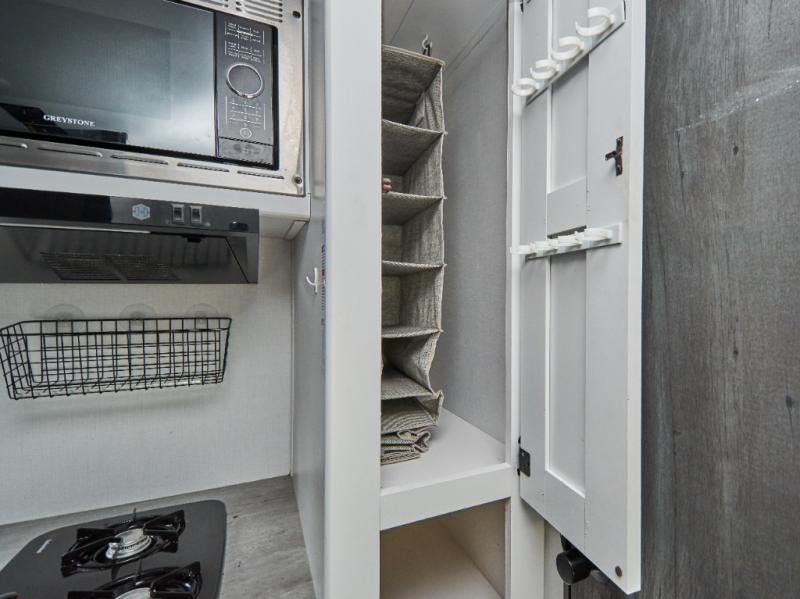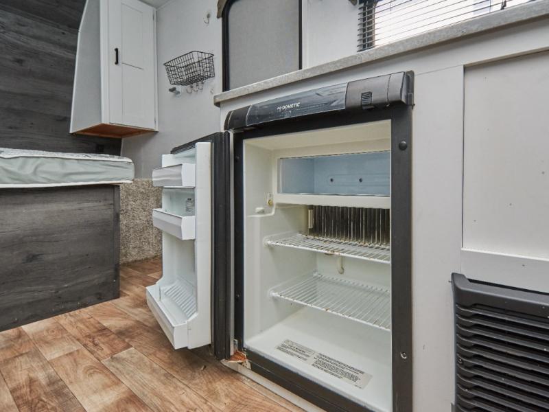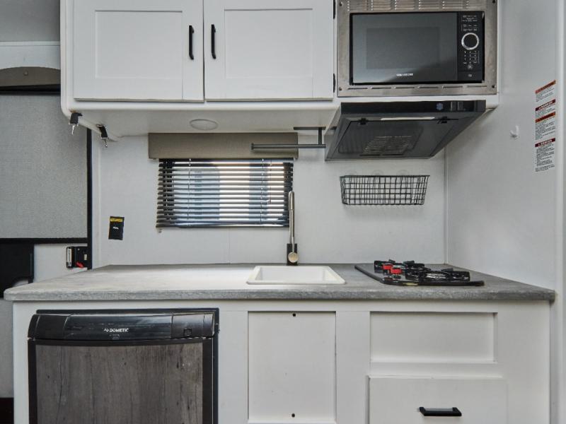 Inside, the galley kitchen includes everything you need to prepare meals on the road, including a pantry for dry goods and a refrigerator for cold items. The full bathroom adds convenience with a tub and shower combo, making cleanup easy after a day of adventure.