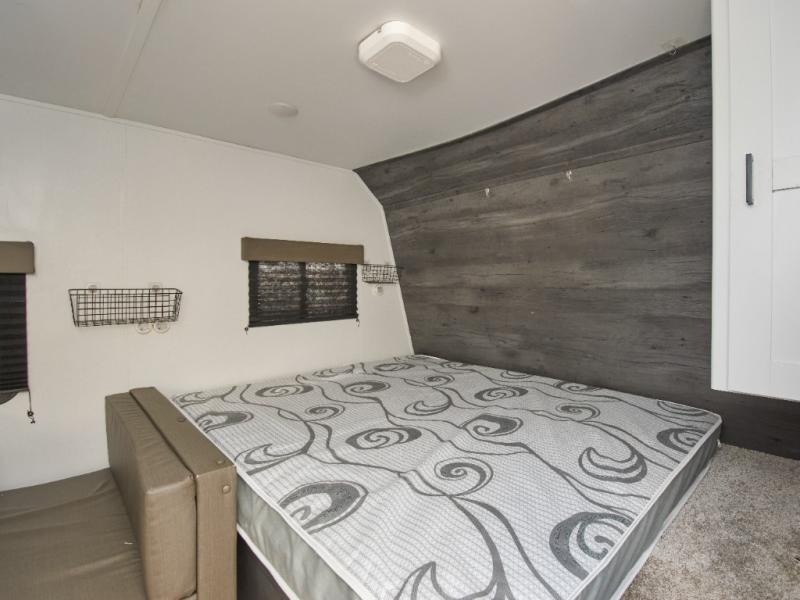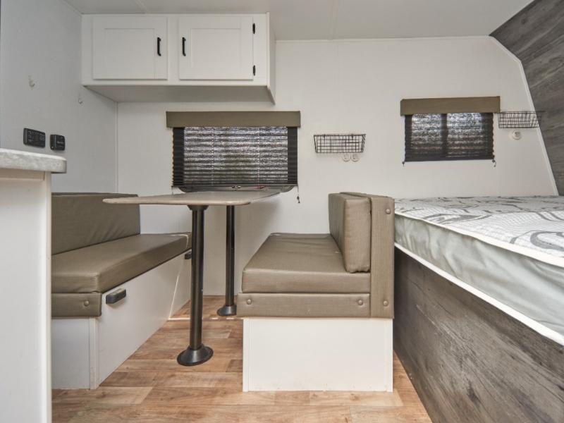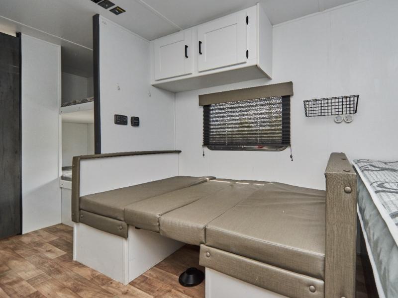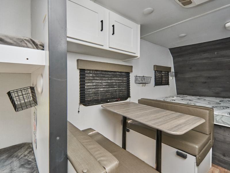 - Sleeps up to five with bunk beds, queen-size bed, and convertible dinette
