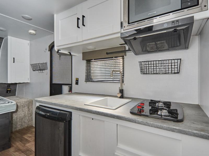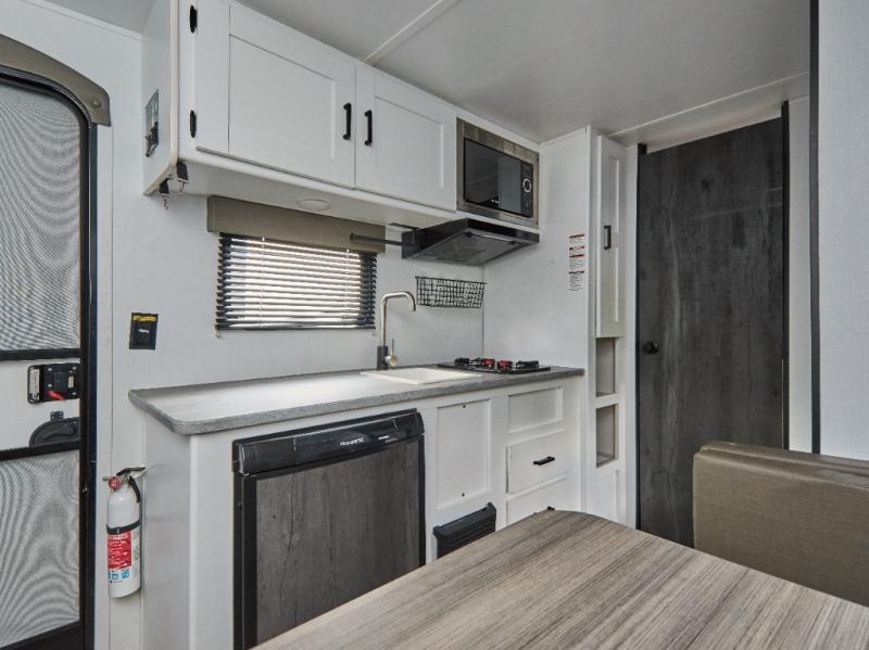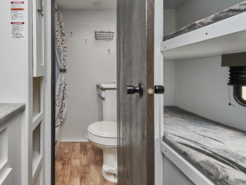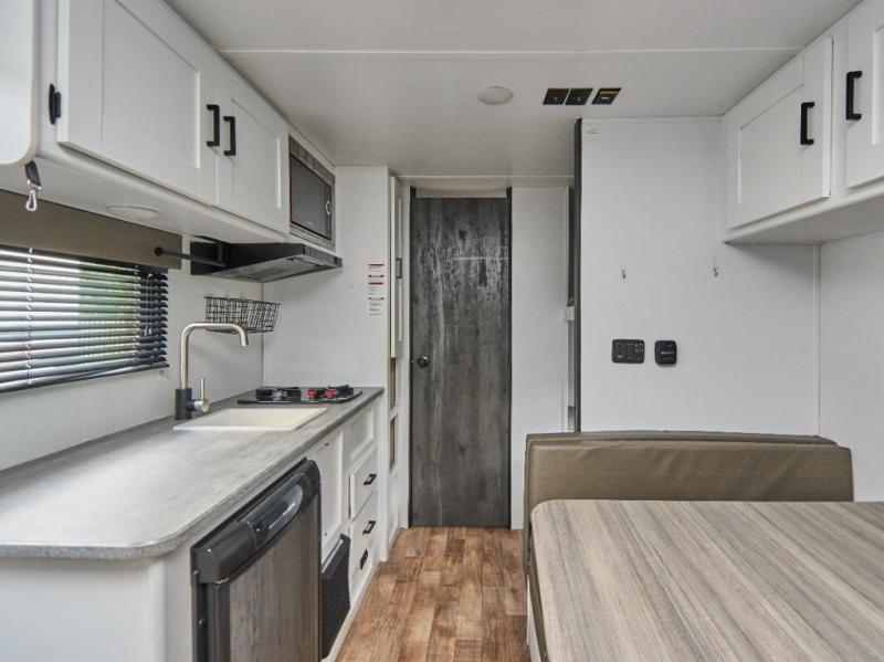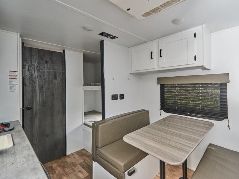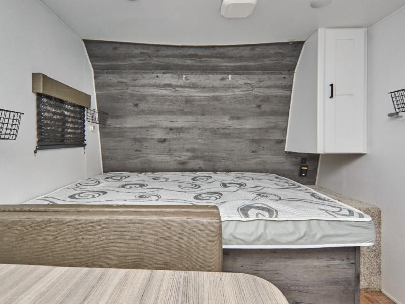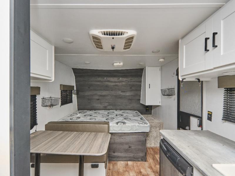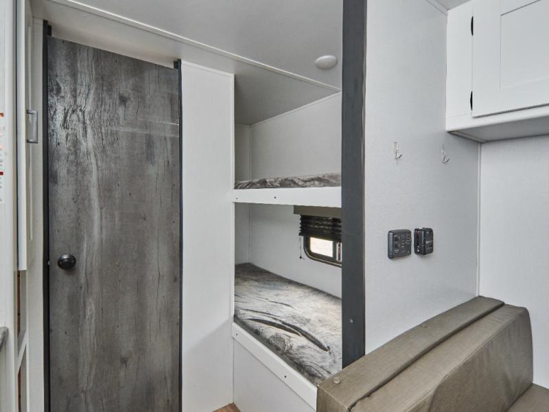Perfect for small families or weekend getaways, the Keystone Hideout 175BH offers smart design and comfortable sleeping arrangements in a lightweight, easy-to-tow package. The queen-size bed provides a cozy retreat for parents, while the 30" x 74" bunk beds and convertible booth dinette offer flexible sleeping space for kids or guests.