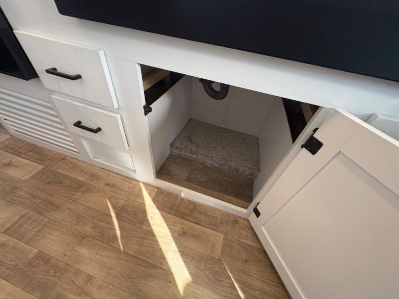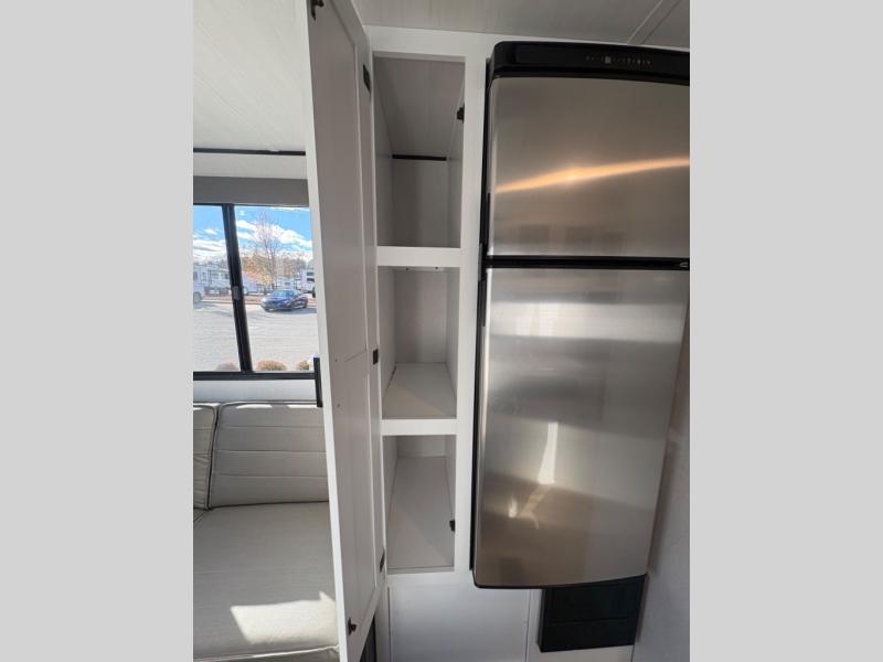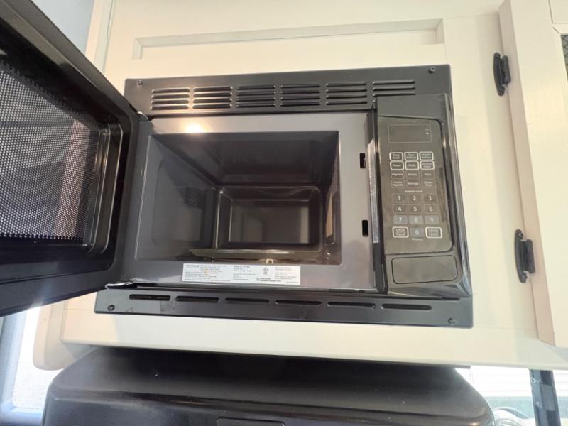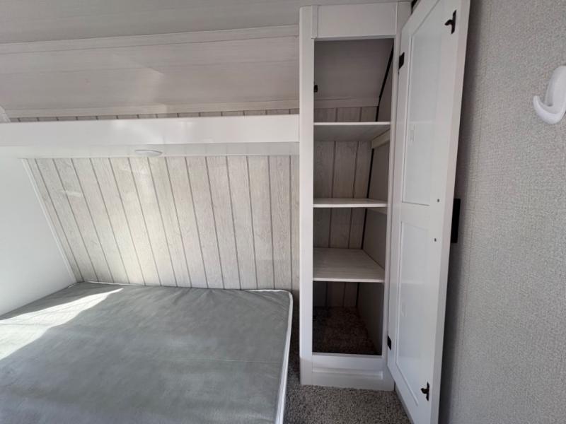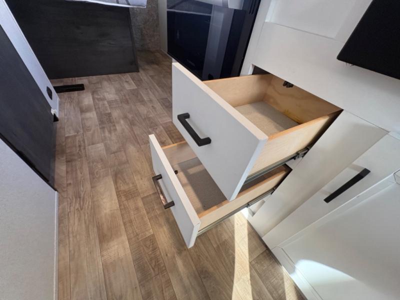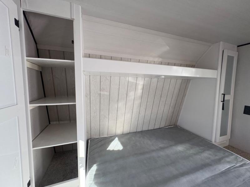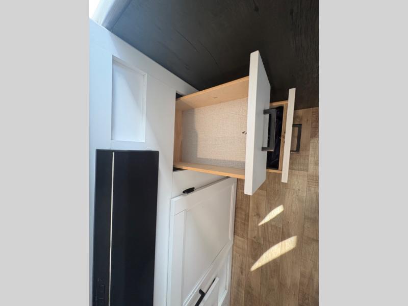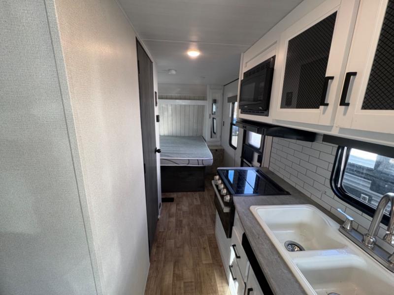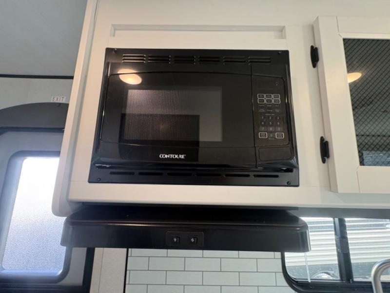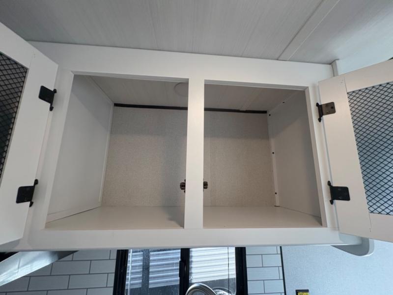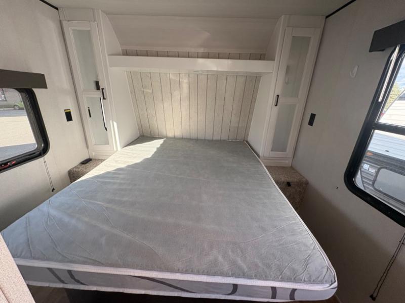 The kitchen is thoughtfully equipped with everything you need for easy, enjoyable meal prep. With a two-burner cooktop, microwave, refrigerator, generous counter space, and well-placed storage cabinets, you can cook your favorites whether you’re deep in the mountains or relaxing by the lake. Moving toward the front, you’ll find a comfortable queen-size bed, wardrobe storage, and nightstands that make settling in for the night feel effortless.