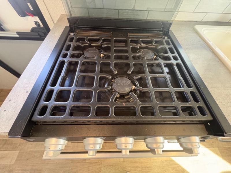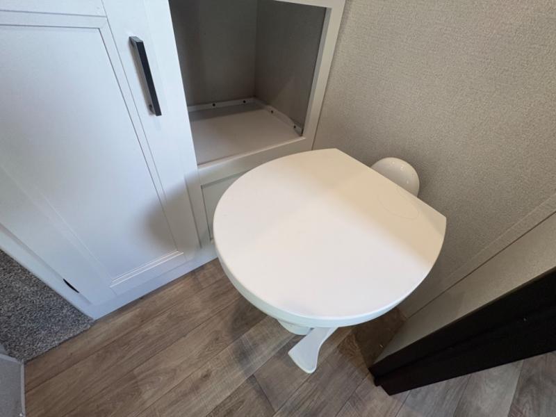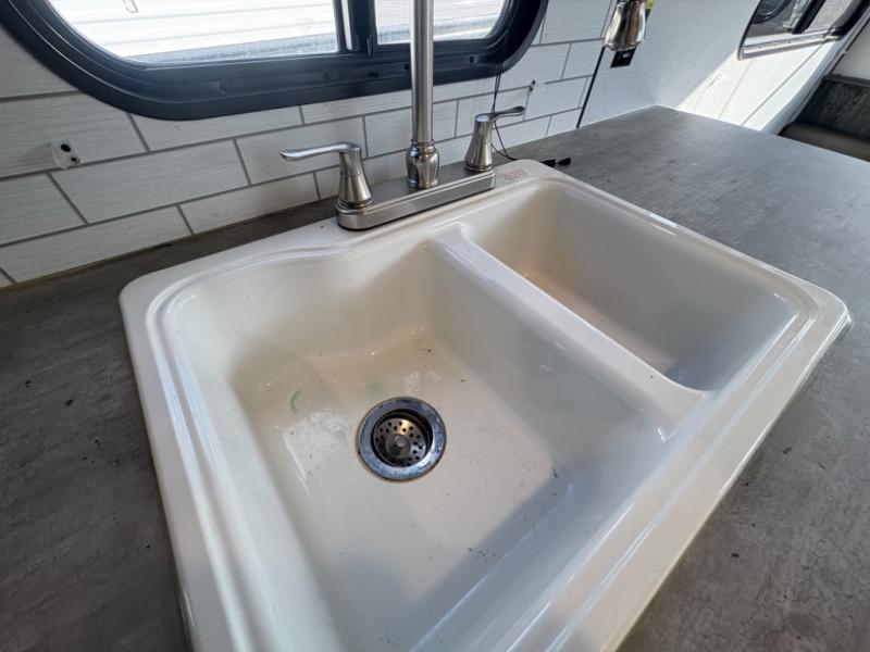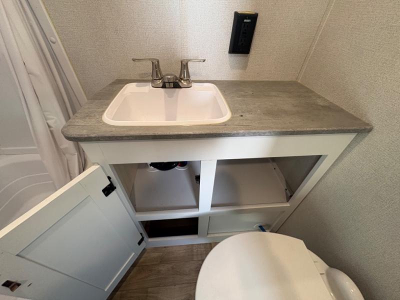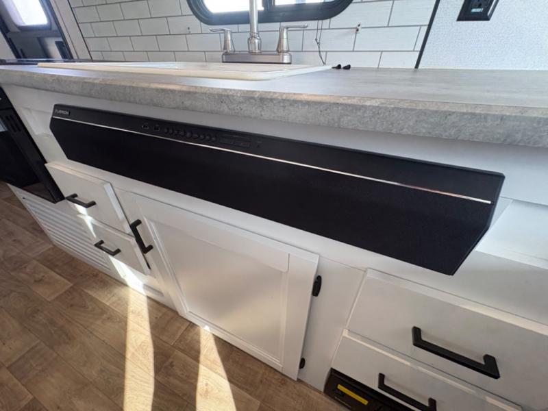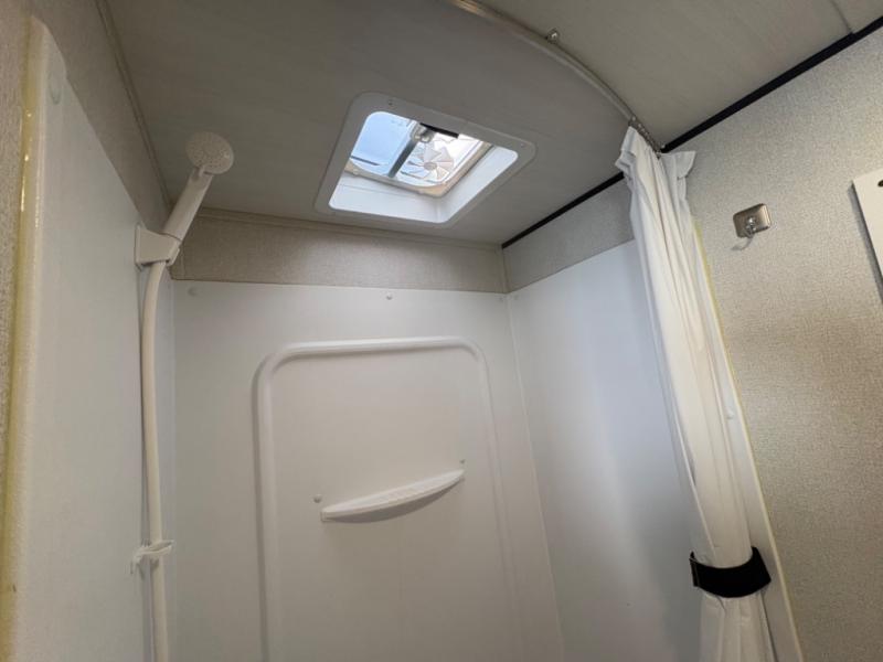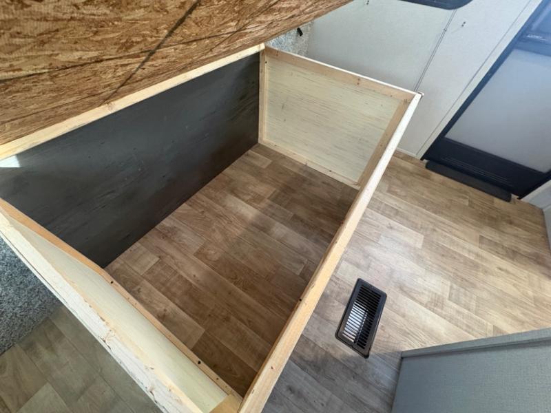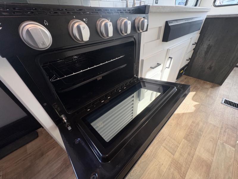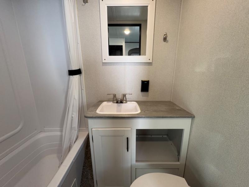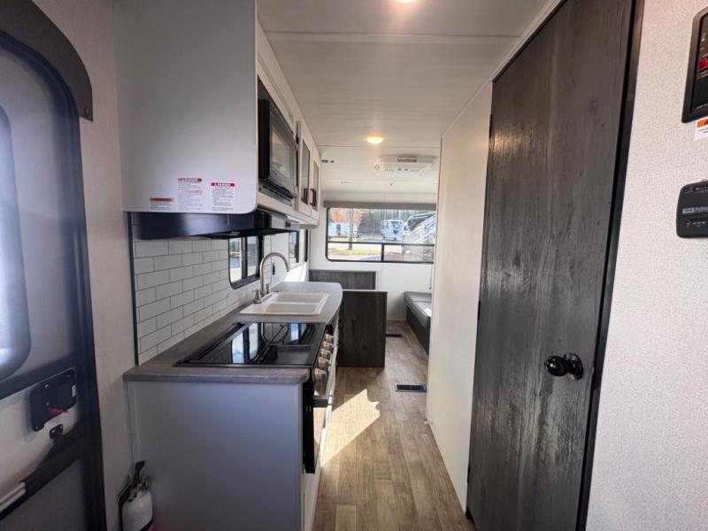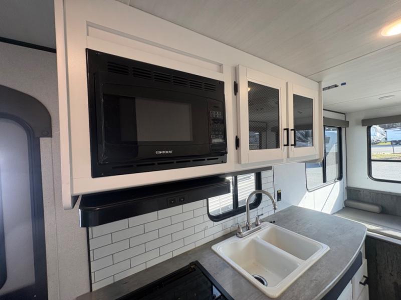 The kitchen is thoughtfully equipped with everything you need for easy, enjoyable meal prep. With a two-burner cooktop, microwave, refrigerator, generous counter space, and well-placed storage cabinets, you can cook your favorites whether you’re deep in the mountains or relaxing by the lake. Moving toward the front, you’ll find a comfortable queen-size bed, wardrobe storage, and nightstands that make settling in for the night feel effortless.